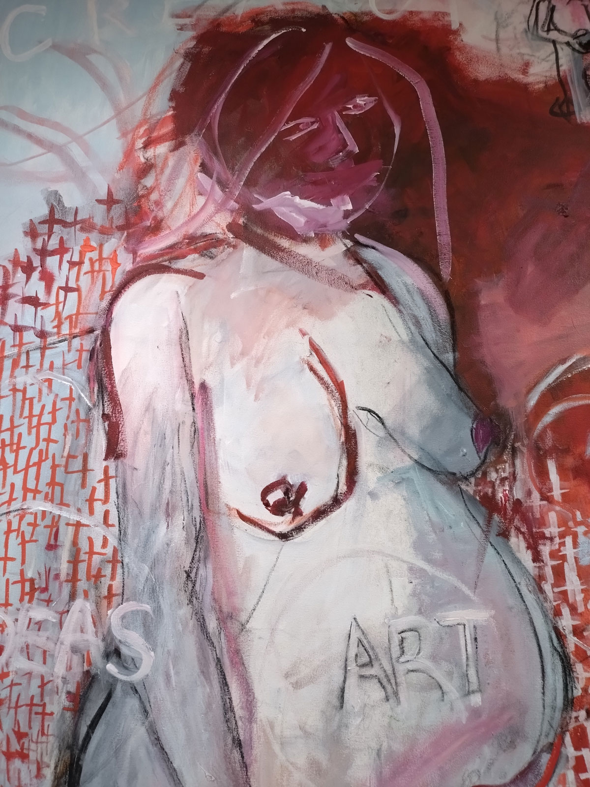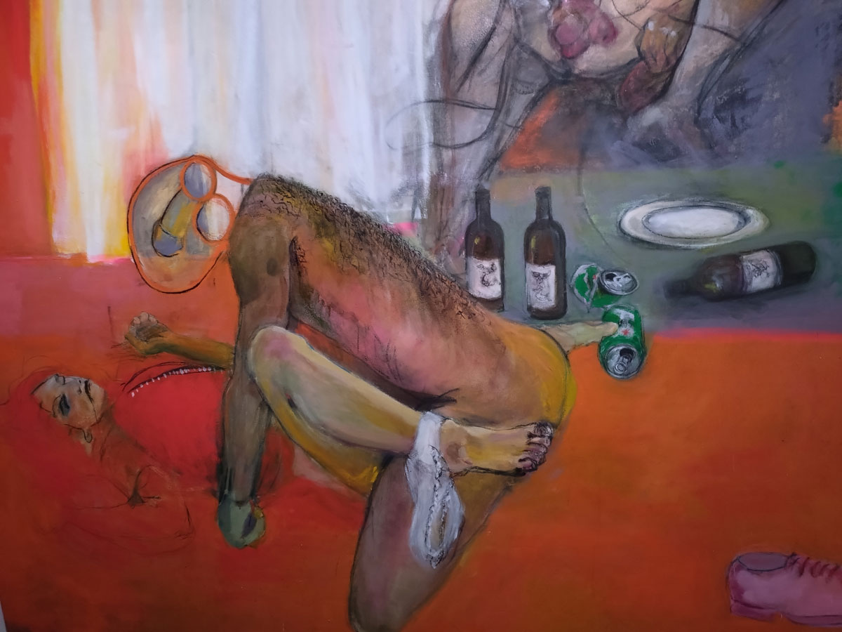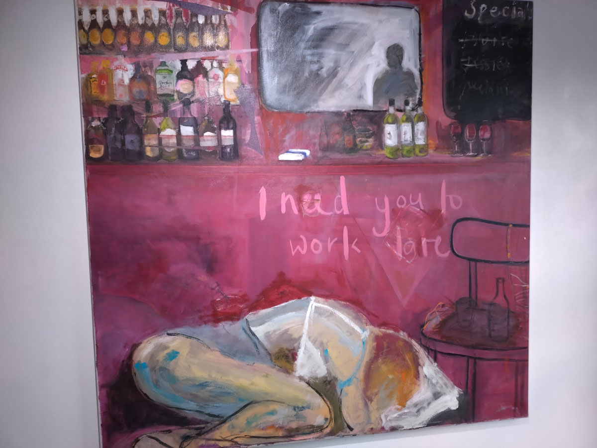 Wanted to catch this one at a quiet time rather than during all the noise of the opening, wanted to walk in without any advance warning or bites of social media imagery, kind of expected something powerful and wow! Gina Birch has been very very busy since that last show here in the same gallery back in October 2022, This is immediate, this is bigger, bolder, her work as a painter has always been strong, always been challenging, always been forthright, it has always been exciting, right back to those wonderful shoe paintings that she showed at the back of a Hackney junk shop a dozen or so years ago and yes her paintings do look like the work of a Raincoat – the way we look at Gina Birch’s paintings can’t help but be informed by what we already know from her music and really there is no real divide here between the strident painter and the respected punk rock musician. But but but, there’s something more here and this 2023 Gallery 46 show feels like far more than her rather good 2022 show. Is she a more confident painter now? Is she happier to commit more to large canvases? Is there more being said? Revealed? Is happier the right term, not happier, not more confident, maybe more knowing, maybe a little more comfortable in her painting boots that she may have previously been and no, these don’t feel like happy paintings, they do feel like positive paintings though, cathartic maybe? They do feel like honest paintings, autobiographical? Nothing is ever too obvious, do like the twists and the turns, do like this show even more that last time, yes! Strange thing to say but I feel good oh her behalf!