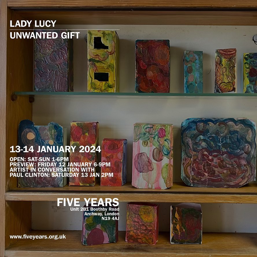 Five Years is at unit 2B, 1 Boothby Road, Archway, London N194AJ. The gallery is open Sat/Sun 13th/14th January 12 – 6pm. Lady Lucy is in conversation with Paul Clinton on Saturday 13th Jan at 2pm