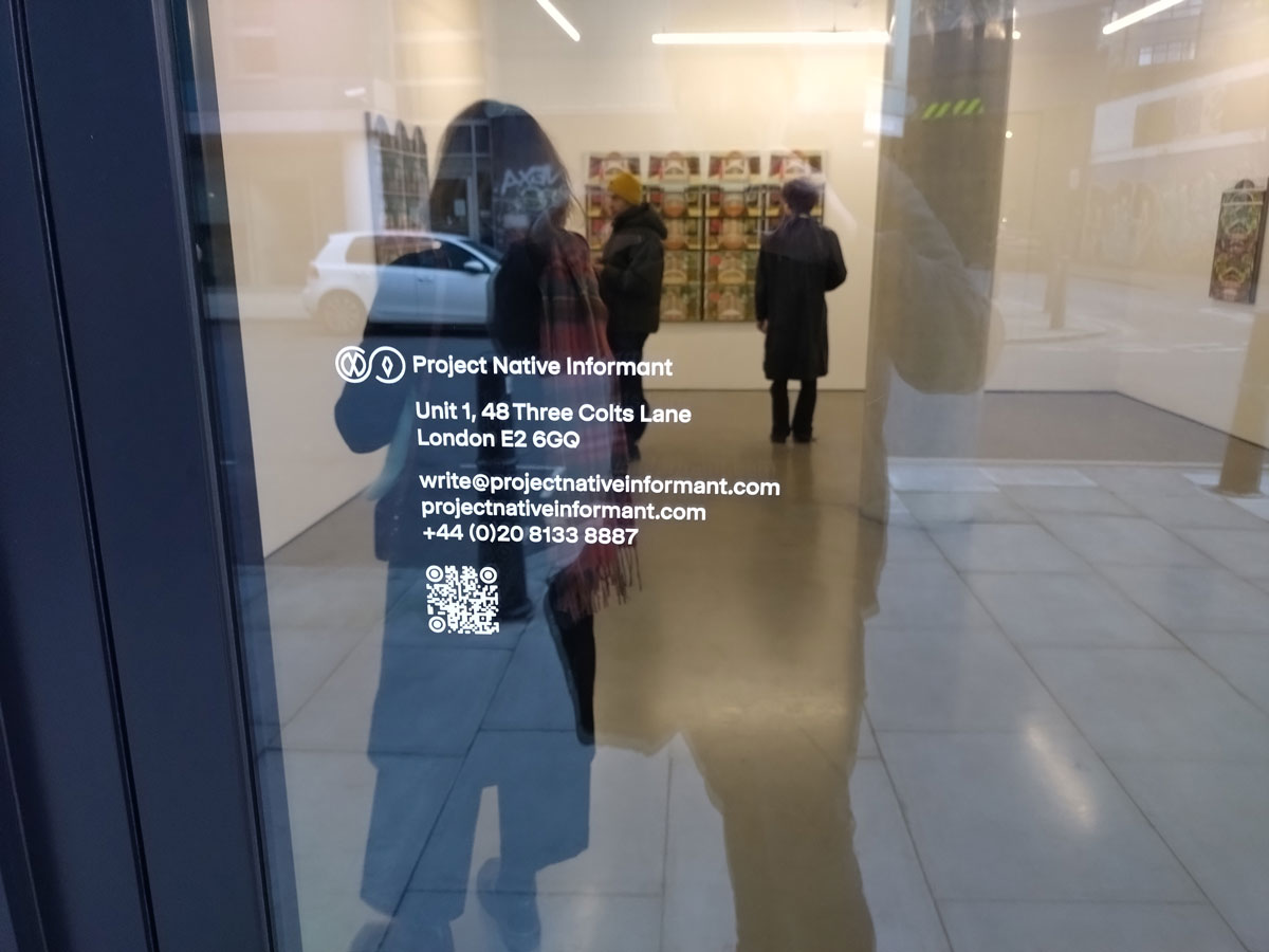 Project Native Informant is found at Units 1 and 3, 48 Three Colts Lane, London E2 6GQ, Right at the end of Herald Street and the gallery of the same name, you’ve actually got a number of galleries clustered together there now. Opening hours, Wednesday – Saturday Midday until 6pm. The Michael Andrew Page exhibition runs until February 17th