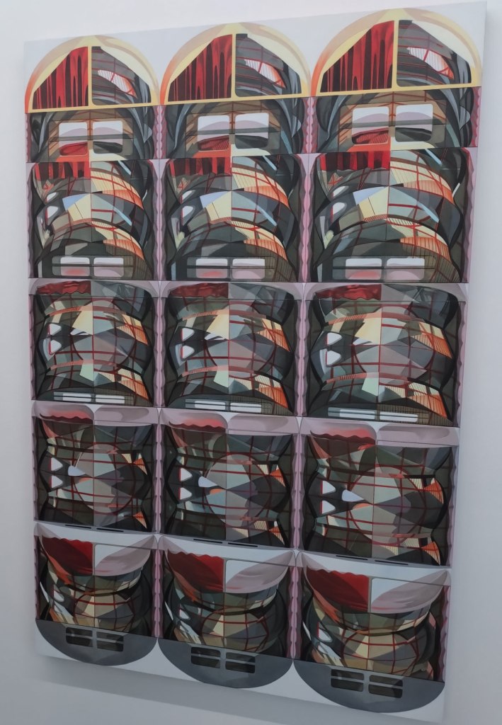 It isn’t really about the technique or the process, I mean it probably is to the artist, but do we really care how he got to the point where the work was ready to hang on the walls? Surely it is all about the (intriguing) results actually hanging in the very white very clean rather cold clinical walls of the recently opened space? Michael Andrew Page is using architecture as a means to explore abstraction, and if you really want to know then apparently he “painstakingly transcribes architectonic components typical of found bivvy structures into the architectural software programme CAD. These are then multiplied and manipulated to produce a 3D model, which forms the basis for his compositions. The initial image is transferred from CAD to canvas via the photographic method of cyanotype, after which, Page adds layers upon layers of oil paint in a slow meditative process, a monastic reverie if you will” – I really don’t need or want to know any of that, I don’t really care about the software he used, I really really don’t! What I do care about is the art on the wall and yes, maybe after a dozen or so galleries and the annoyance of Condo and the rest of it I might have be grasping at straws, but Page’s art really was intriguing (intriguing enough to make me go back and check before commiting anything to paper or in this case confounded computer screen)