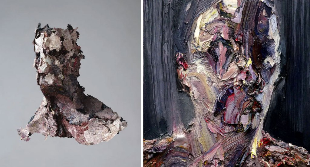 These meditations are meshed into the fabric of each of the thirty-plus artworks that have been brought together for this show, and in the case of the oil sculptures almost literally. The presentation is not only brave in its undertaking, but also experimental in its execution.