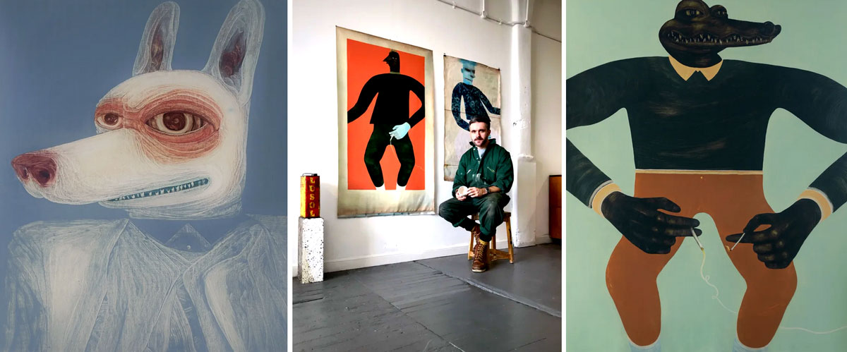 Dogs, deities, and rabbits are recurrent motifs of this collection, speaking to the artist’s interest in folklore, mythology, and ancient Egyptian gods. The artist frequently tries to depict animalistic traits in his characters, drawing profound parallels between man and beast within his work. Despite their menacing first impression, Swan’s subjects are creatures of human depth and emotion that, like Glasgow, need patience and time to be understood”.