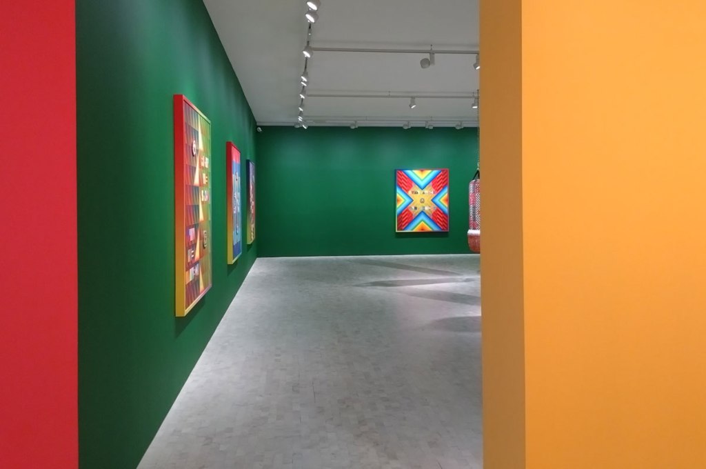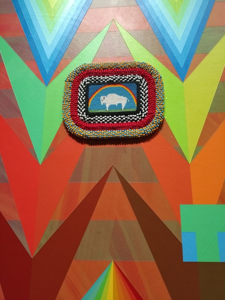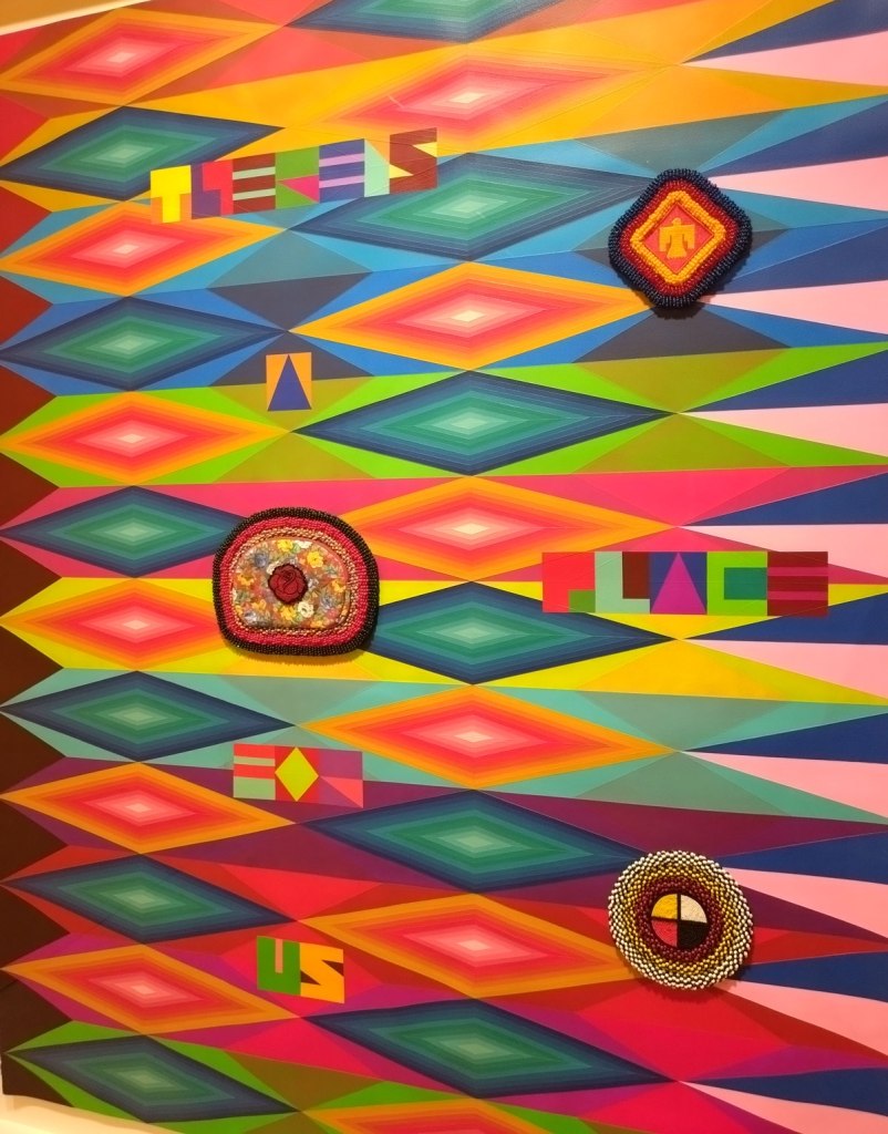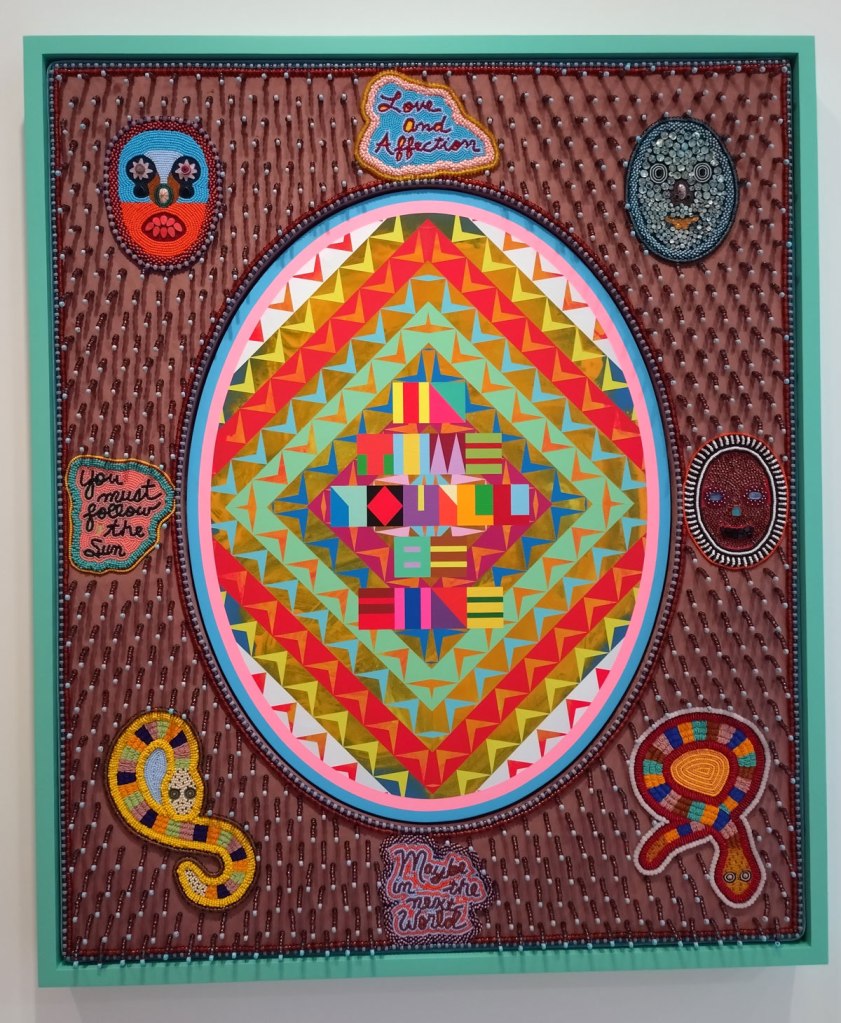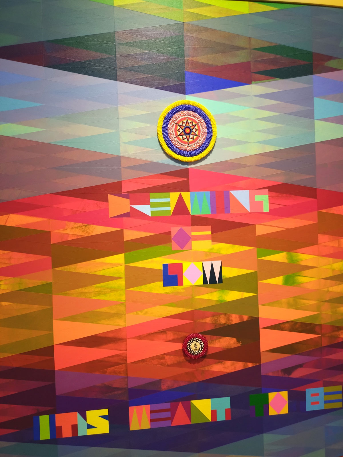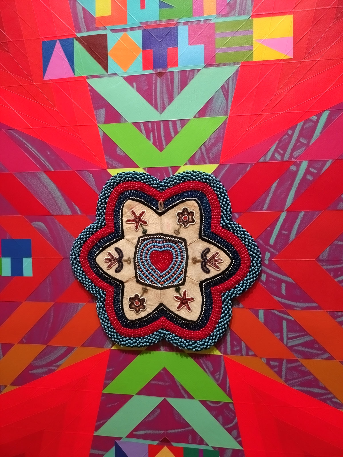The artist’s first exhibition at the gallery celebrates the breadth of his multi-faceted practice, which is characterised by vibrant colour and pattern. Gibson is renowned for his use of geometric abstraction, inspired by North American Indigenous aesthetics and craft. Combining artisanal beadwork, leatherwork and quilting with narratives of contemporary resistance, the artist harnesses the power of material to activate overlooked narratives, while embracing the presence of historically marginalised identities”.