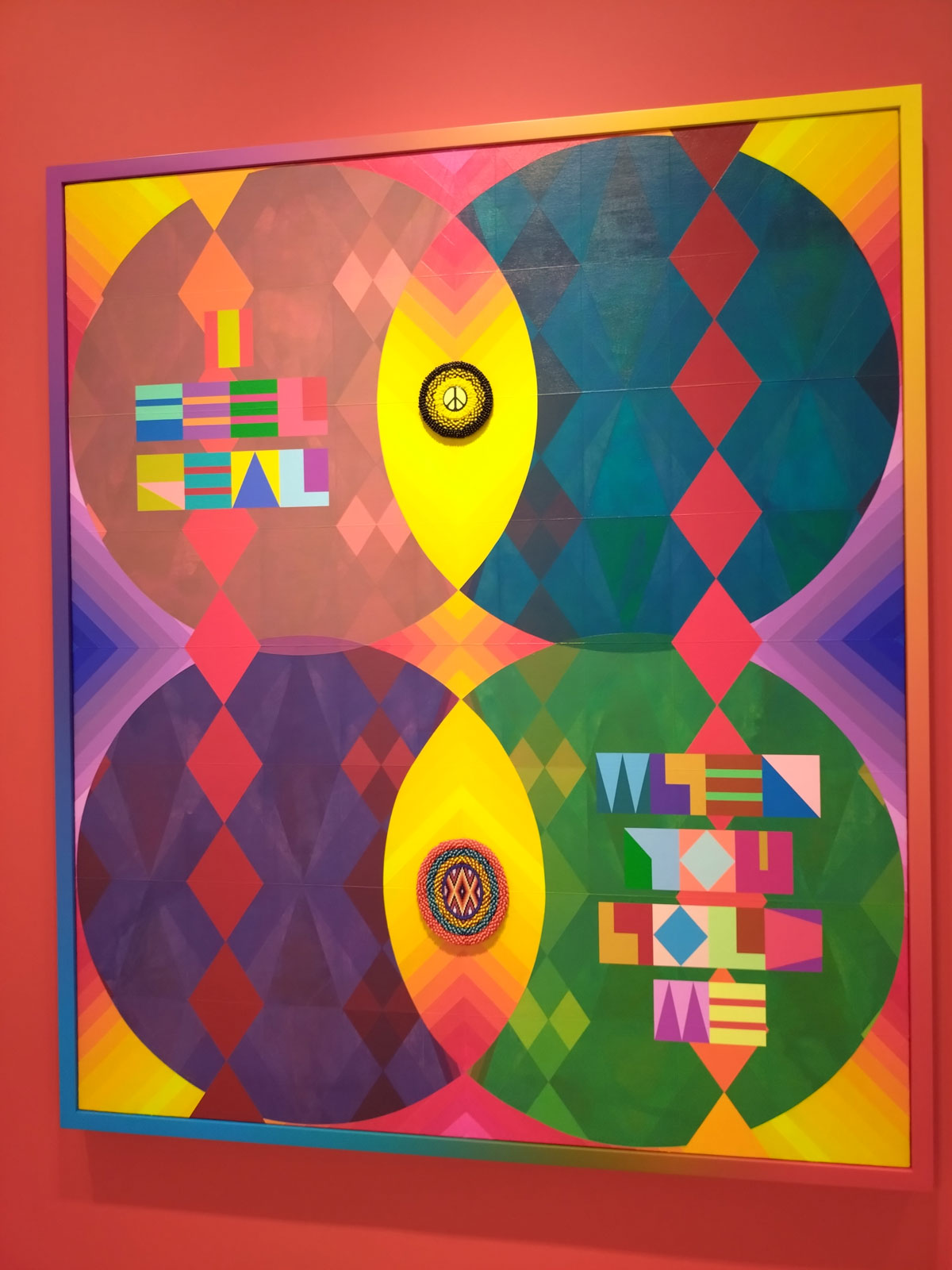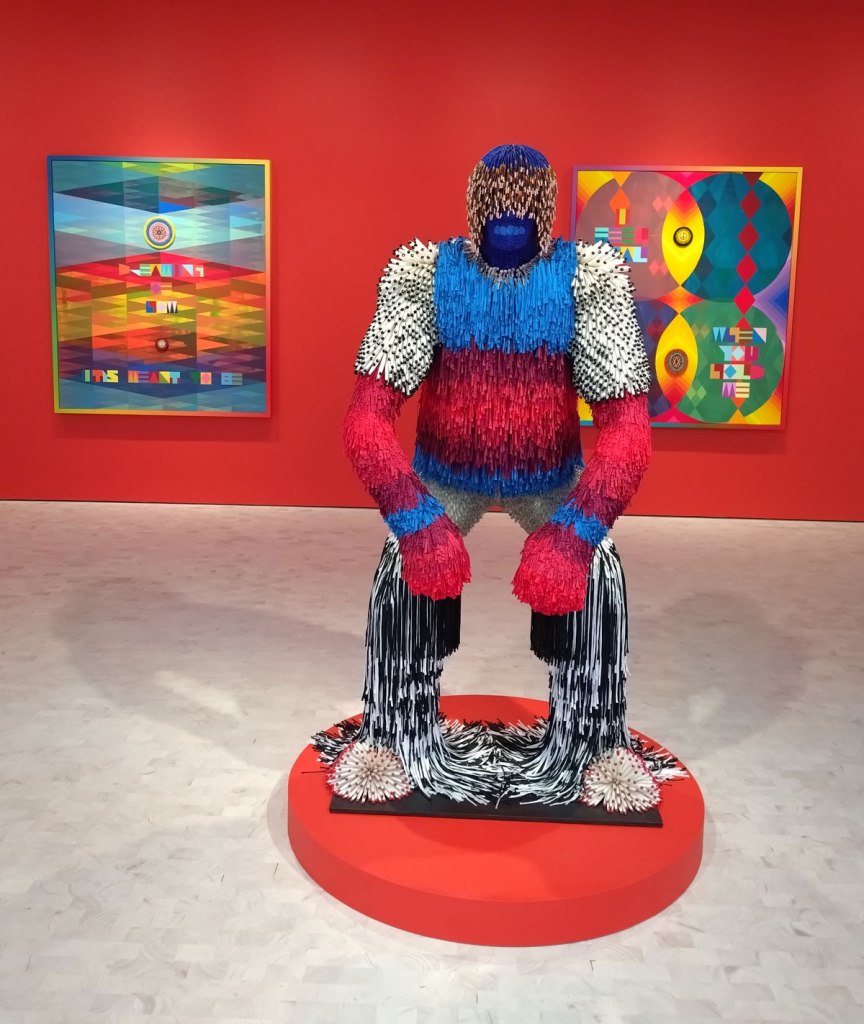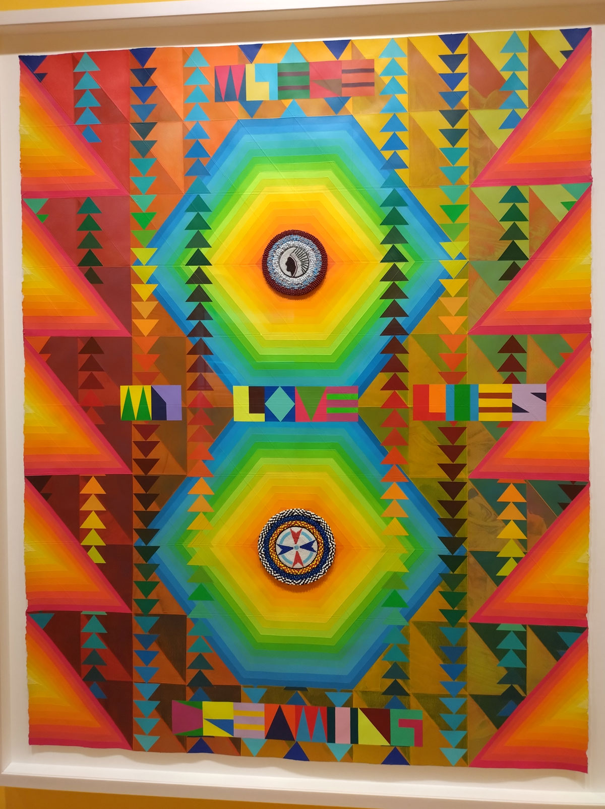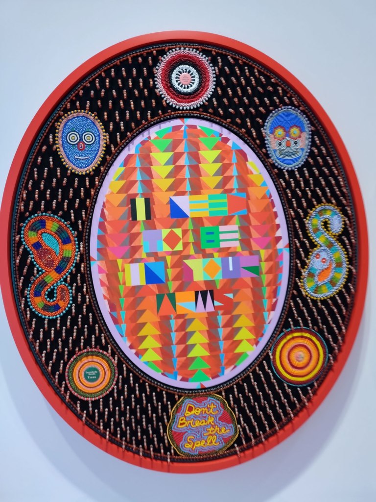 Jeffrey Gibson’s new “hyper-visible mixed media works” are wonderful, his gestures, his bold colours, his lines. How deep it all is is open to question, is it all about the surface, the joy, the hit?  it certainly is a big hit, a proper pop art explosion of emotion, of joy, of goodness, of the now and yes I am that art magpie, it is about that brightly coloured surface but there is more, and the more is the vital thing here and yes, I should have got here weeks ago and said all this while the show was still on and there never is enough time to paint and write and juggle and hustle and those red bats on the Elizabeth Line and eyes and you know the scores (and the need to paint blue doors). Okay, admit, that bad Indian Greg did enter my head a couple of times, I suspect Greg and Jeffrey would love each other, they probably do already.
