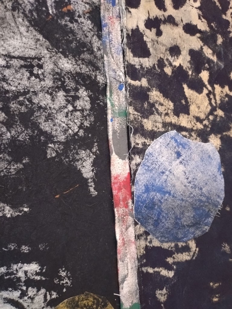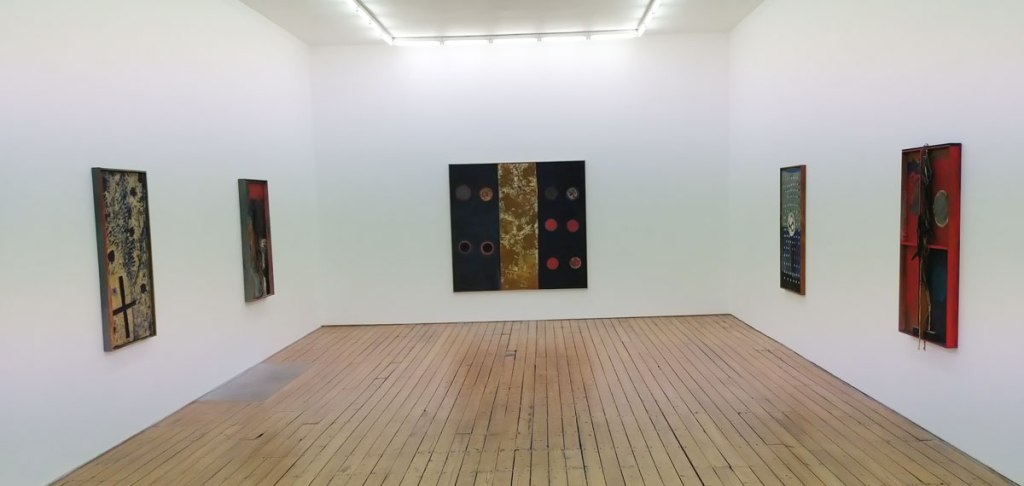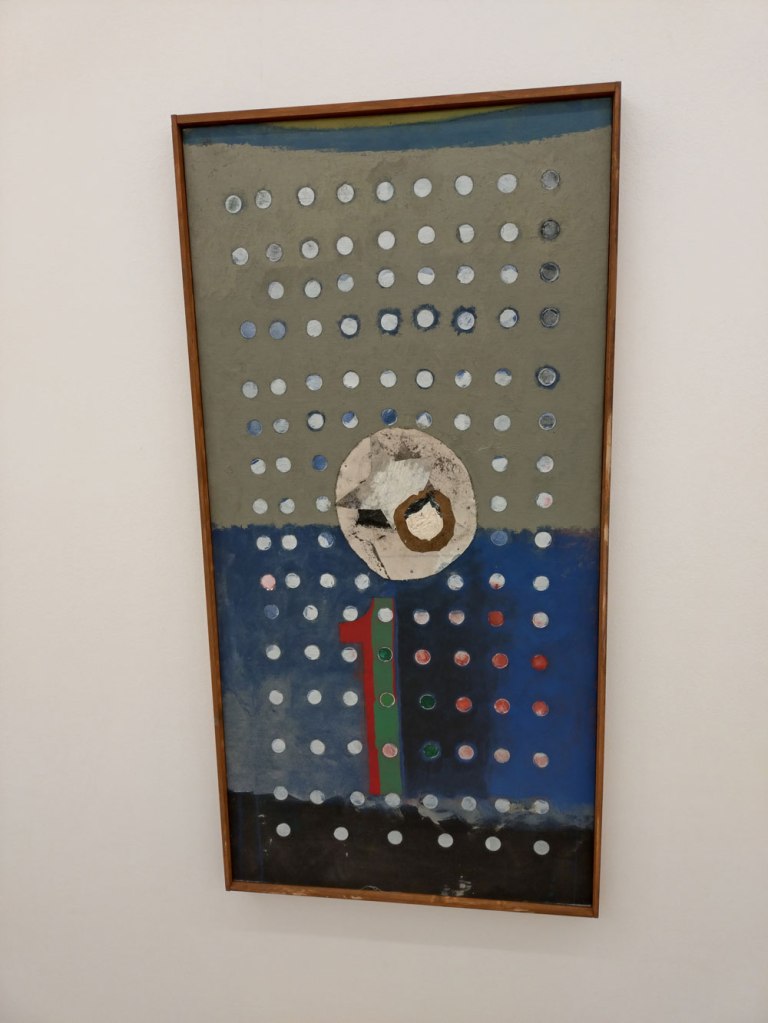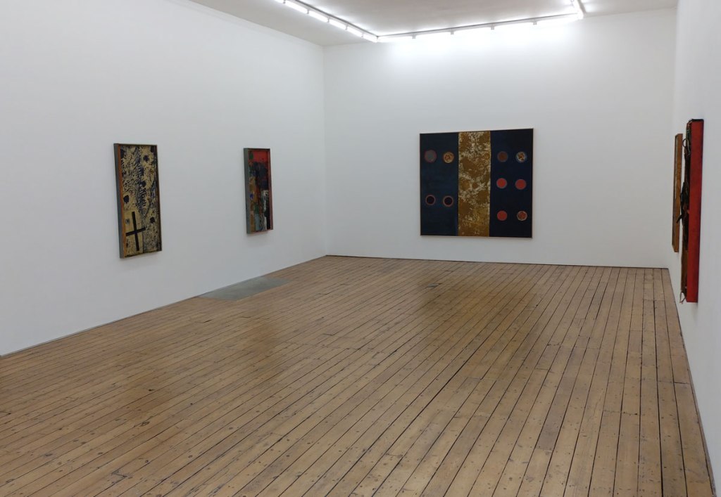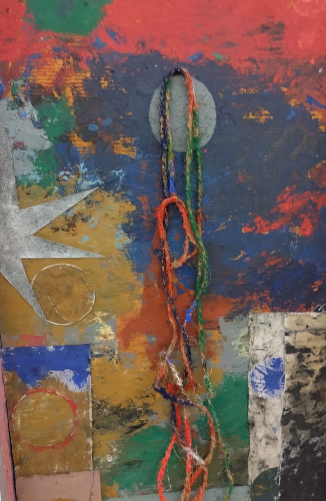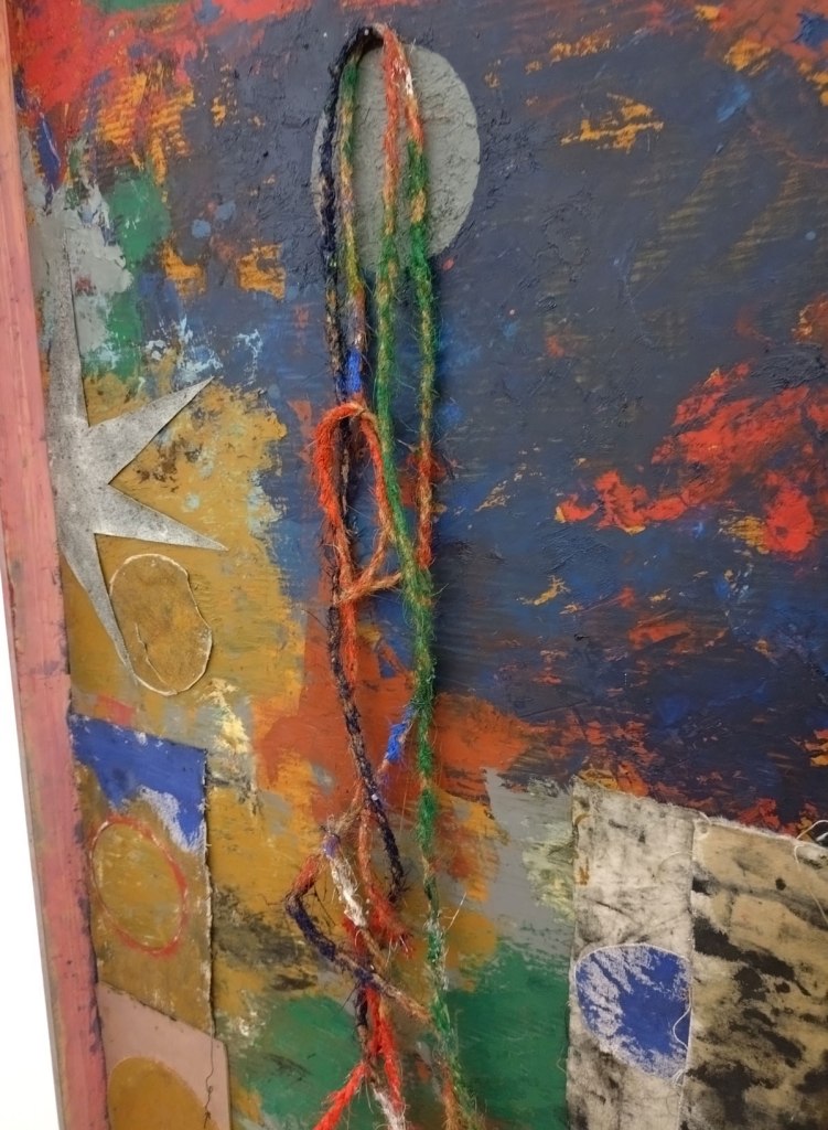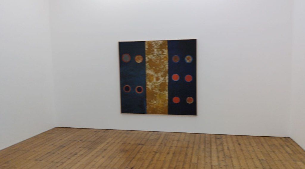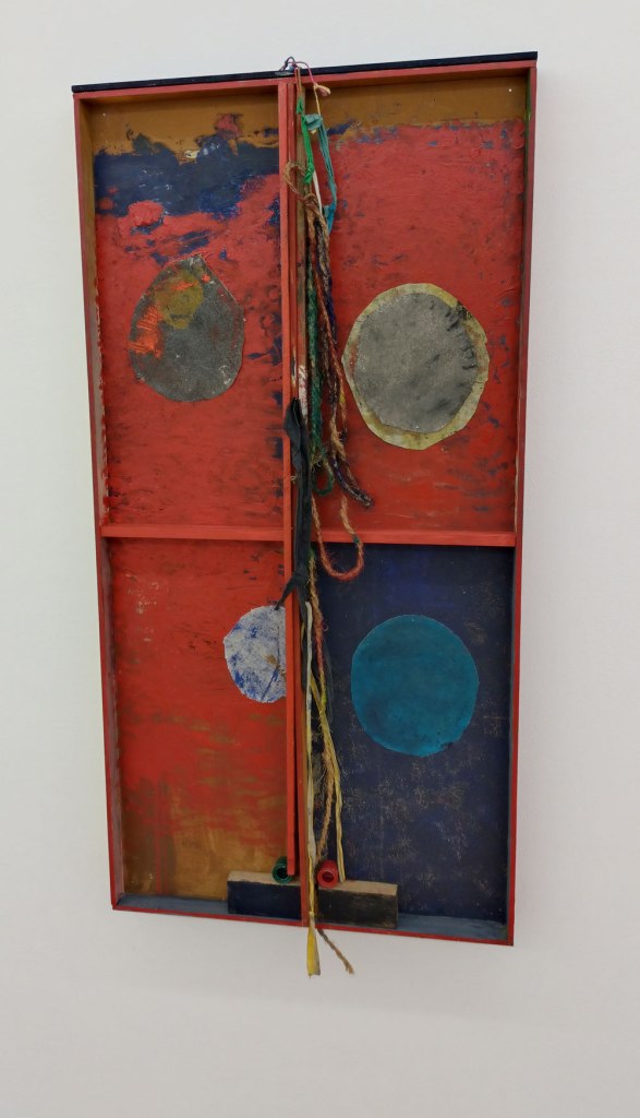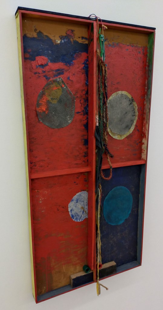 You are kind of lost in the actual paint, the actual rope, the actual colour, you don’t really notice the triptych(s), the repeated format, the canvases vertically divided into three, or the three pieces talking to each other, and yes I guess there is a sense of doors or divides or indeed horseboxes. You are kind or preoccupied, the motifs, the margins, why are those numbers there? And the colour, the use of colour holds you, that and the tactile sense and the urgent need to touch – I didn’t, I really wanted to – windows, wooded trays, moons, stars, the collaged elements, the surface disrupted, the cut outs, the reliefs, the relief of it all. Are they portals, are they meant to be read as portals? Am I reading too much? Do love the painted coils of twine, do love this show, do love the way it engages, it is so so handmade, it is beautifully tactile, I really really need to touch these pieces, this is incredibly powerful, not demanding, not shouting at you, not commanding, powerful though and yes you do need to see this one in real life.