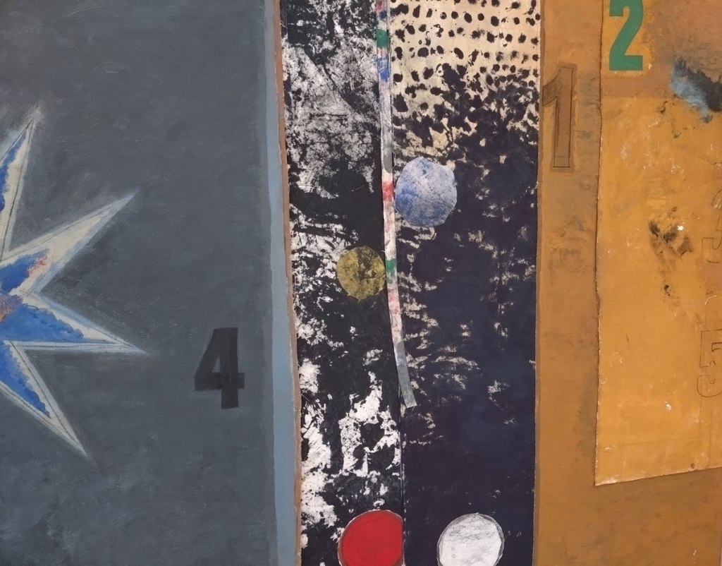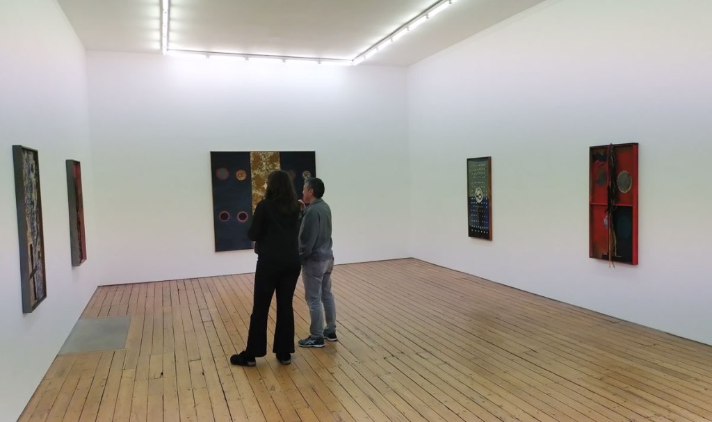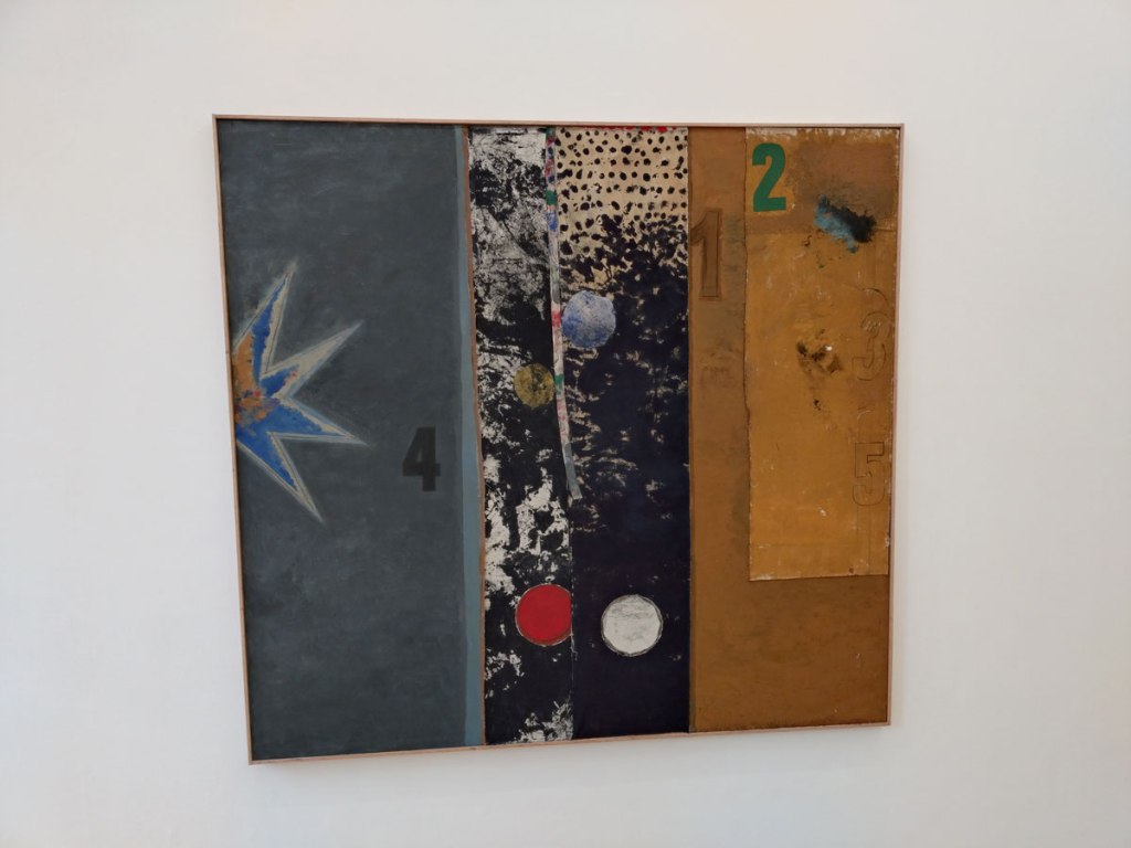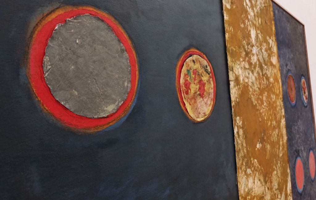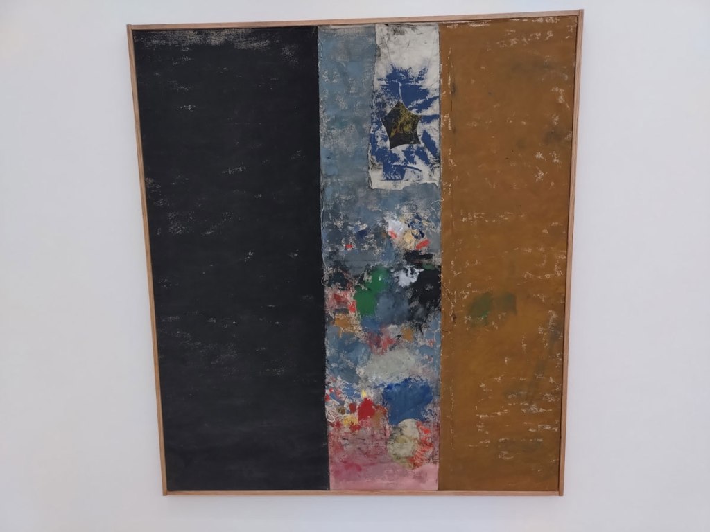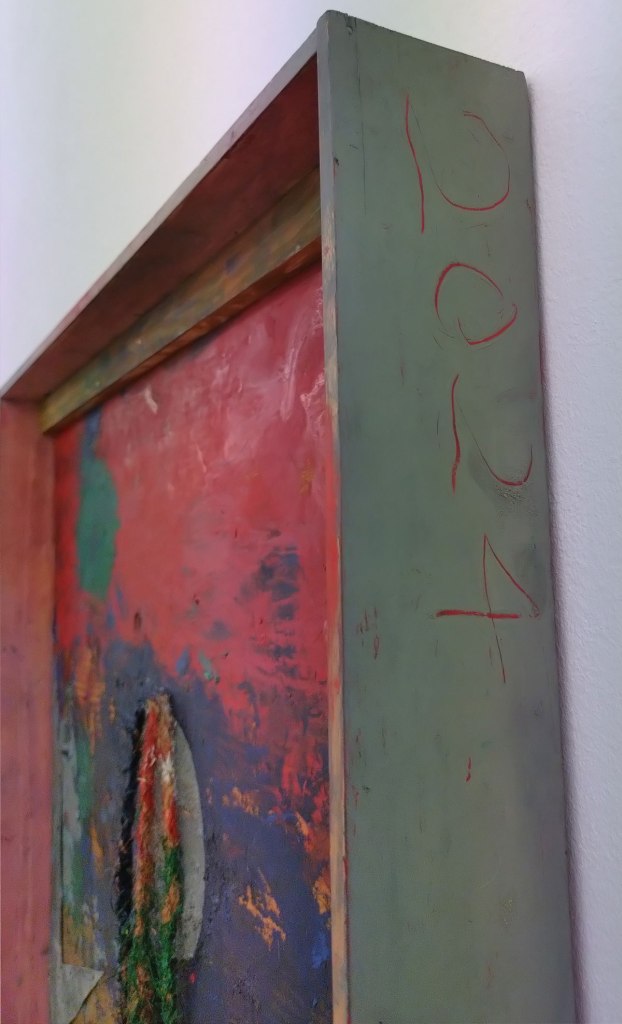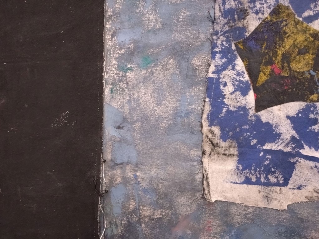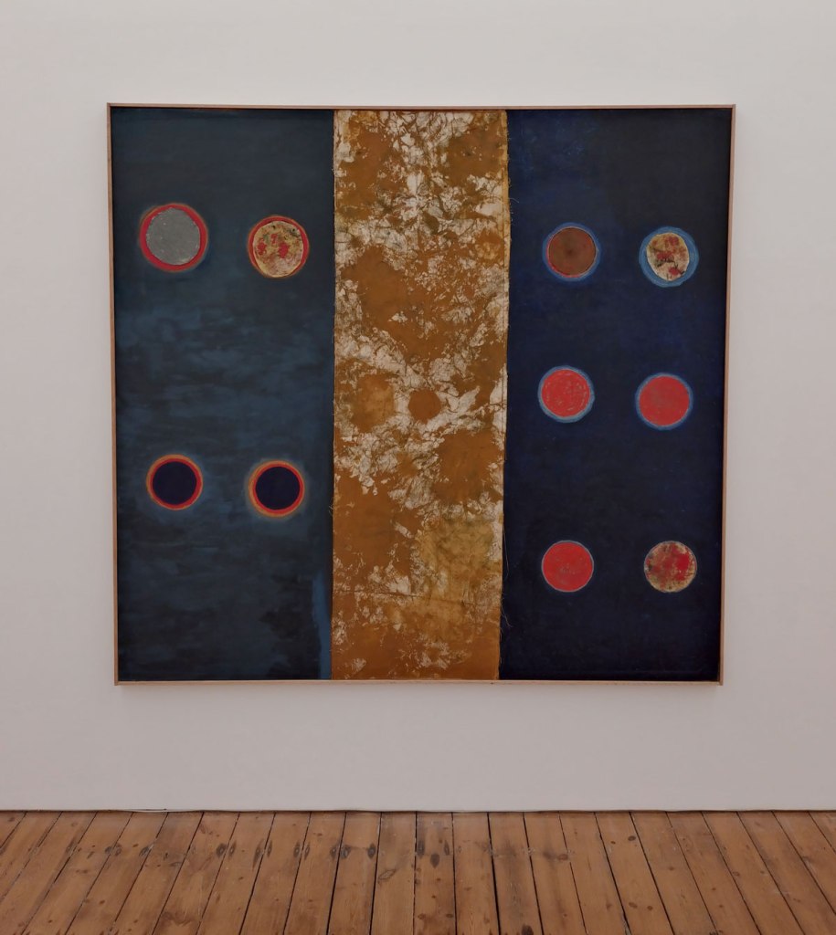 You are kind of lost in the actual paint, the actual rope, the actual colour, you don’t really notice the triptych(s), the repeated format, the canvases vertically divided into three, or the three pieces talking to each other, and yes I guess there is a sense of doors or divides or indeed horseboxes. You are kind or preoccupied, the motifs, the margins, why are those numbers there? And the colour, the use of colour holds you, that and the tactile sense and the urgent need to touch – I didn’t, I really wanted to – windows, wooded trays, moons, stars, the collaged elements, the surface disrupted, the cut outs, the reliefs, the relief of it all. Are they portals, are they meant to be read as portals? Am I reading too much? Do love the painted coils of twine, do love this show, do love the way it engages, it is so so handmade, it is beautifully tactile, I really really need to touch these pieces, this is incredibly powerful, not demanding, not shouting at you, not commanding, powerful though and yes you do need to see this one in real life.