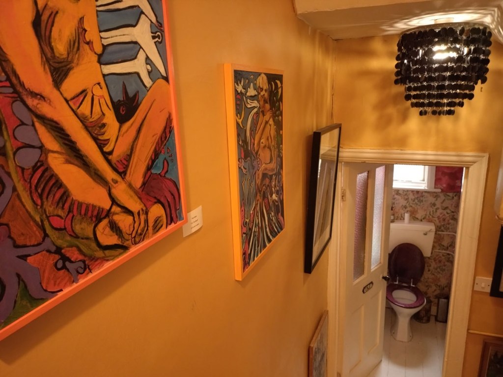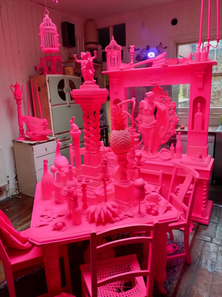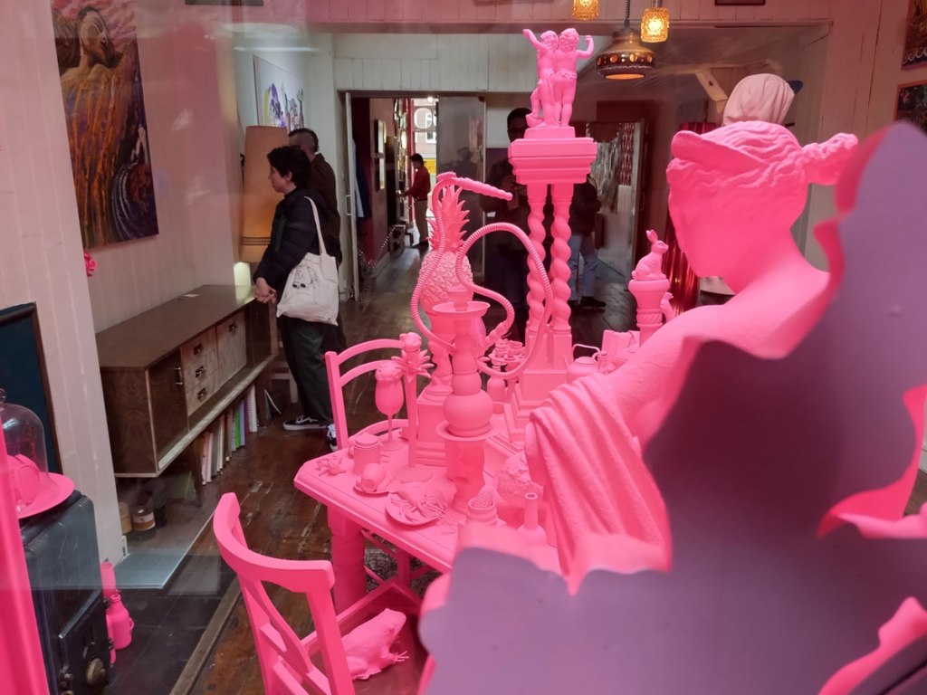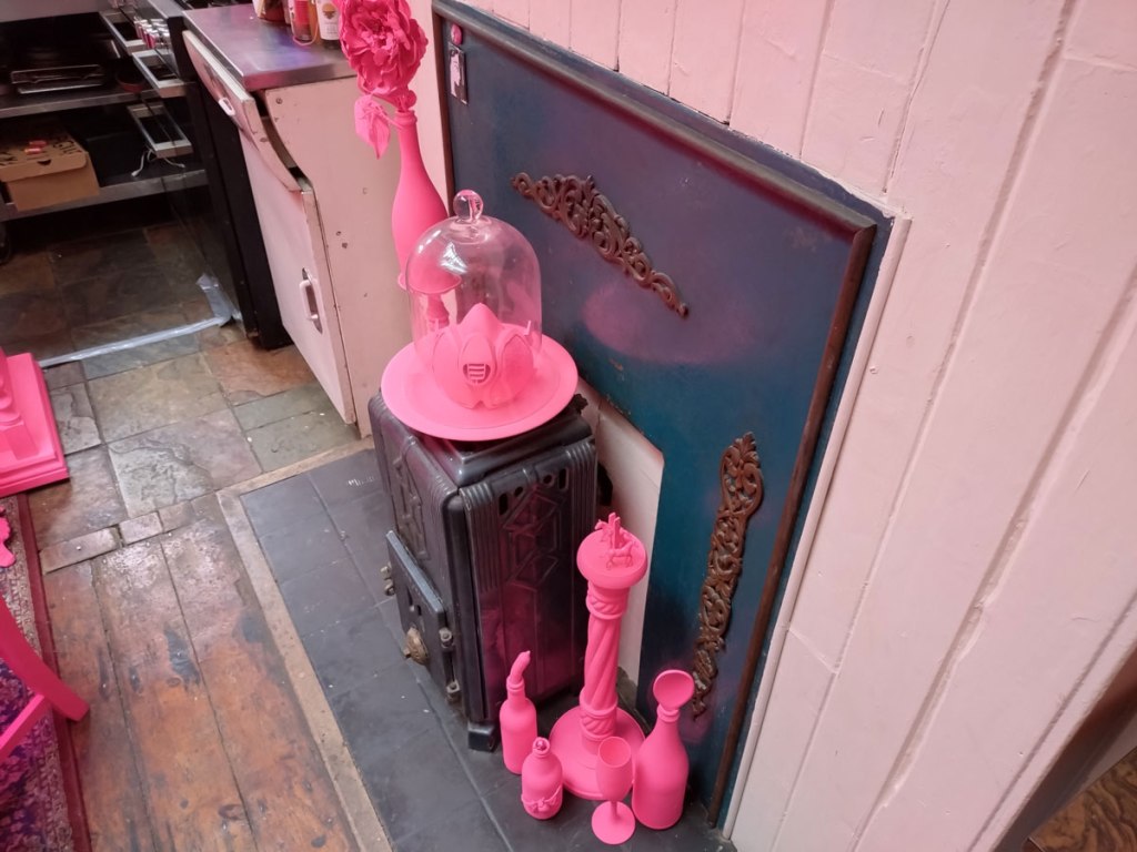 We were promised “an immersive exploration of memory through objects and spaces set within a Victorian house that was once formerly a pub until its closure in 1983”. We spied the artist line up on the window of the old pub a couple of nights ago while walking home from a gig, a Jesus and the Zealots gig if you must know, and managed to track down some information ahead of time. Alice has never been that big on communication with her fellow Hackney-based artists, we have tried a number of times. Her social media talked of “an exhibition of installations, performances and artworks in which visitors are invited to reflect on the bonds we form with people, belongings, physical spaces and environments. It aims to recreate and re-establish these bonds through our connections to the familiar and the act of imagining and reimagining narratives past and present”. No sign of any performance when we were there not long after lunch time, I guess that happened later on, what we did find was two floors of treasure, of Alice’s familiar distinctive instinctive pinkness (it was good to see it again), of all kinds of found objects that we were told “offer a window into the past, by re-contextualising objects that resonate with history into new forms and connecting with space, prompting contemplation on how our dialogue with objects evolves over time and on the profound impact of physical environments on memory and emotions. The audience is encouraged to engage with the house and the exhibition as they delve into and reflect on their own experiences and contributions to the tapestry of human connection”.