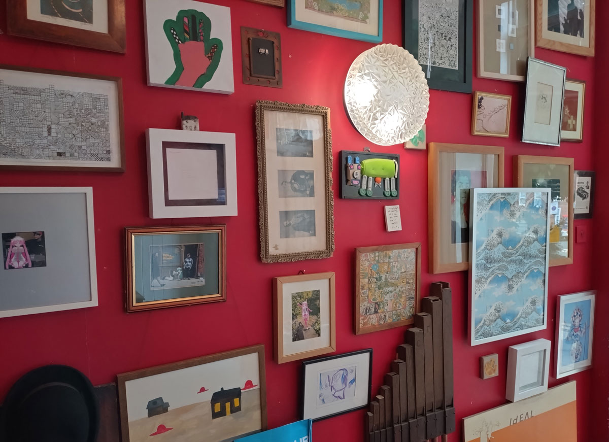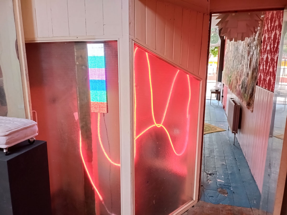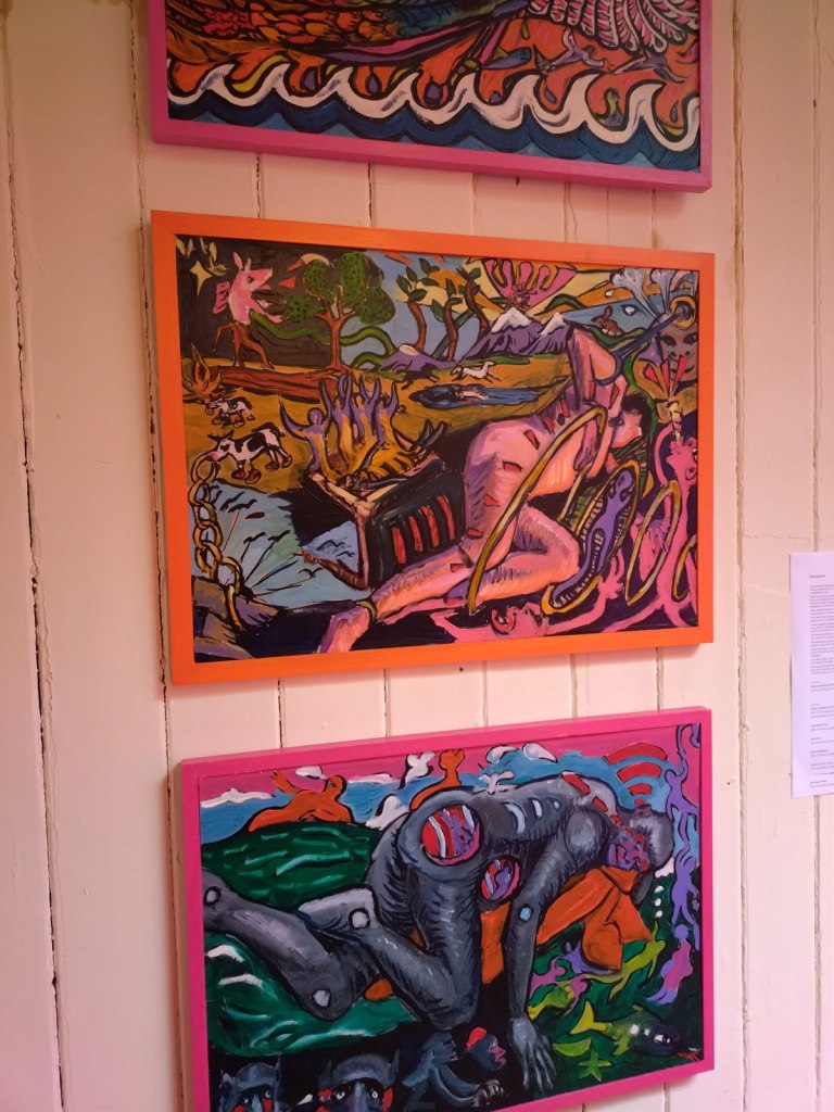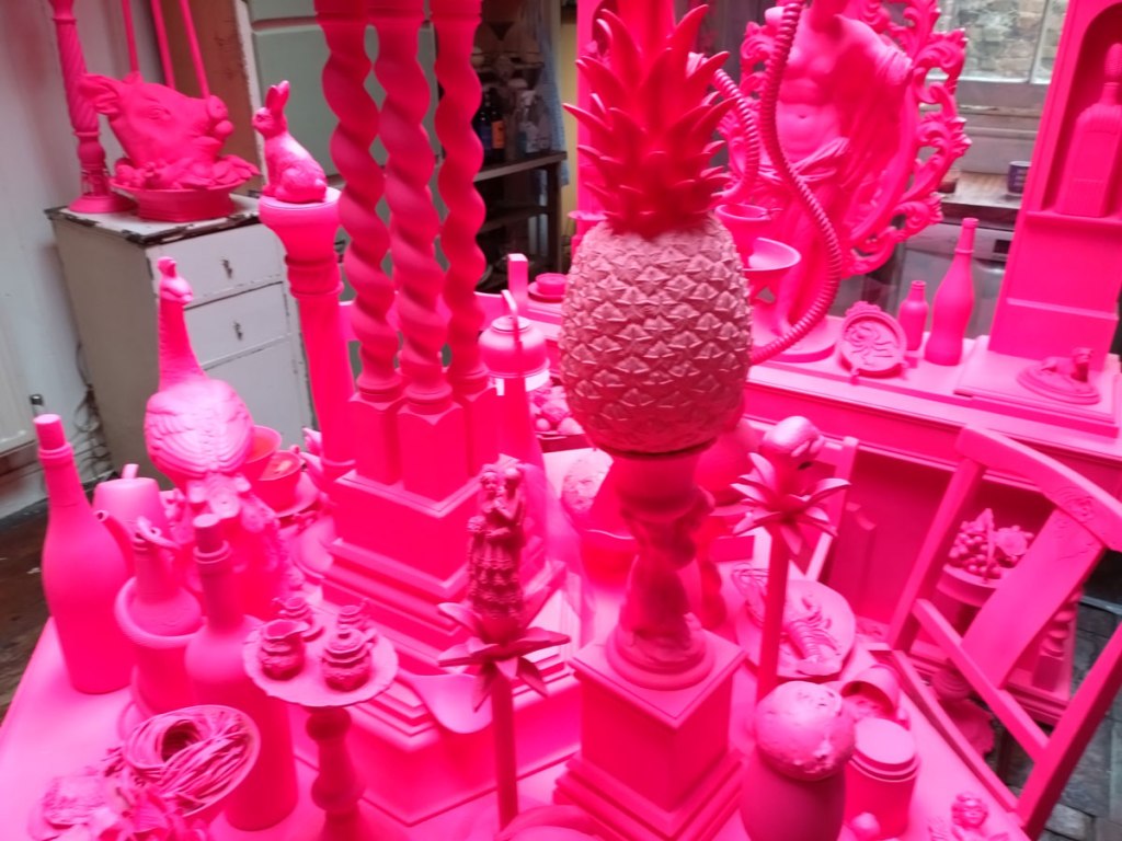 We were promised “an immersive exploration of memory through objects and spaces set within a Victorian house that was once formerly a pub until its closure in 1983”. We spied the artist line up on the window of the old pub a couple of nights ago while walking home from a gig, a Jesus and the Zealots gig if you must know, and managed to track down some information ahead of time. Alice has never been that big on communication with her fellow Hackney-based artists, we have tried a number of times. Her social media talked of “an exhibition of installations, performances and artworks in which visitors are invited to reflect on the bonds we form with people, belongings, physical spaces and environments. It aims to recreate and re-establish these bonds through our connections to the familiar and the act of imagining and reimagining narratives past and present”. No sign of any performance when we were there not long after lunch time, I guess that happened later on, what we did find was two floors of treasure, of Alice’s familiar distinctive instinctive pinkness (it was good to see it again), of all kinds of found objects that we were told “offer a window into the past, by re-contextualising objects that resonate with history into new forms and connecting with space, prompting contemplation on how our dialogue with objects evolves over time and on the profound impact of physical environments on memory and emotions. The audience is encouraged to engage with the house and the exhibition as they delve into and reflect on their own experiences and contributions to the tapestry of human connection”.