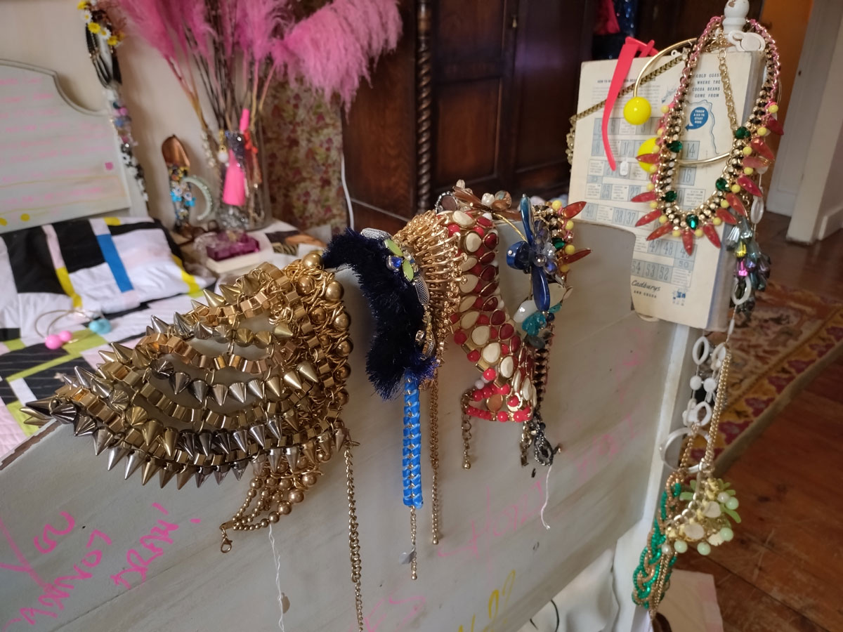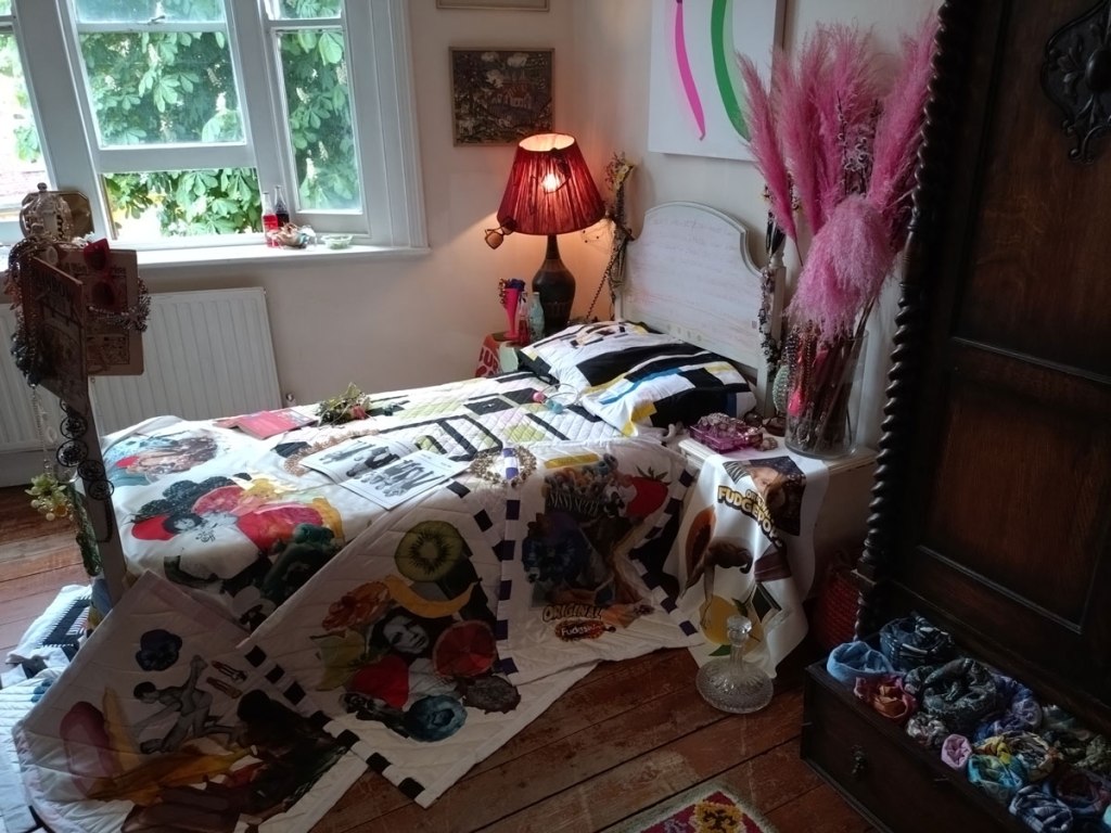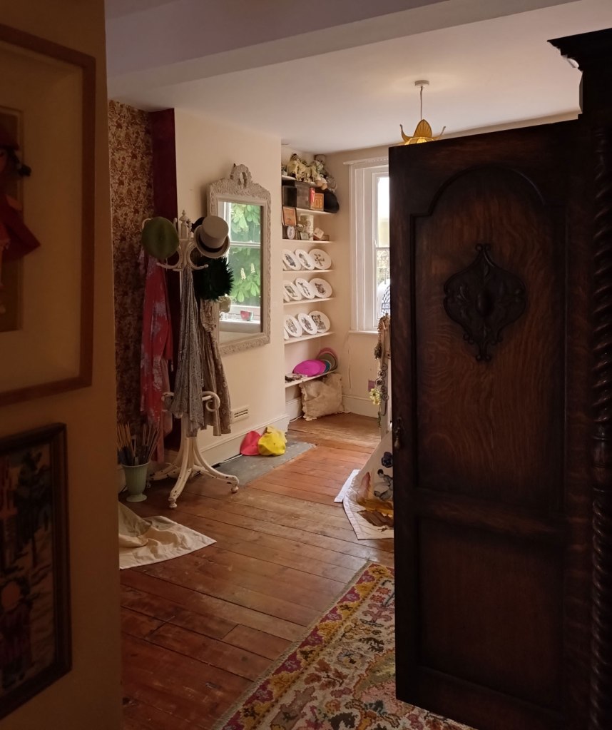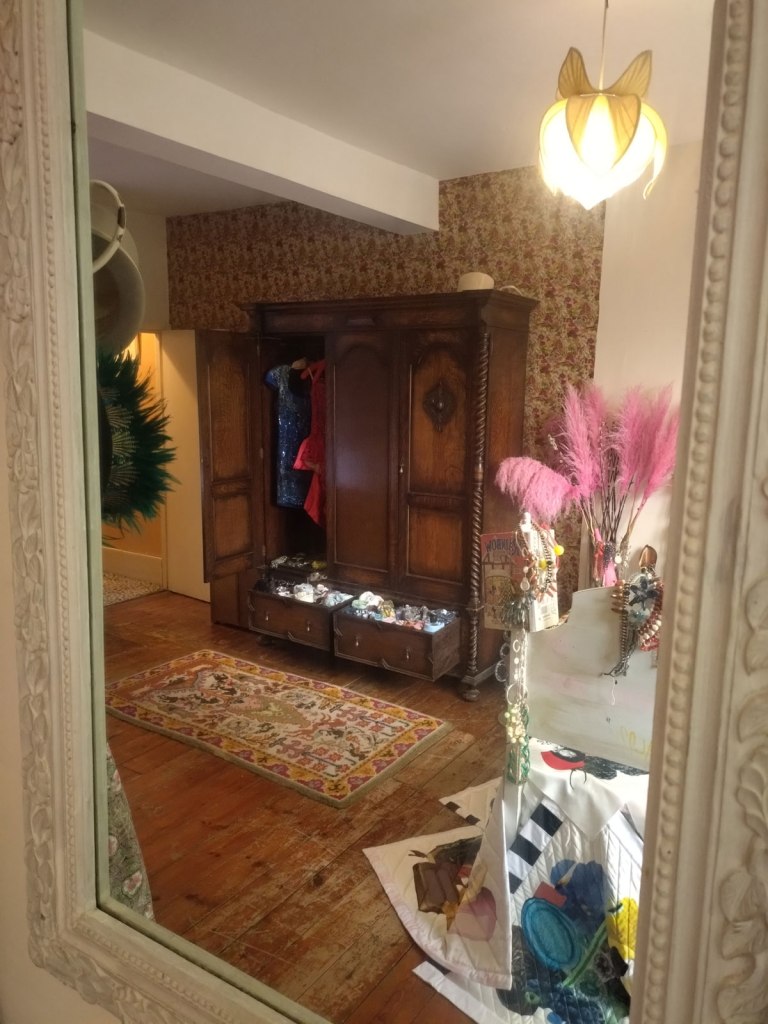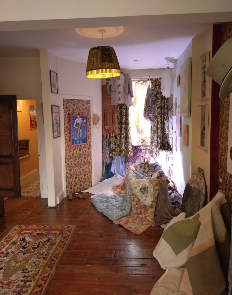 “This exhibition has been curated by artists from the Alice in Hackneyland collective. The collective originated here in Goldsmith Row in 2019, but none of its current members reside here any more”. Goldsmith’s Row is at the Shoreditch/Hackney Road end of Broadway Market, not far from Hackney City Farm. I thought it was brilliant, I thought it was exciting, I loved being in the rooms and the way they’ve used the space, the stories hinted at, the objects, the blurred lines, the pink paint, I wonder who used to room on the second floor and if she left a forwarding address. Those CD spines were to be admired, the books casually left, the bed, the bath, the clothes on the floor, the hats, the pink, loved the whole thing, the one big whole, it was a throwback, we need more of this, we need our Hackney back… (sw)