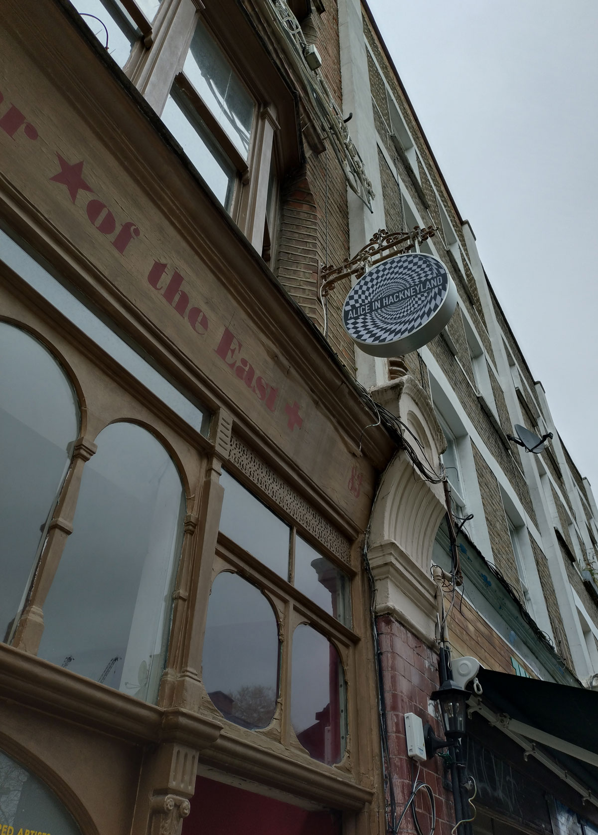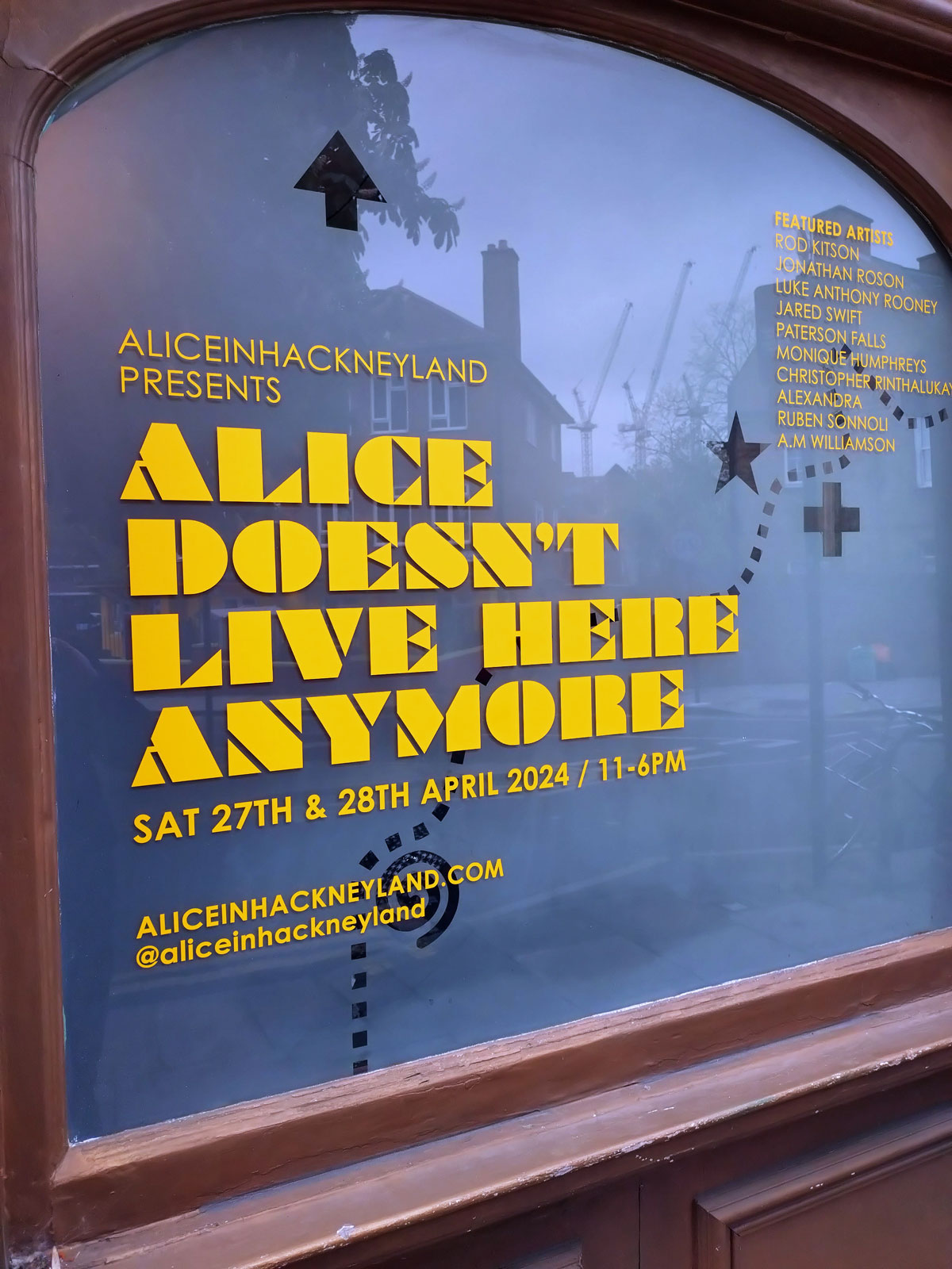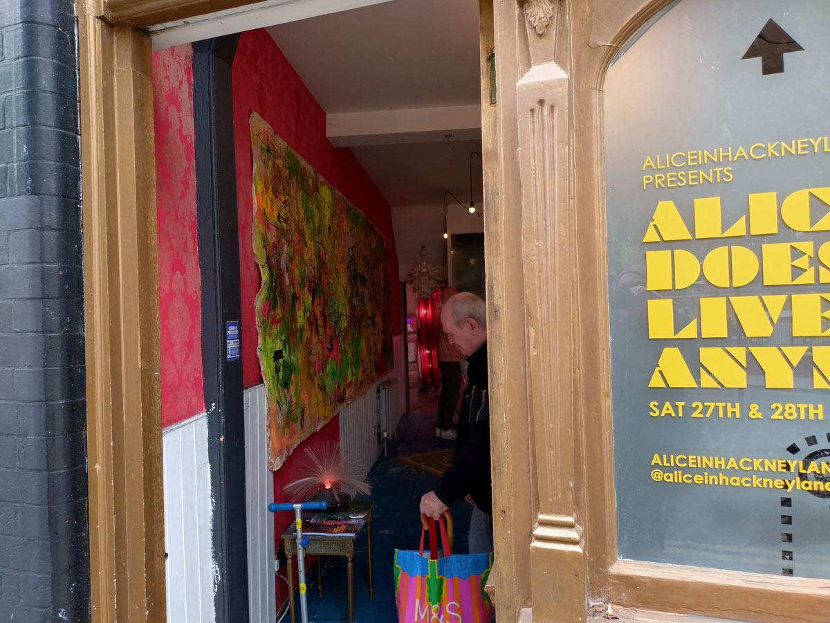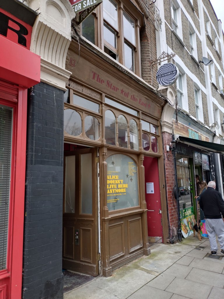 Alice in Hackneyland – Alice Doesn’t Live Here Any More at The Star Of The East, Hackney, East London – April 2024 – We need to rush this up onto the website, this is only happening for one short sharp weekend, caught it earlier today, it ends tomorrow, time is of the essence. Thankfully we spied the names and such up on the window of the old pub last weekend, previewed it as one of our five recommended art things on the strength of previous Alice in Hackneyland encounters, we haven’t encountered Alice and her pinkness for quite a while, apparently she doesn’t live here any more, quite a few don’t and this show is a bit of a glorious throwback, a reminder of how it once was in more creative artist-led times in this part of London.