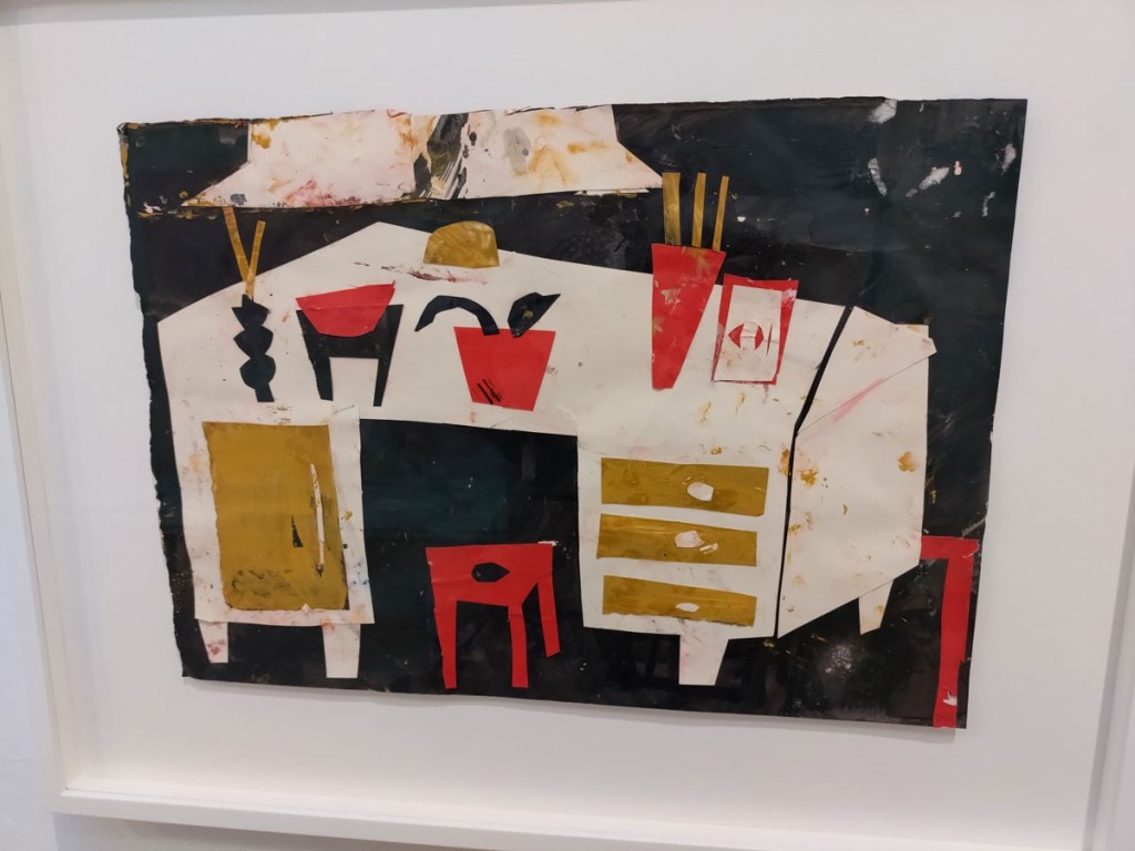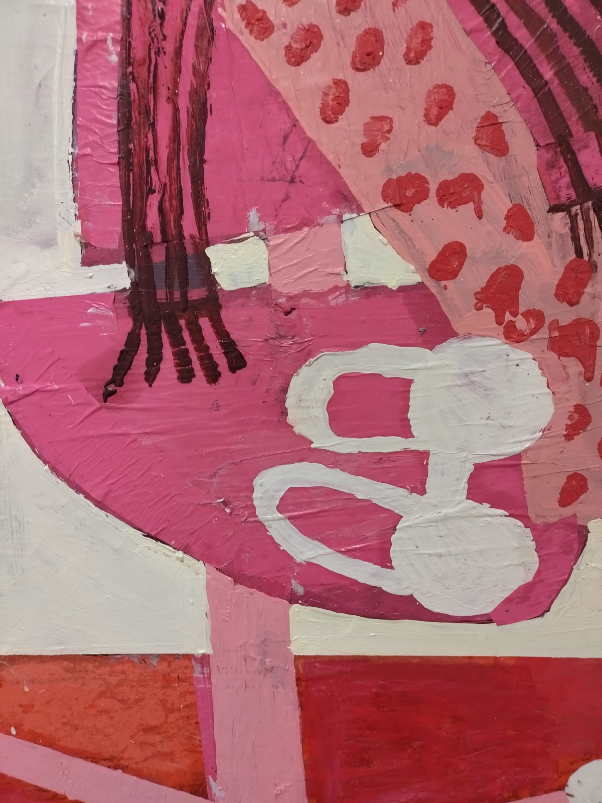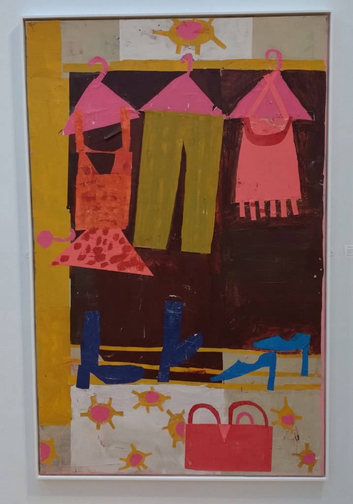 “Florence Hutchings’ new work explores the theatre of the home. Her approach to combining oil and collage reflects the amalgamation and arrangement of possessions so often overlooked, but instead here elevated; Dressing Room focuses on the interior, portraying clothing, shoes and musical instruments in a way that seems unapologetic and striking. The homely habits captured by Hutchings acknowledge the domestic secrets of us all, bringing joy through the recognition of the self, depicted in bold and lively palettes”.