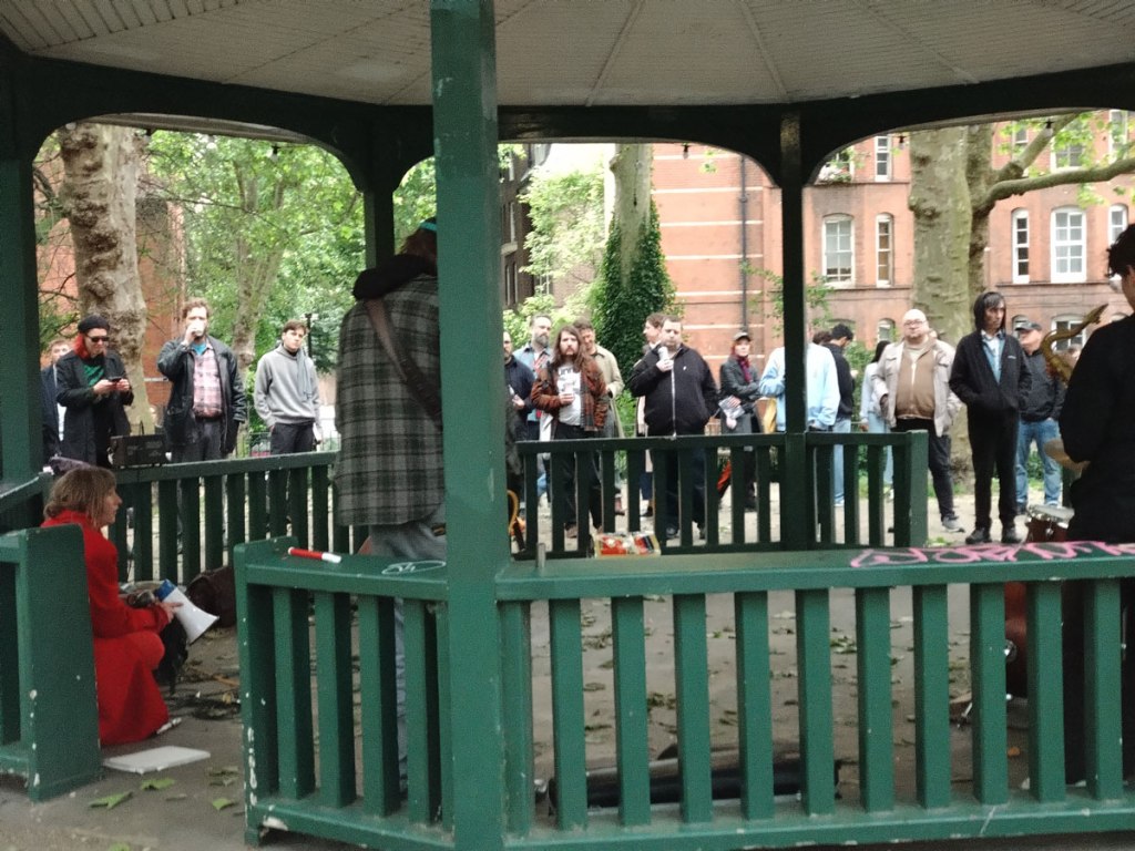 Arnold Circus is a beautiful place, the bandstand is at the centre of it all, built on the site of the Old Nichol, a notorious slum back in the 19th century, and called the ‘blackest street’ by historian Sarah Wise, Arnold Circus has undergone transformations. Its legacy as the first social housing, an early council estate, designed to “remedy the desperate poverty of slums that were cleared to provide the space for it. But the rents of this first council housing estate were too high for the displaced residents”, that’s a rather familiar East London story, nothing changes! The big mound that the bandstand sits on is the mound of rubble from those bulldozed slums but hey, as beautiful as the bandstand, the gardens and the building that circle it now look a hundred and a chunk of years on, we’re not here for a history lecture, we’re here for some wired up raw experimental jazz-flavoured avant noise. What are they going to make of this in the surrounding buildings?