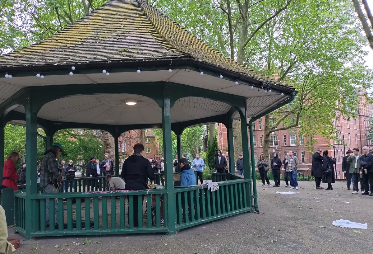 Arnold Circus is a beautiful place, the bandstand is at the centre of it all, built on the site of the Old Nichol, a notorious slum back in the 19th century, and called the ‘blackest street’ by historian Sarah Wise, Arnold Circus has undergone transformations. Its legacy as the first social housing, an early council estate, designed to “remedy the desperate poverty of slums that were cleared to provide the space for it. But the rents of this first council housing estate were too high for the displaced residents”, that’s a rather familiar East London story, nothing changes! The big mound that the bandstand sits on is the mound of rubble from those bulldozed slums but hey, as beautiful as the bandstand, the gardens and the building that circle it now look a hundred and a chunk of years on, we’re not here for a history lecture, we’re here for some wired up raw experimental jazz-flavoured avant noise. What are they going to make of this in the surrounding buildings?