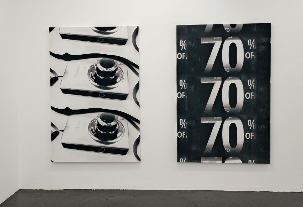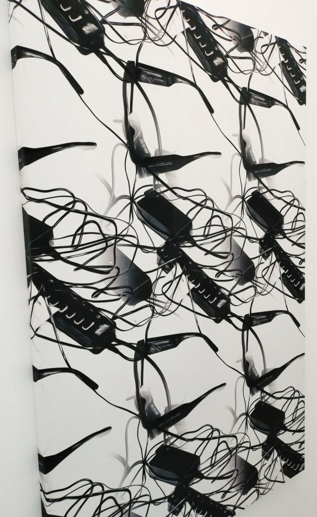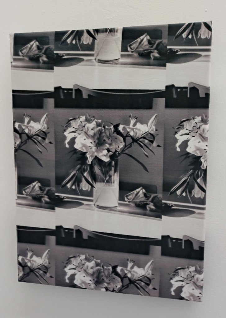 And so the last ever exhibition at Nicoletti‘s Vyner Street Space, there’s been some rather rewarding shows in the space over the last three or four years, (and we are told Nicoletti will open up again in a new East London space later on this year), the final show is by London-based German artist Ana Viktoria Dzinic, a positively black and white exhibition called Repetitive, her debut solo exhibition in the UK. What we find are a number of very striking rather bold very black and white photographic painterly prints alongside sculptural installations in which she uses “repetition as a tool to investigate contemporary methods of communication and image production”. The work as well as the show as one whole thing is deliciously bold, exciting forms, shapes, positive repetition, relationships, different contexts, things unfolding, motifs, phone shots, Freudian Slips, intimate scenes with Dzinic’s friends, Wasser (2024) and For Tracey (2024) featuring images of the ocean taken in Margate, in a poetic homage to artist Tracey Emin. These are piece that ask the viewer questions, that play with the viewer, maybe entice, entice in a rhythmic kind of way, intense at times, graphic, painterly, I like this, I like being in here, I like this space, I like how Ana Viktoria Dzinic has used it, I like how the work breathes in here, I like being with the work, I like the strength of the contrasts… Part five will be along in a moment (sw)