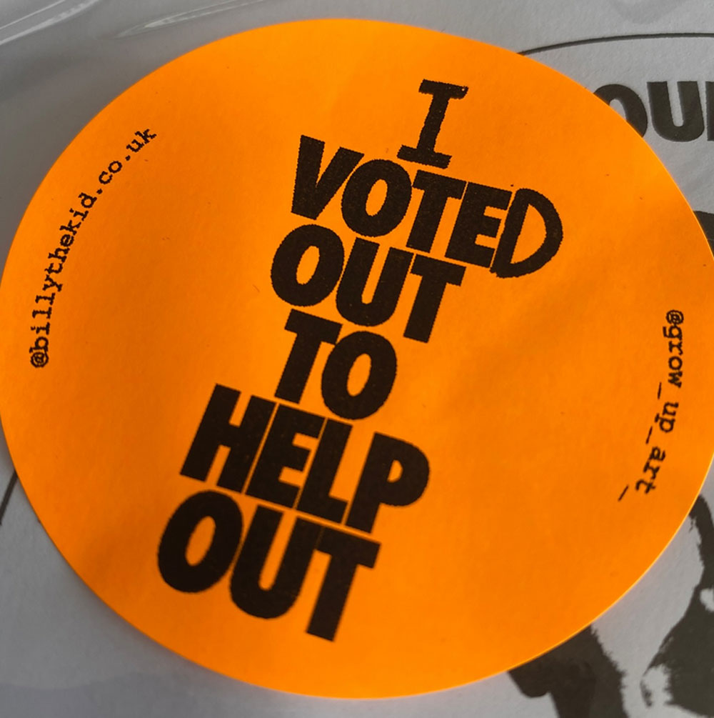 yes, the Art Car boot, something that has been evolving for around twenty years of so now, is as much about the actual event, about the people and the moment as it is about the art and tonight the artistic force known as Grow Up are covering anything that moves with there hastily modified dayglo orange Vote Out To Help out stickers that are now hand customised to read I Voted out The Help Out and it could so easily have been a post election downpour wash out – that was seriously seriously heavy rain, some of my art might not have survived! – but the Tories have been voted out and the DJs are doing a brilliant job and were out in the rain under the Westway (and all that cultural history attached to the Westway) and everyone is in great humour and for once we couldn’t care less about the weather – such a beautiful wash out of an evening, fine fine times. Life can indeed sometimes be something special, music can sometimes be something very special, art is so often something special and we might not have needed a reason but we have more than good reason to be dancing like fools in the rain tonight and and a Trouble Funk sample never sounded so good. Oh yes, there were, as the Art Car Boot Fair team said themselves, some brilliant moments and a truly great atmosphere despite that relentlessly driving rain!