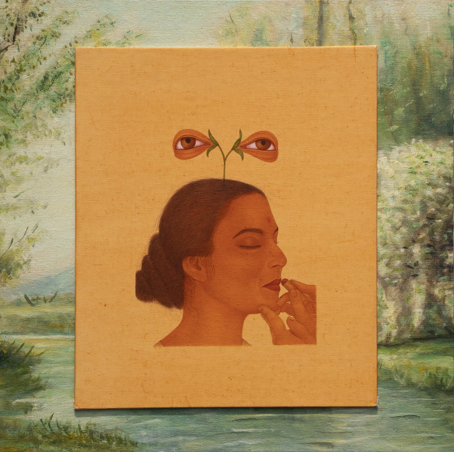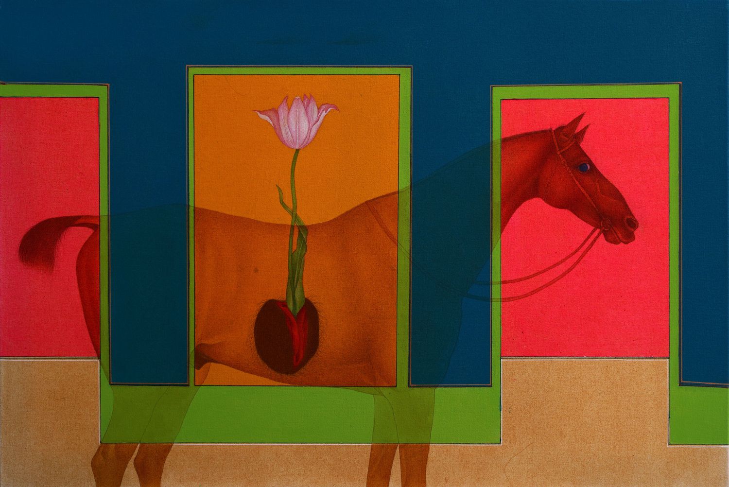 Another work depicts a horse that appears both too large for the surrounding space and too traditional in style for the contemporary setting and vivid, luminescent hues. The idea of artificiality is further highlighted by the tulip that appears to grow out of the horse’s stomach, sprouting unnaturally from a poppy seed. The same horse appears again as an outsider in another painting, lurking behind a spire-like shape that was inspired by the gates of a museum Zeeshan visited in Germany. Inside this shape there is a woman applying her lipstick. The image comes from the 1963 film Mahanagar (The Big City), which tells the story of a small-town girl who moves to the big city and has to adjust to a different way of life, which is perceived as being more exciting and cosmopolitan but also less connected to nature.