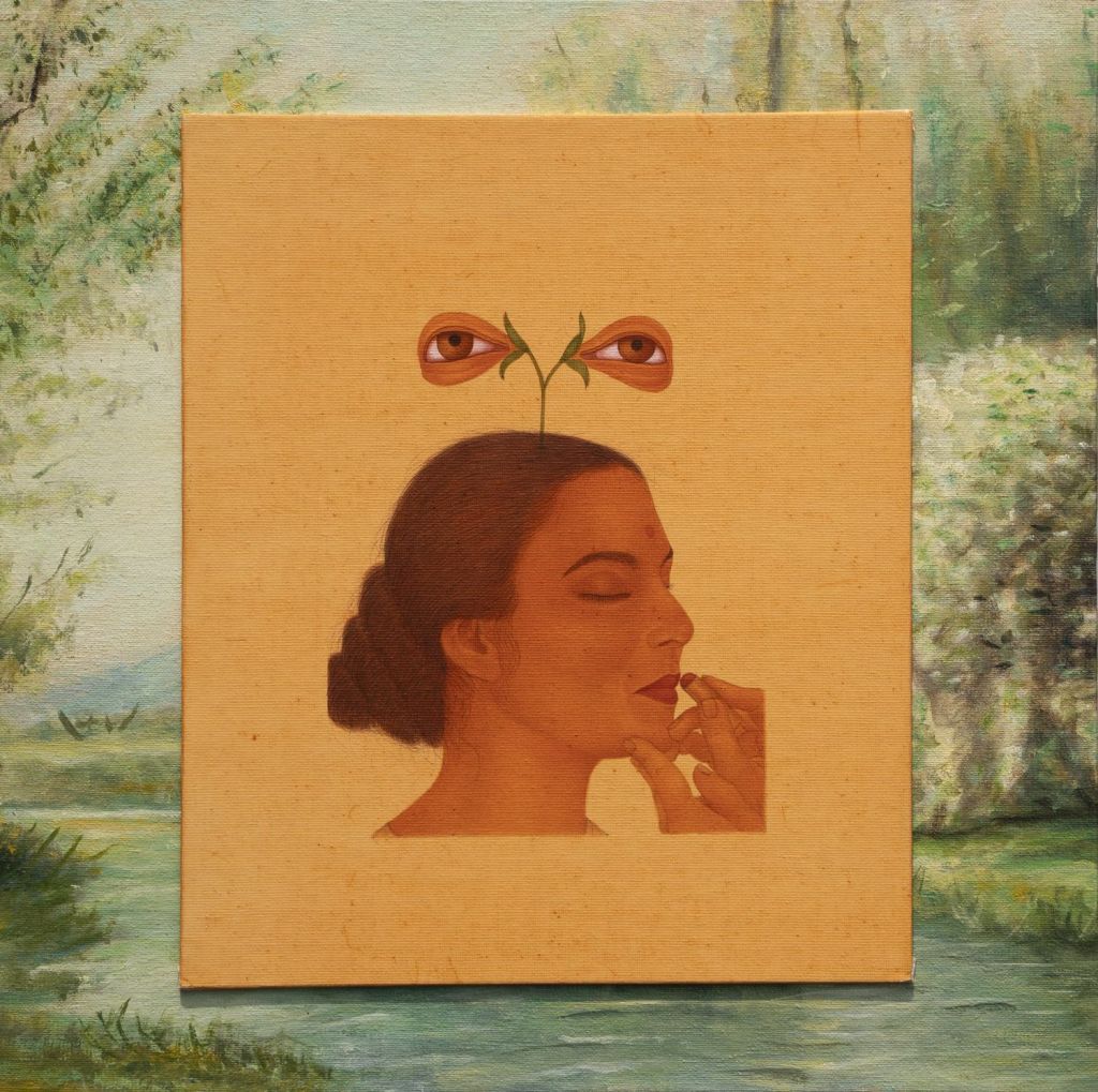 At the same time, these spaces still provide artists with a platform to discuss difficult topics and voice dissent. It is that tension that Zeeshan is interested in: the points at which resistance and conformity meet. One painting, for instance, evokes a labyrinthine space with floating walls evoking the impermanent architecture of an art fair booth which has been painted hot pink, supposedly one of the most ‘Instagrammable’ colours. Within this no-place, two delicately painted, translucent images appear suspended like visions from a different world. On the left there is a Bengal tiger, a symbol of strength, power and wilderness, the untamed forces of nature, while on the right a plant sprouting two disembodied eyeballs reference historical depictions of Saint Lucy as a symbol of suffering and resistance. The contrast between these complex and ancient symbolisms and the superficiality of the space is highlighted by a feeling of incoherency or incompleteness: nothing quite fits together.