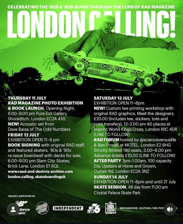 3: London Calling – Read And Destroy at Pure Evil Gallery – The opening night is this Thursday 11th July at Pure Evil Gallery (6-9pm). “Last year’s show was a block party! Come on down!” said Pure Evil. I guess most of the info is there on the flyers. We’re talking a Rad Magazine photo exhibition and book launch, so lots of skateboards and hopefully all the associated culture. Personally Skate Muties From The Fifth Dimension was my skate flavoured reading preference, sounds like it should be quite a night though. Click on that green flyer to enlarge it and see more. We were always bumping into RAD back in the early days of bother them and us here at Organ (about time we cane up with a book)