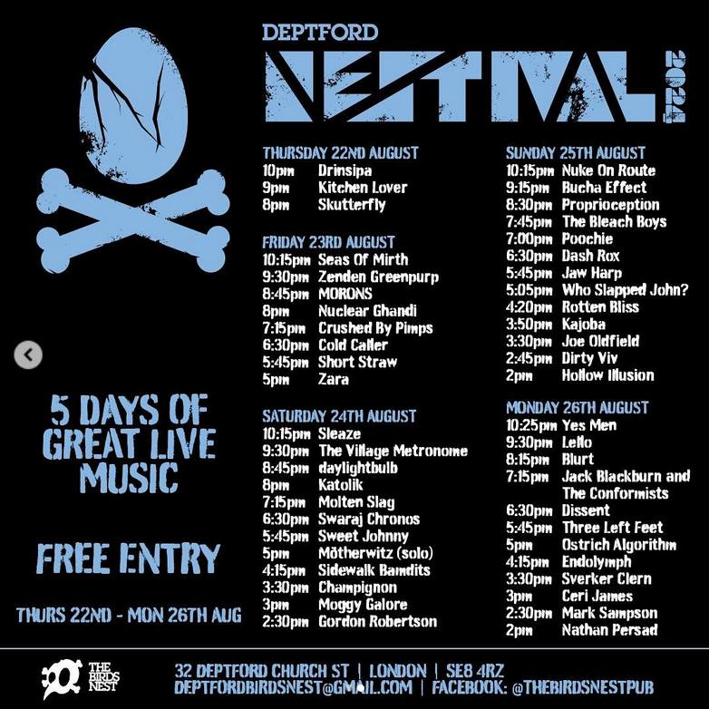A quick parish noticeboard shout out for this year’s Nestfest over in Deptford, South London, how much more South London could it be? None, none more South. Five days of free music and the Bird’s Nest, well four now, we’re late with the notice, hey, you know how it is, these overseas gigs. Seas of Mirth are particularly good live, we told you about Katolik a few days back, a Blurt performance is always a good thing, you can go google the rest, the times and things are down there, it will be raw, it will be gloriosuly DIY, the beer prices are reasonable…