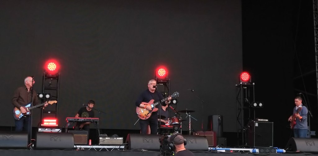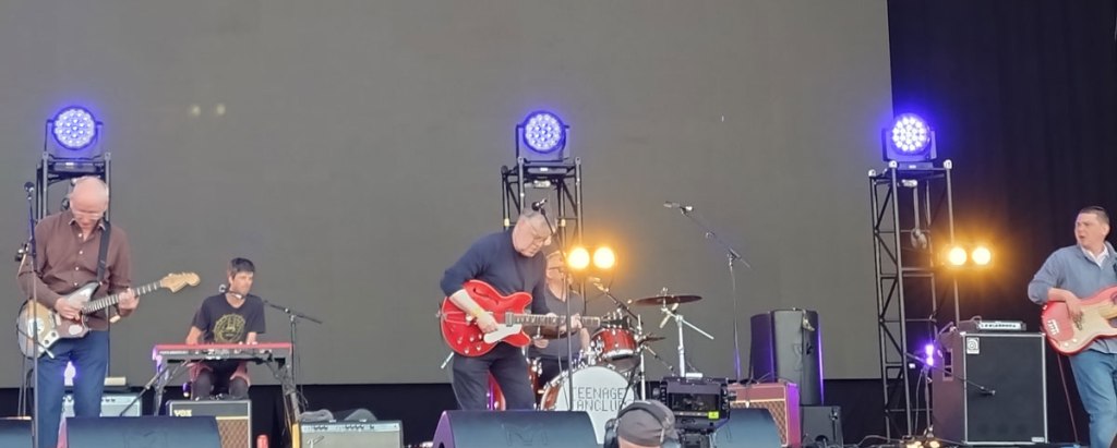 A sprint over to catch a quick bit of Yo La Tango but hey we can’t be in two places at once and as much as we’d like to stick around for them, Teenage Fanclub are way over the other side of the festival on the other big stage, the Fanclub demand we go west, no time to tango and no time for more of that free vegan ice cream (yet) either. Just about made it in time for Teenage Fanclub to quietly amble on stage and just easily effortlessly flow in to it all in the afternoon sun, to effortlessly glide into that so so inviting flow of Home and the comfort of that open door, into the way it rolls along so so well before that riff that reals in the years a couple of minutes in takes you along. The newer material is easily as good as those old friends from their glory days, they sound at ease with it all, just a bunch of people up there playing together and smiling as they do, and smiles down the front from people just really (really) enjoying it all. And for a rather beautiful forty or so minutes no one at this end of the festival site had a care in the world, we’re all just flowing with the way Teenage Fanclub are just flowing up there, with that sublime guitar interplay, with the gentle chug and the gentle gear changes, with that taking their own sweet time to find their way to About You – oh this is good, no ones talking here, no ones annoying anyone, no danger of a punch up today, everyone focused on the pure joy of a band with a sound perfectly crafted and everyone feeling the love and these golden days now far from violence, Tired of Being Alone, from 2023’s Nothing Lasts Forever sounds just right in the late afternoon late summer sun – the sky isn’t quite aglow yet, but it all just feels so so right listing to Teenage Fanclub in the park in the sun, basking in that easy to go with Neil Youngish whatever you want to call it, that Big Star thing they do, you know the names that people mention when they try and fail to write about what it is Teenage Fanclub do that makes them so good.
