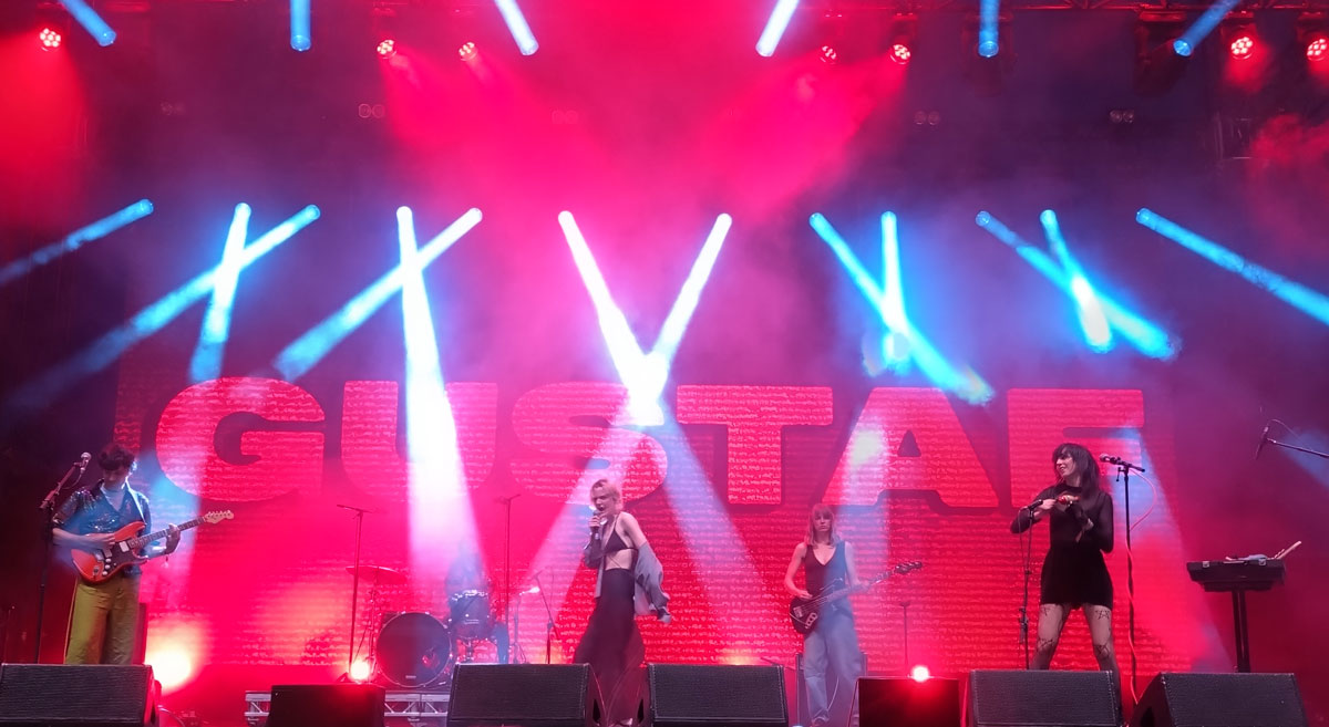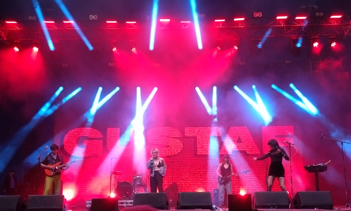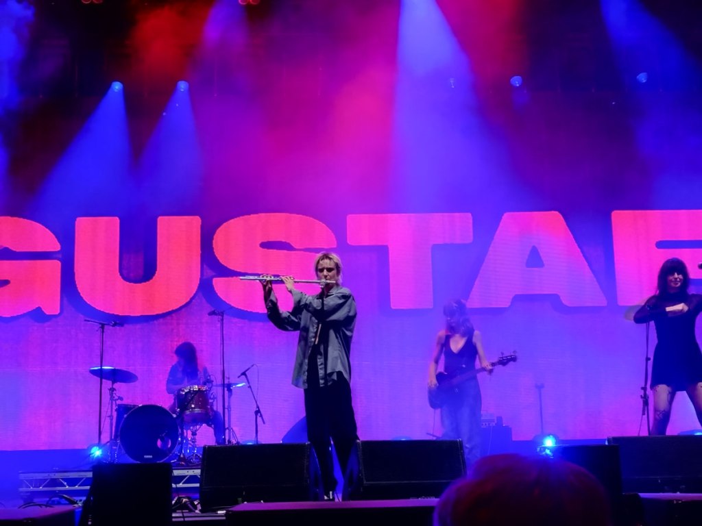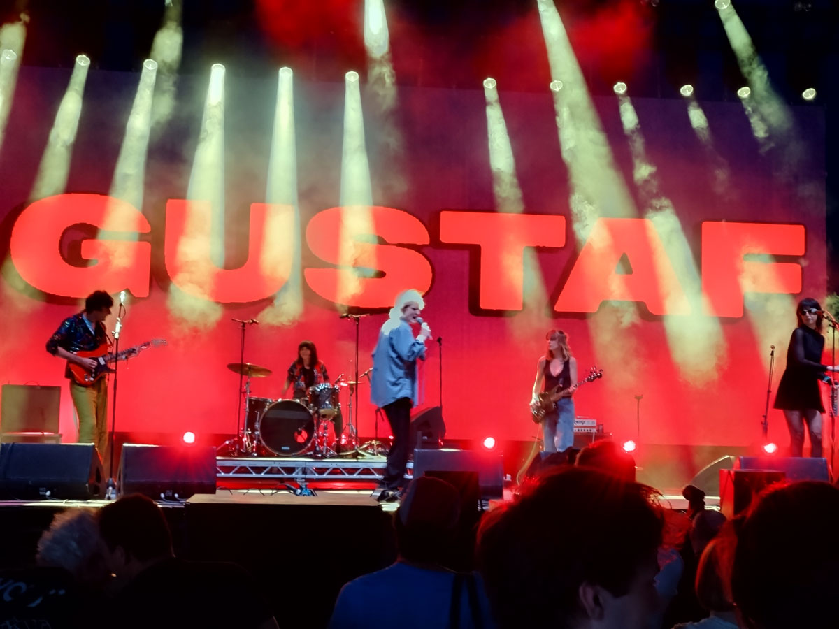 Really needed to be there in time for Gustaf‘s first ever show in this part of the world, the fivesome’s British debut promised much, all the way from Brooklyn New York where they think a hero is some kind of weird sandwich and they’re always on their best behaviour and read books to get ahead. Now we were kind of hoping they’d be performers as well as great music makers, they were! The five of them soon filled the big blue tent up in a healthy way, they were clearly catching passing ears and what does it mean and how should I feel? Should I pretend it really isn’t real? Are we going to talk of them as art punks? Post art punks? Art posts? And can we touch it? Feel it? I’m good at this, I’m good, I’m very very good. Oh Gustaf certainly can perform! they’re good, they’re very very good, they are to be desired. Lead singer Lydia Gammill is a ball of all over the stage energy, her band, is it her band? The band, whoever’s band it is, they all demand attention – brilliant percussion player/other vocalist Tarra Thiessen is an utter dancing ball of must watch energy, a dancing while singing and hitting things star, is it her band really? Hang on we need to name check them all; Gustaf are Tine Hill (bass), Vram Kherlopian (guitar), Melissa Lucciola (drums), Tarra Thiessen (vocals, percussion), and Lydia Gammill (lead vocals), they claim they got their start in 2018 when Thiessen recruited Gammill to help drive her van down to SXSW, I really really hope that’s true, I hope their van driver really did become their utterly compelling slightly disturbing centre-of-the-stage-demanding maybe just a little off-hinge singer, I hope Lydia Gammill did project herself out of that van and out to the centre of the stage. What do they sound like? Well they’re doing that locked on New York Art rock post punk thing, that slightly Devo-ish psycho killer thing, all five of them seem vital to the operation, they’re clearly going places, they’ve got a book, show me the book, they’ll get stuck in your head and your dreams, take note of that, I don’t come here to repeat things. Yes, there might well be quite a number of so called post-punk revival bands out there right now, Gustaf stand out though, Gustaf have personality, they have a slightly different presence, they sound great, did she just pull out a flute? They look great, they move great, they perform. they need to be watched, they took to an almost empty big blue tent stage and by the end of their short early afternoon set they had a more than healthy happy smiling dancing crowd pulled in to see what they were grabbing – a more than healthy crowd pulled in and won over. Oh yes, Gustaf were good, they were very very good, they were on their best behaviour, what does it mean? They’ll get stuck on repeat, Gustaf have landed over here, you can’t pretend it’s not real, they’re not just rehashing the spiel but we can’t hang around, there more to see, we’re missing bands on other stages…