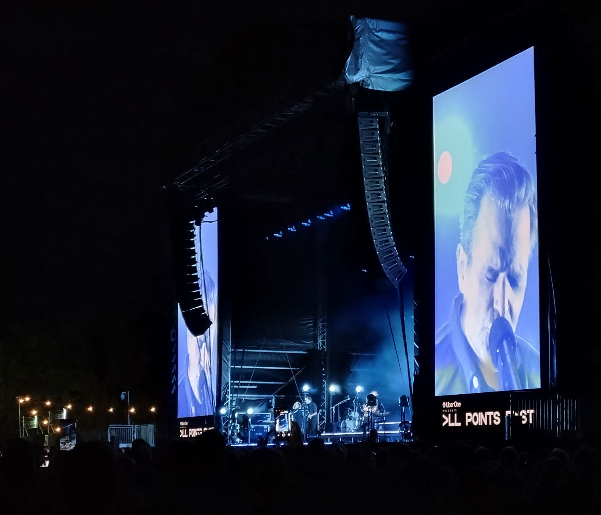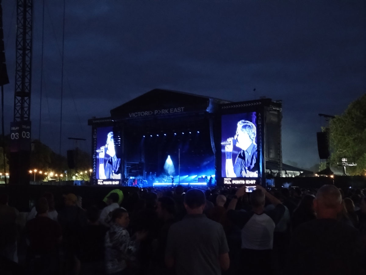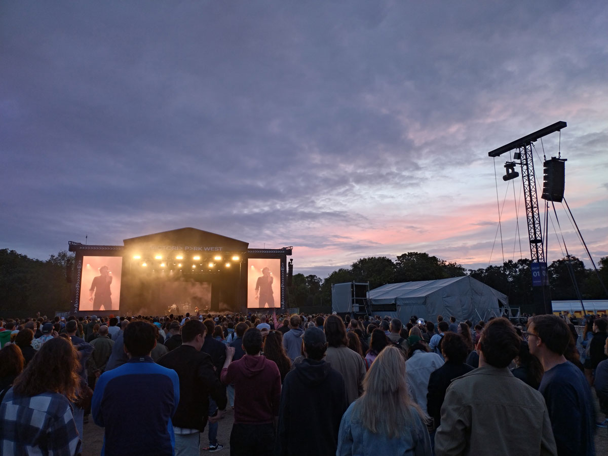 So, almost time for Death Cab For Cutie, often abbreviated to DCFC but we Dream City Film Club fans can’t have that! Death Cab time, everybody put your best suit or dress on and yes Ben Gibbard, all dressed in black for the occasion does have a way with words and songs and so this is the new year rather than almost the end of Summer and the U.S band are telling us of tears in the fabric and looking for the patterns and performing their fourth album in full, 2003’s Transatlanticism, the one that broke them into the mainstream, the one that made them almost household names (and not just a Bonzo Dog song). Death Cab feel just right tonight after the musical overload of a busy day, we weren’t honestly planning to stick around for much of them but the vibe is just so very very nice and the songs are very (very) nice and the weather is still rather nice and the words are easy on the ear and it all feels rather good and the fact that these songs from twenty one years ago clearly mean so so much to so so many people around us makes it feel rather good to be here almost gatecrashing in the middle of it all. Death Cab never really ever touched me, I tried a few times back there, it was all a little too nice, a little bit too American and over here we never really had the money for cars to do it in (it was graveyards and bus shelters) but tonight it is kind of just that, harmlessly nice and to kick any of it would be to kick a puppy. Transatlanticism, with this crowd loving it all, feels like a really good way to almost end a fine fine day