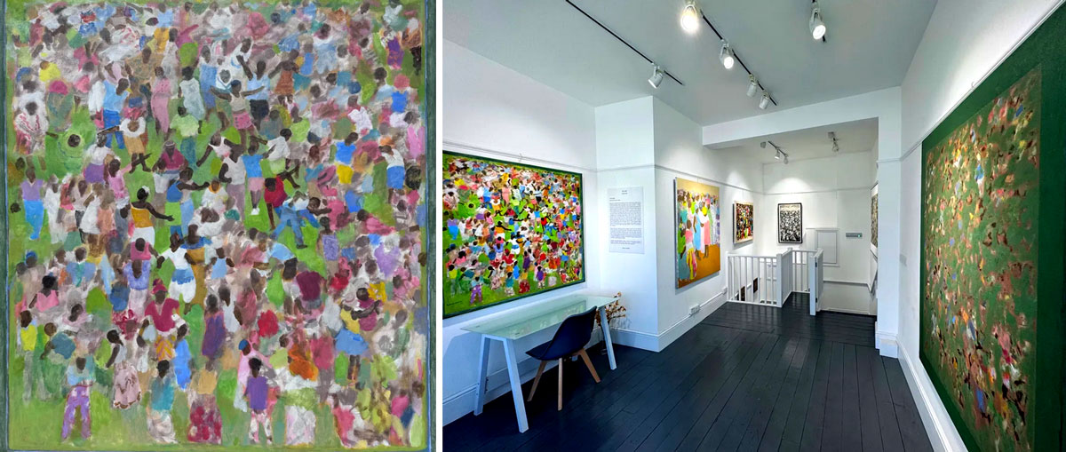 Many years later while visiting a friend in Holland, I saw an exhibition of Eritrean art in Amsterdam and was struck by the aerial views in which most of the compositions were set. They echoed that experience of my travel into central Oxford on the upper deck of a bus. I loved the work and enjoyed the way it allowed the viewer to attain a more complete view of each figure represented. I worked some of their technique into my art. I have always tried to define myself as an African Caribbean artist and have resolved to make work that speaks from my African identity. In that regard I am inspired by other artists in the African Diaspora who make work in different media, particularly music and the visual arts. I think of musicians who use improvisation as a key factor in making music as in the improvised rifts, say, of John Coltrane and in the ‘street art’ of Jean-Michel Basquiat.