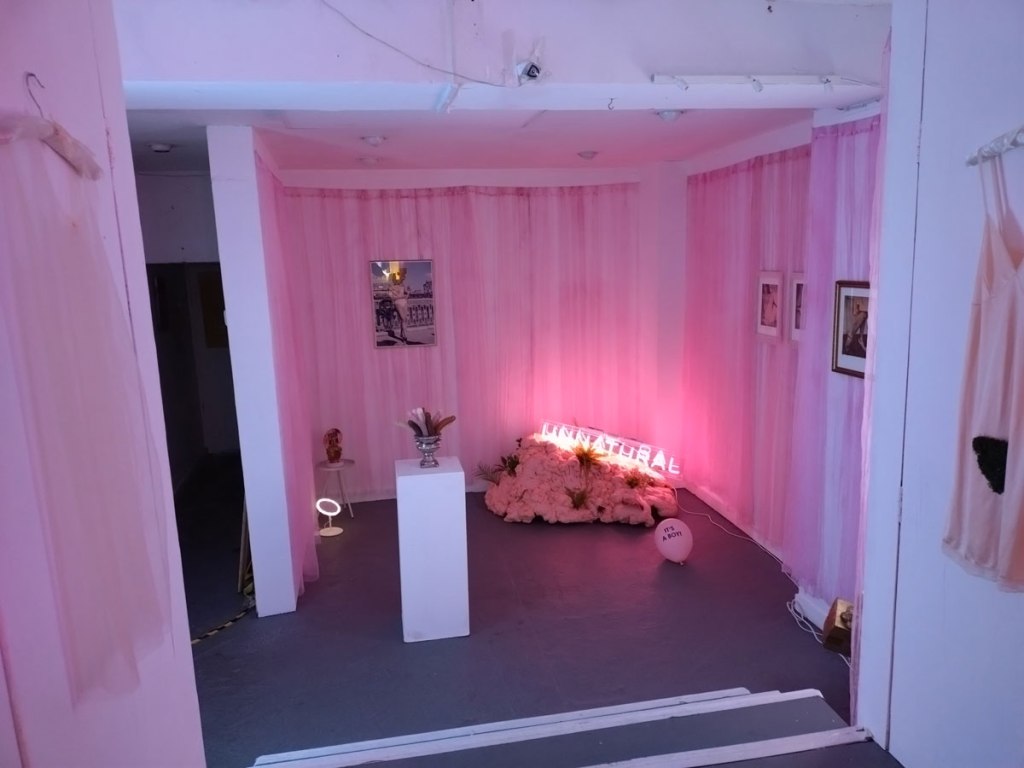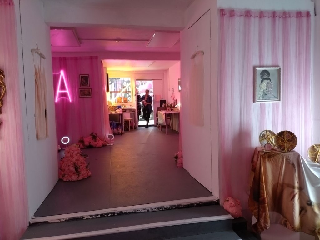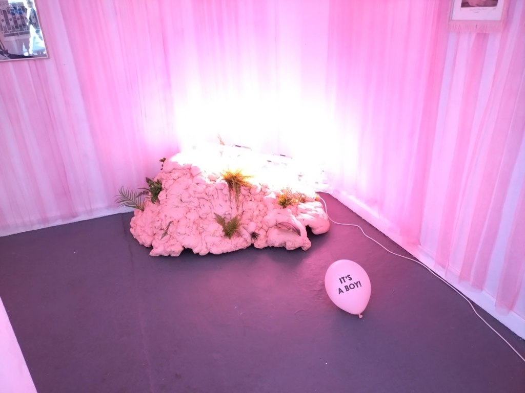 This is brilliant, this is exciting, is this really Studio 1.1? The usually rather robust, rather mescaline rather bleak set of (never that art-friendly) white boxes on East London’s Redchurch Street has been totally and utterly transformed into a far more feminine art space by Sadie Hennessy, a multi-disciplinary artist, “notable for using dark humour in her work”. She trained at Dartington College of Arts and gained her MA from Central St. Martins. She is the former Screen Print Fellow at the Royal Academy and won the Jealous Graduate Art Prize for her MA Show. She is the Chairwoman of the Whitstable ANchorage Klub, hosting the famous Whitstable End of the Pier Show, and the Salon de Ballon”.