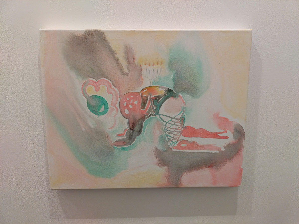 And here we are in this small white cube in the back streets of one of the not so edgy parts of Bethnal Green. Four very white walls with mostly large canvases, big images, with play, with images that play, ideas? A scenario or two? Does it depend on how you read them? Submissively maybe? They are powerful, fluid – fluid in the way they’re painted, in the way the paint at some point was so so wet. They are playful paintings, not heavy, not demanding – they do demand a smile and yes, the colours are far far brighter than those that usually fill the world of dominance and submission, the dark reds and blacks you usually find, Ms Green’s offering is an unconventional one, those high heels and ball gags come with soft watery edges and those bright washy watery colours, she’s come with her own set of rules, her own way to play, her invite maybe?
