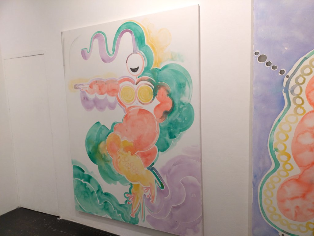 All but one of the paintings are life size, it feels like the scale, the relationship with the viewer, is in some kind of way important, that those conversations with the pieces on the gallery wall are supposed to be eye to eye (or bowed if required?). There’s a playful dynamic here, an intrigue, you kind of want to know more, you want to let your imagination flow with the watery paint and the way it was painted. I imagine she had the big canvases flat on the studio floor, that it was a fast process, quite a performance in itself – these paintings are so deliciously fluid, bold, bright, under control though, she has it under control, the paintings are on her terms and there’s an almost knowing strength in her lightness, a strength in the way Susie Green has painted these delightfully powerful pieces, the way she’s controlled them as she lets them flow (oh the undercurrents, insert smiley emoji here). This is playful, play time indeed and yes, I do need to go back on a day when things are quiet – this was the opening night, wine and conversation was flowing, views were obscured, need to go and stand in the room with nothing but the paintings, there’s just something about them that demands it. A rather recommended exhibition, a rather enjoyable experience (sw)