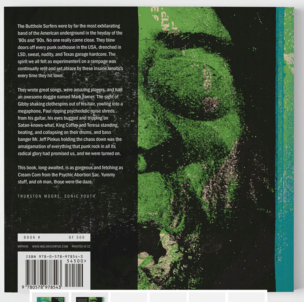 “Butthole Surfers: What Does Regret Mean? is a fully authorized visual history of the band with never-before-seen photos, artwork, and other memorabilia and from the viewpoint of their contemporaries. It features an introduction by Mickey Melchiondo (Ween) and exclusive interviews from Rob Zombie, Kim Thayil (Soundgarden), Thurston Moore and Lee Ranaldo (Sonic Youth), Eric Avery (Jane’s Addiction), Steven Drozd (The Flaming Lips), Al Jourgensen (Ministry), Nick Oliveri (Queens of the Stone Age), Stephen Malkmus and Bob Nastanovich (Pavement), Neko Case, Dale Crover (Melvins), Eric Wilson (Sublime), Henry Rollins, Daniel Johnston, Cris Kirkwood and Derrick Bostrom (Meat Puppets), Steven McDonald (Redd Kross), Berserker Blothar and Balsac The Jaws of Death (GWAR), David Yow (Jesus Lizard), and many more”