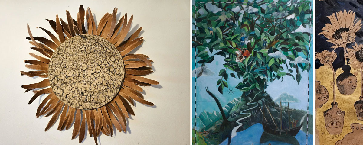 “The loveliness of Des Haughton’s trees, branches snowed with bloom, disguise for a moment historical horror within. Speaking directly to these, Eugene Palmer’s portraits, executed in a graduated grisaille, subtly transform and remake the act of looking. While Amanda Holiday’s drawing of ghostly face jugs and towering sunflowers brings the conversation full circle.