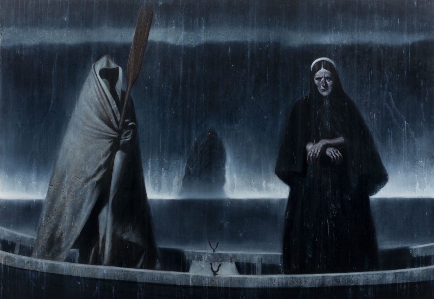 “The Crossing transports viewers to an unknown archipelago, characterised by its desolate and barren islands and towering sea stacks. The landscapes, reminiscent of the westernmost islands of the Outer Hebrides, feature eroded rock towers that emerge from a deep, black sea, foaming and spraying at their bases. In this stark and unforgiving environment, an unidentified community endures a precarious existence without shelter”.
