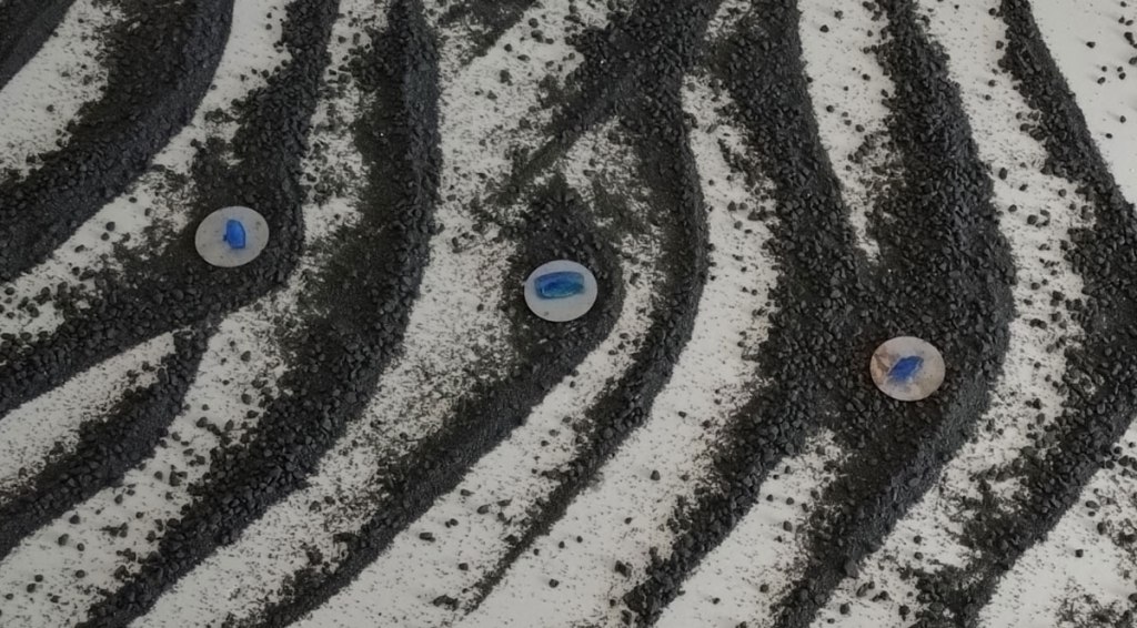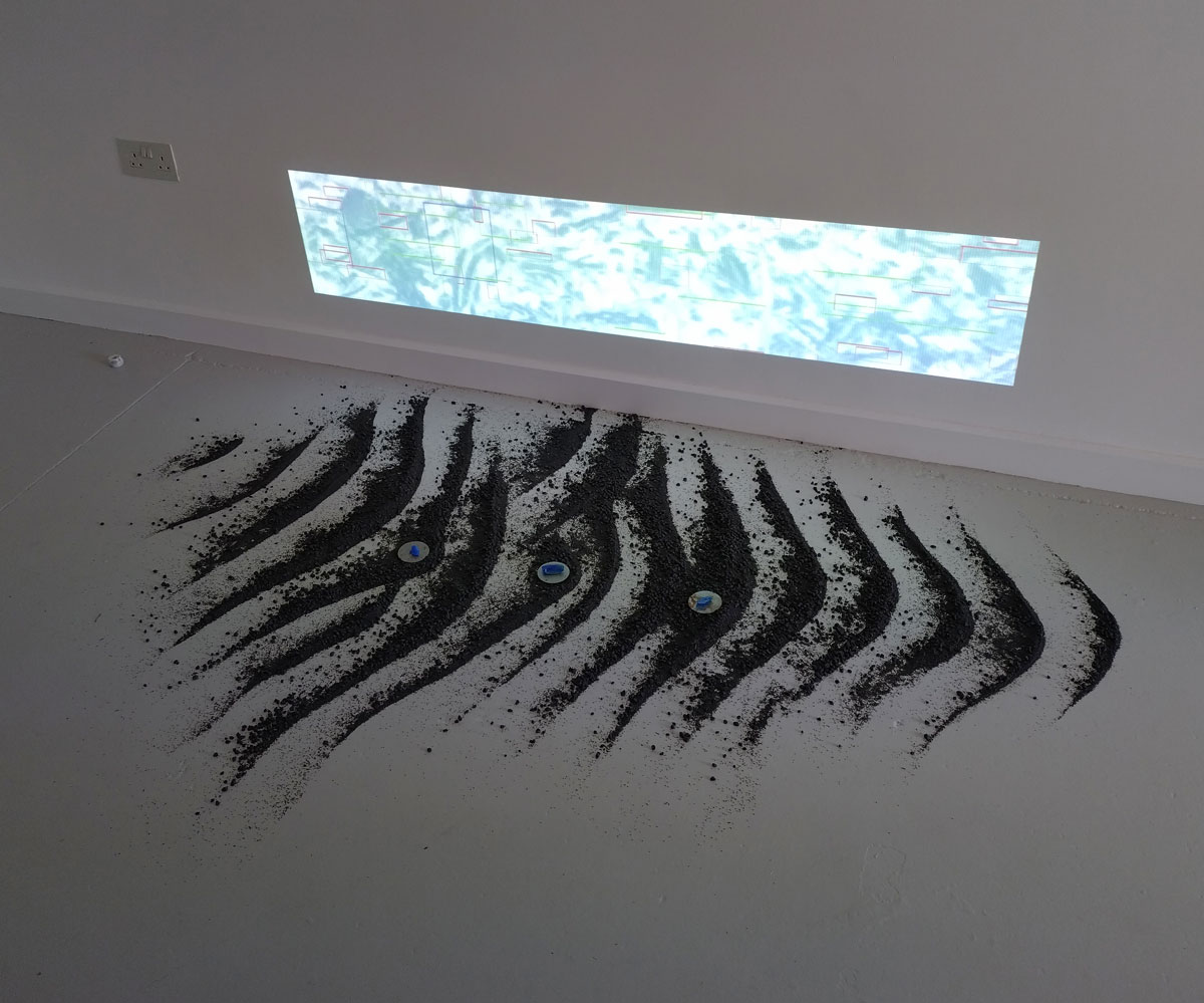 Really don’t want to be picking out any particular piece, it all works so well as one whole, as one thing, have to though, do so like the crystals and volcanic ash of Sara Christova’s piece that’s partly film projection low down on the wall and partly floor installation – no, wrong to pick out pieces, for once everything is to like, nothing is filler. It might have been the sunshine, it might have been the smell, the atmosphere, the organic openness of it all, the transcendence, the “speculative interpretations of ancient beliefs, ritual practice, and communal folklore” in amongst the almost brutalist concrete – see, we really are talking ley lines –