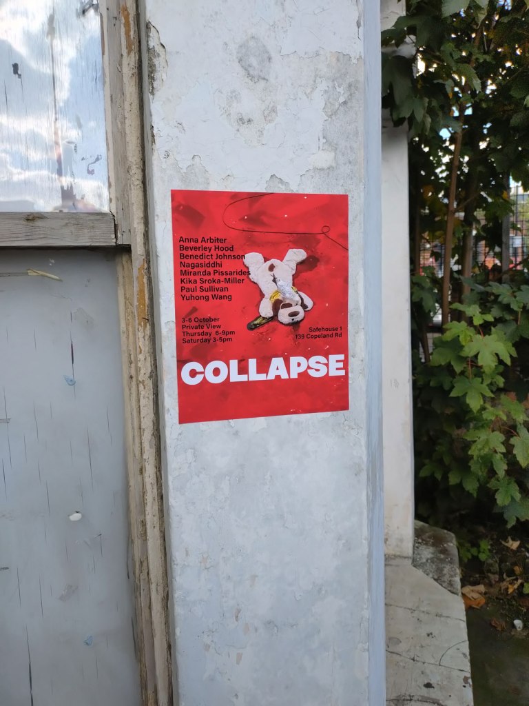 […] pieces of art, are we flagging yet? Actually the Saturday before East End Sunday was that excellent Collapse at Peckham’s Safehouse One, another rather powerful rather rewarding artist-led group sho…k alongside that equally as good Tracy McBride, Elemental show at Safehouse Two, Wednesday was […]