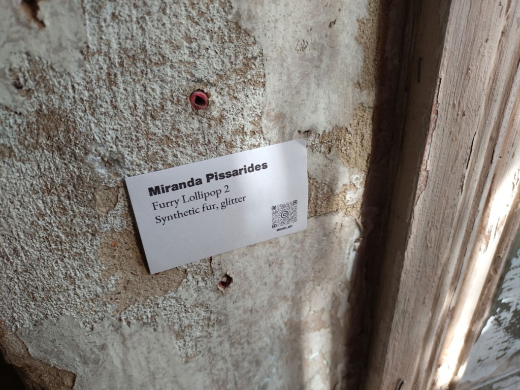 Those Miranda Pissarides pieces hanging from the ceilings of various rooms are fun, they’re playful, but then they’re far more than that. In here they break up the lines, they add to the mood rather than swing it, they’re great, you kind of want to touch them, push them, make them sway. Her hangings play with the rest of the room, they tie it all together and then you look at the floor and she her other pieces, or the ones in the remains of the show cubical and once again you want to know more about these pieces, about her, about her whys and wherefores, you start to look before the bright colours and the glitter and the fluff, you go beyond the fun without ever losing the grasp, Miranda made me smile, that can sometimes be a good thing