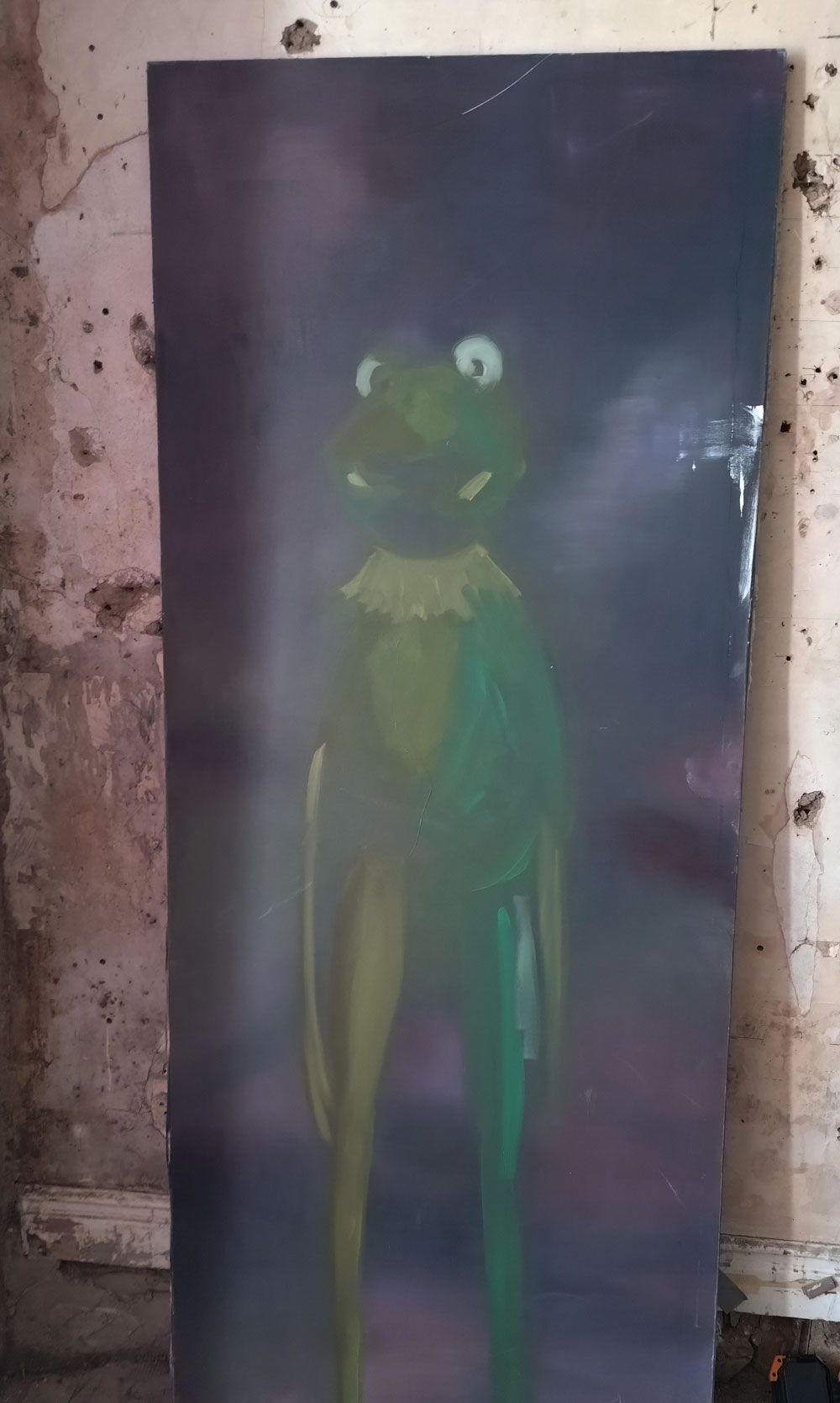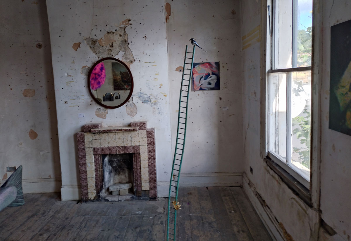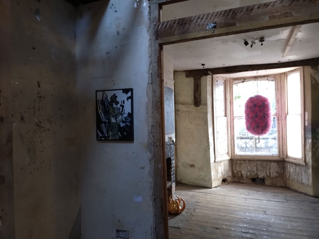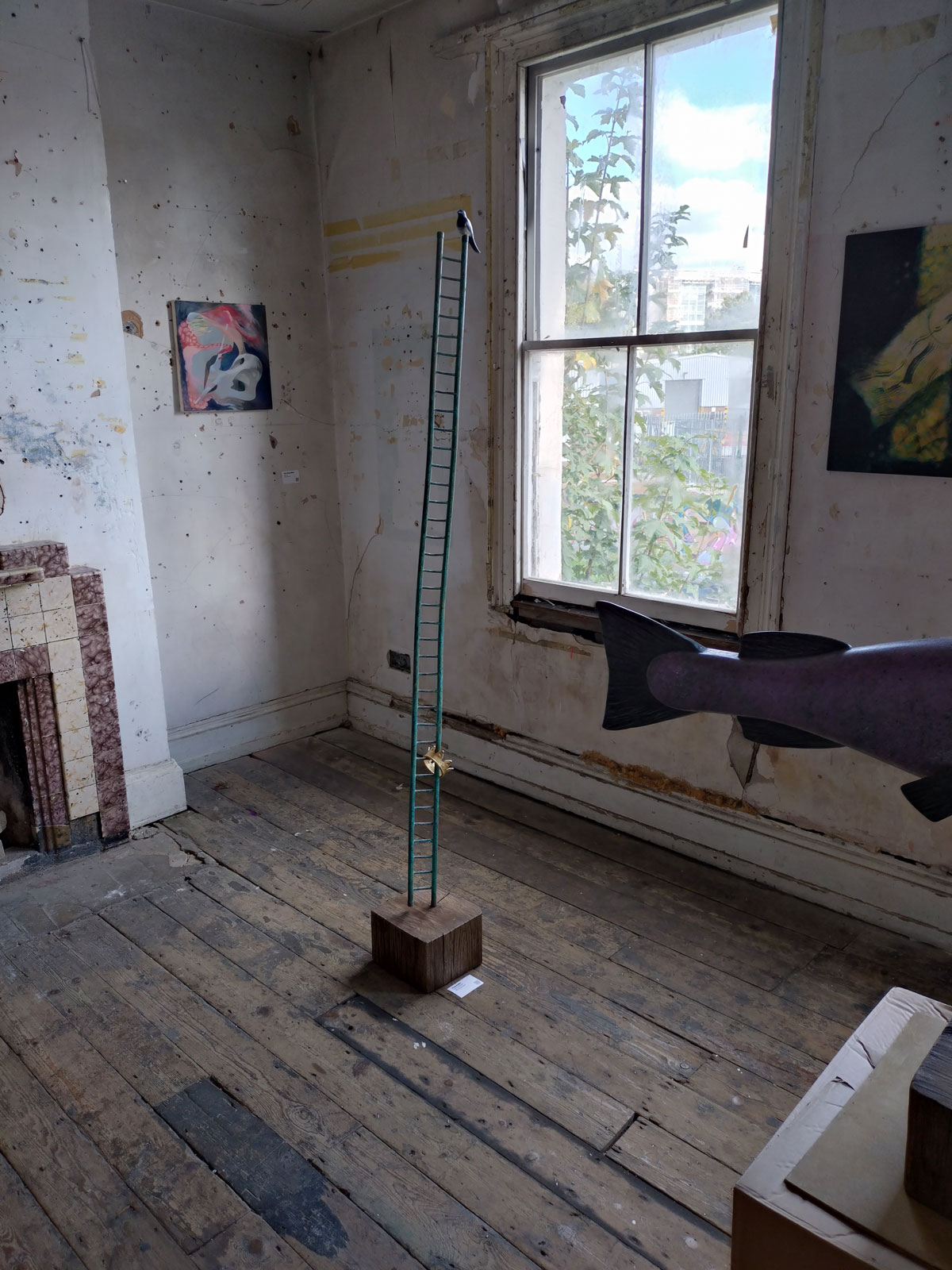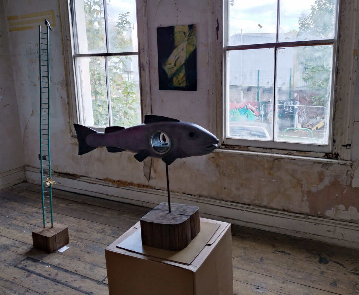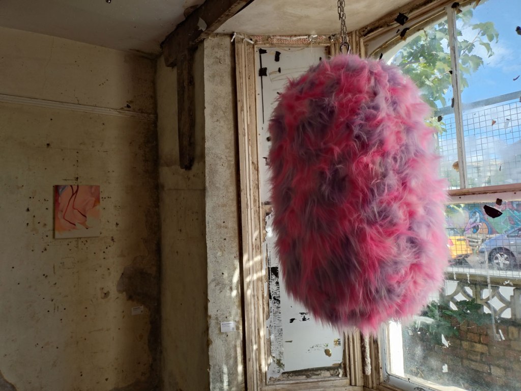 Collapse at Safehouse, Peckham, London SE15 – 3rd until 6th October 2024 – Went to six shows today, I shall probably only tell you about two of them, maybe three, the accusation levelled at us here is that we like everything, we are actually rather picky about what we fill our pages with, why waste time and space on the disengaging, the unrewarding, the mundane, on the clutter? We are your cherry pickers and only the best will do. Do like that big fish upstairs, part of Collapse, another group show at one of Peckham’s Safehouses (of which, as I’m sure you know by now, there are two, semi detached and just about intact enough to host art exhibitions and such). Another overseas trip today then, over the water to South London, desert the mean streets of Hackney for a couple of hours as we dance on the cusp of Frieze Week.