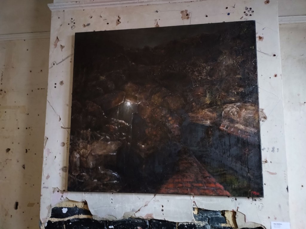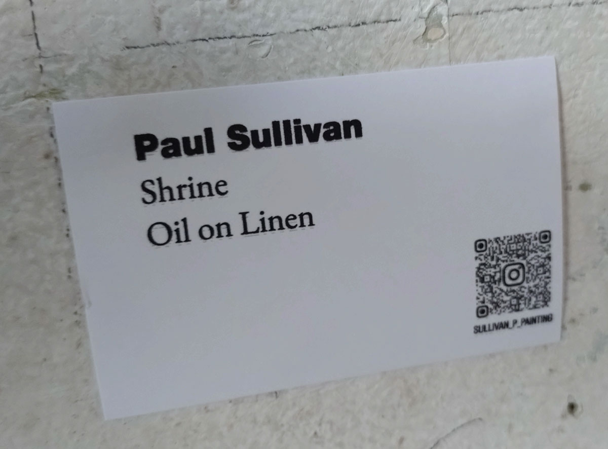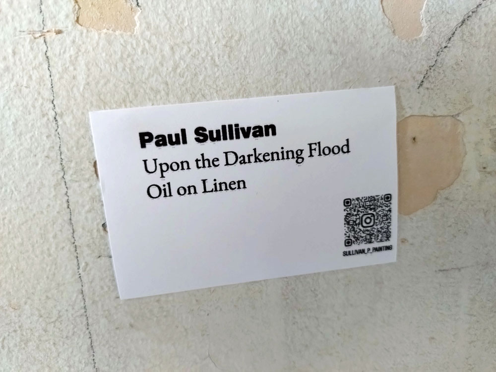 And oh look, labels! I can just admire that wonderful painting right there and just look down and, without ever imposing on anything, a small label, a name and a title, Paul Sullivan, Upon The Darkening Flood, simple! That’s all we need, armed with everything required to go find out more about Mr Sullivan and his rather excellent paintings of which there are a number of rather powerfully demanding examples in here. Never heard of him before, there we go, a label is a beautiful thing (I still don’t know who painted those wonderful paintings I saw last time I was in this same venue for a group show), Upon The Darkening Flood, all the drama of a Van Der Graaf Generator song, a timeless painting, some might say a proper painting, not all about the moment in the making, not the action of the painter, this is, as dark as the flood is, a refined considered thing, it isn’t about the angst of the painter, it is actually all about the painting and not the how it came to be or the rest of it, just a proper old school painting that invites you to read it, to explore it. Oh how glorious a label on a piece of art is, I can now follow Mr Sullivan’s social media and see where he might next show a painting, that is all I want from a group show, a door opened. I say all this because apparently my unfashionable raving about the lack of labels has hit home, apparently the labels were there just for me (I’m sure that is an exaggeration, maybe I should complain about about the lack of a man following me around with a find bottle of malt while I view the works and see what that brings)