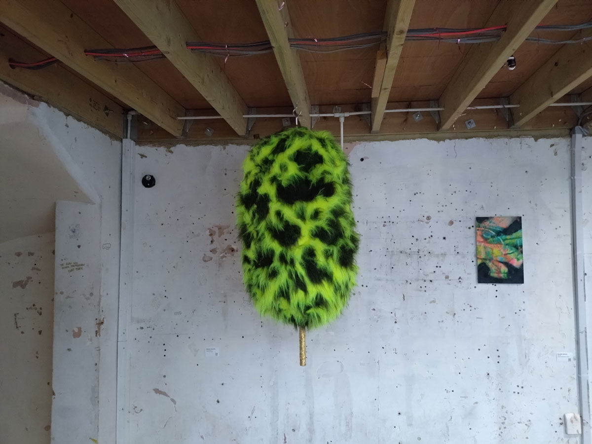 Do like this show, do like the mix, the balance, nothing is collapsing here, do like the seriousness, the serious playfulness, the darkness of (some of) the paint, the fun (and more) of the fluff, do really like that fish and that bird at the top of the ladder there, and yes, I admit it, I failed to check the label on that fish with the feather inside – We are always within a bigger story than we realise… – it is actually the work of Nagasiddhi, as is the bed hanging downstairs.