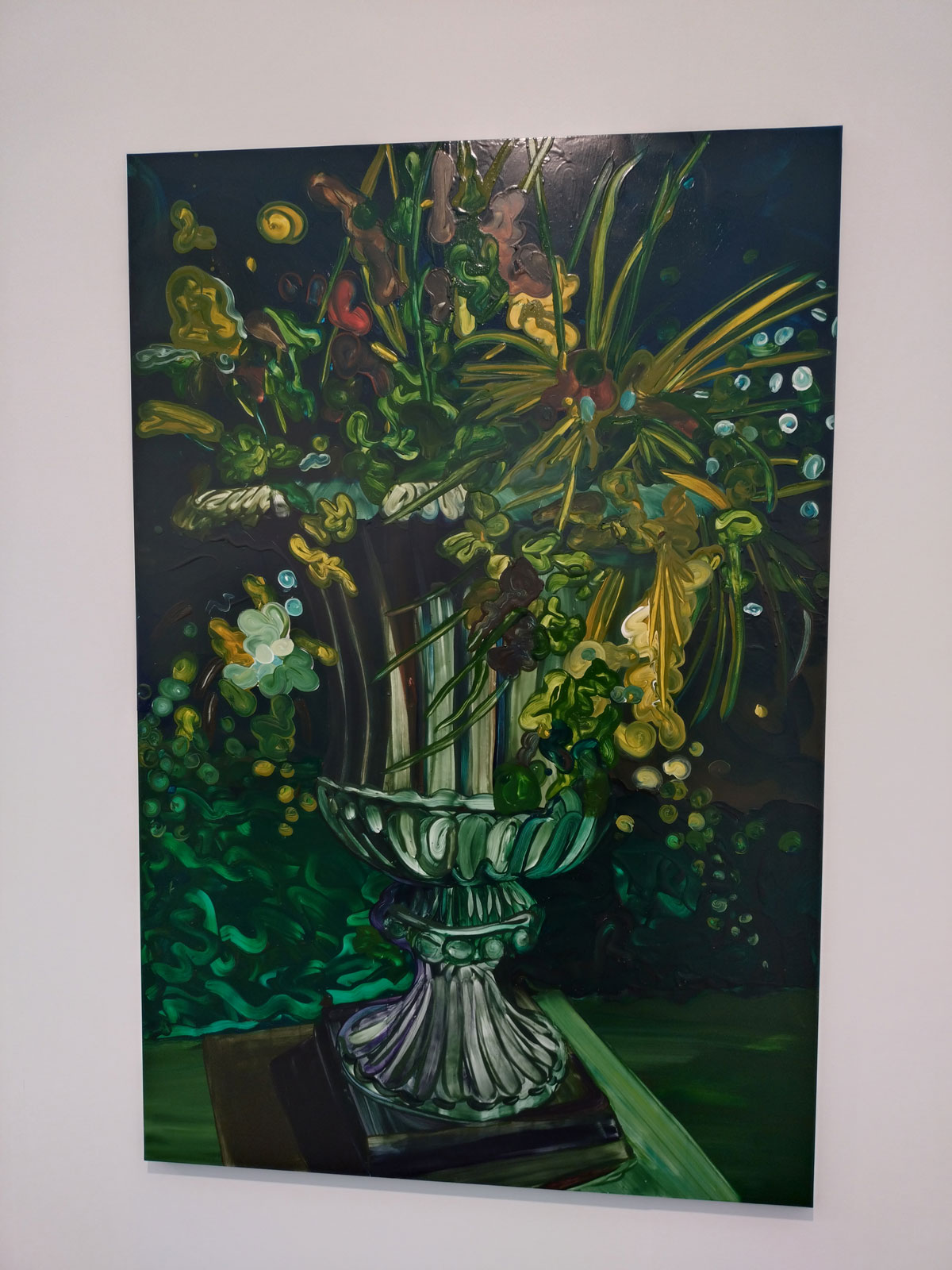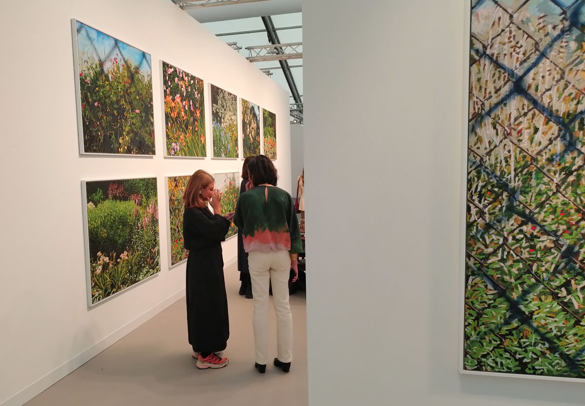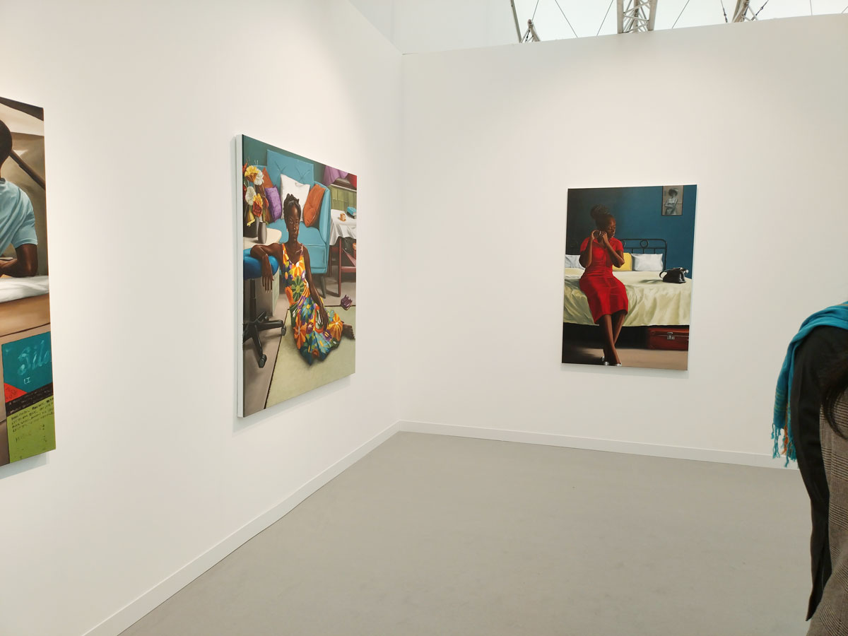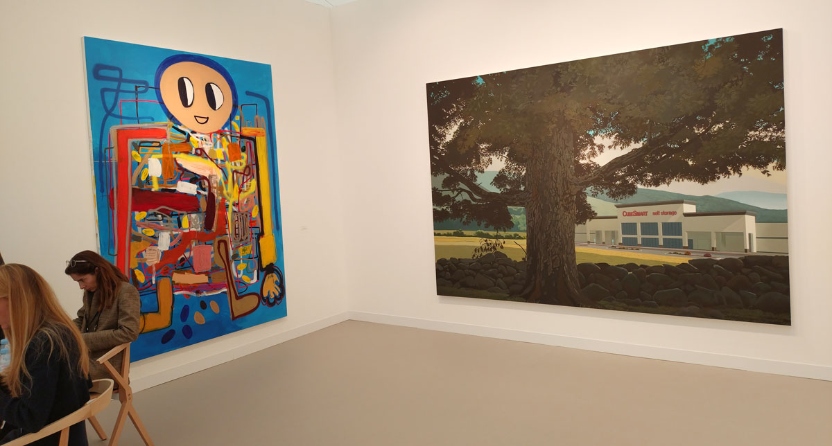 Hang on, we’ve entered the blue zone, we’ve made it up the river to the Kadel Willborn Gallery from Duseldorf and now we’ve made to The Approach booth, East London of course, and now we’re at the Stephen Friedman booth, the Stephen Friedman Gallery isn’t so immediate this year, not quite the noise of last year and Ugandan artist Leilah Babirye or the brilliant year before with Jeffrey Gibson’s glorious work or indeed the year before that with the highlight of 2021 that was Deborah Roberts, this year the gallery is not so loud and owning the place, instead we have paintings that, as you start to flag and you’ve seen hundreds of paintings already, just quietly say yes and invite you to take a little time with them. Two artists, Caroline Walker and Clare Woods, two artists and a presentation that cleverly explores how the two of them take on the role of observer in their work – new paintings by the two British artists – delicious greens, there’s depth in those greens of clare woods