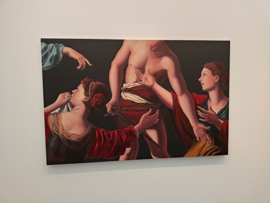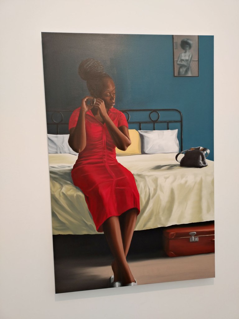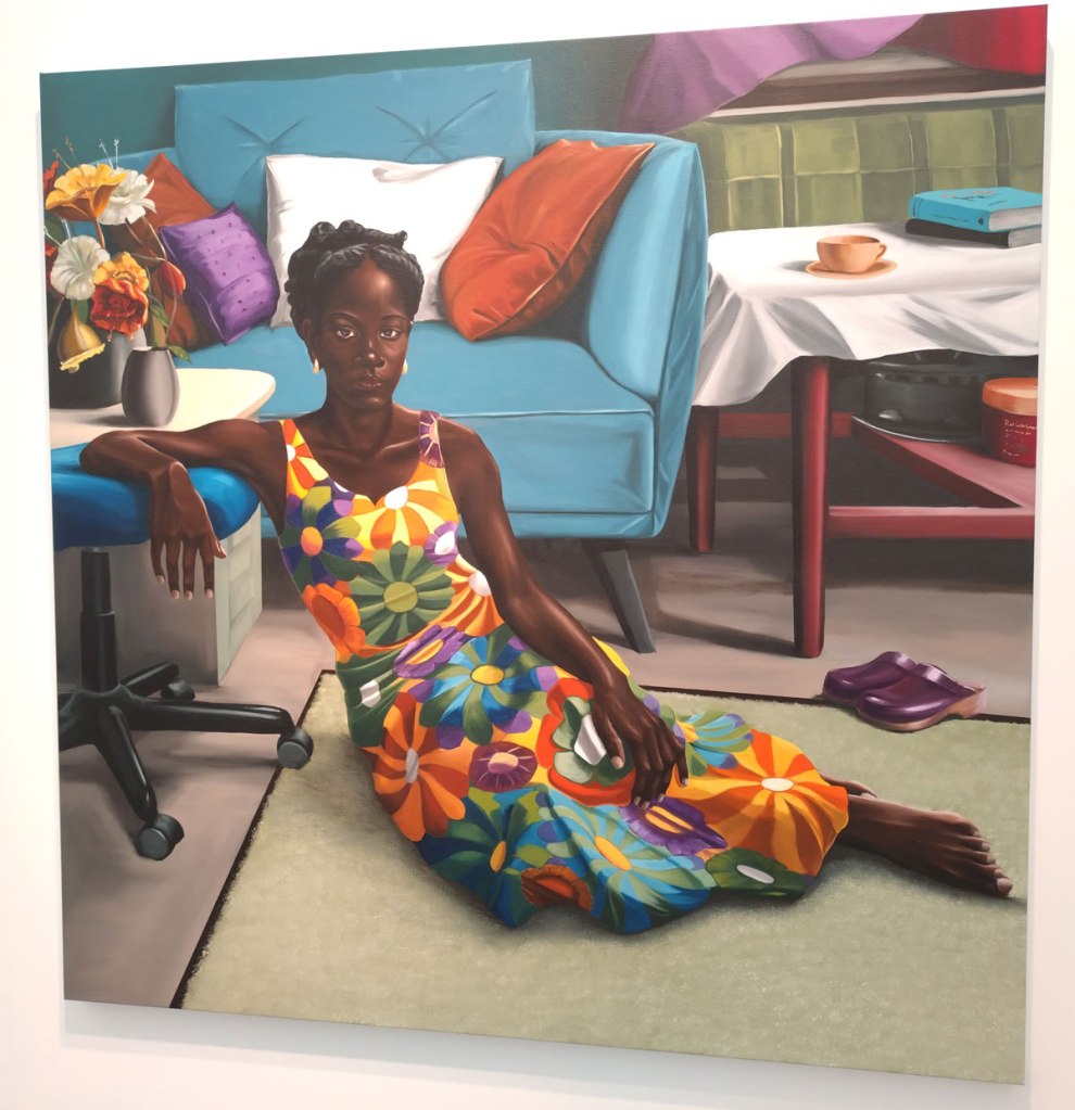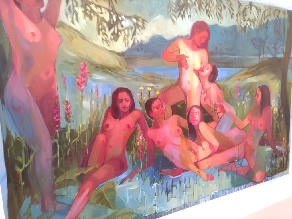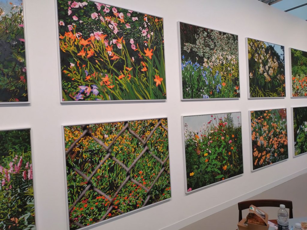 Hang on, we’ve entered the blue zone, we’ve made it up the river to the Kadel Willborn Gallery from Duseldorf and now we’ve made to The Approach booth, East London of course, and now we’re at the Stephen Friedman booth, the Stephen Friedman Gallery isn’t so immediate this year, not quite the noise of last year and Ugandan artist Leilah Babirye or the brilliant year before with Jeffrey Gibson’s glorious work or indeed the year before that with the highlight of 2021 that was Deborah Roberts, this year the gallery is not so loud and owning the place, instead we have paintings that, as you start to flag and you’ve seen hundreds of paintings already, just quietly say yes and invite you to take a little time with them. Two artists, Caroline Walker and Clare Woods, two artists and a presentation that cleverly explores how the two of them take on the role of observer in their work – new paintings by the two British artists – delicious greens, there’s depth in those greens of clare woods