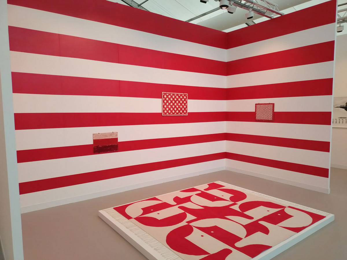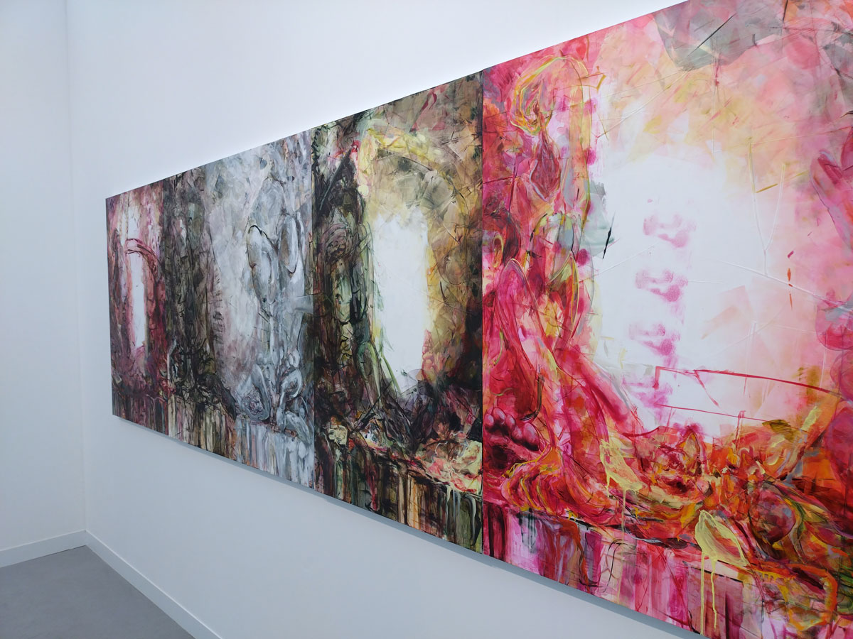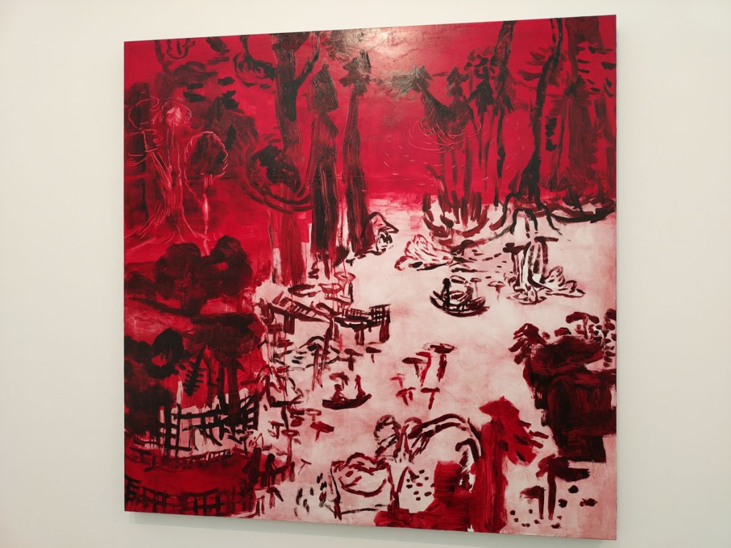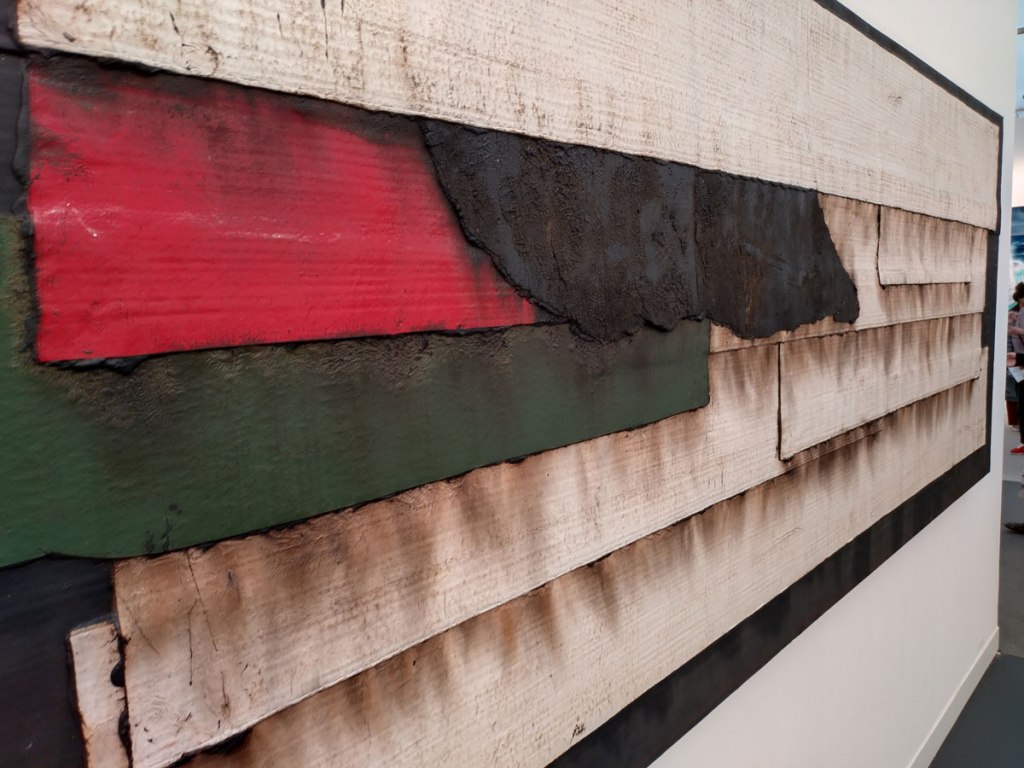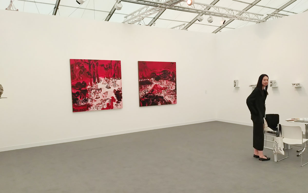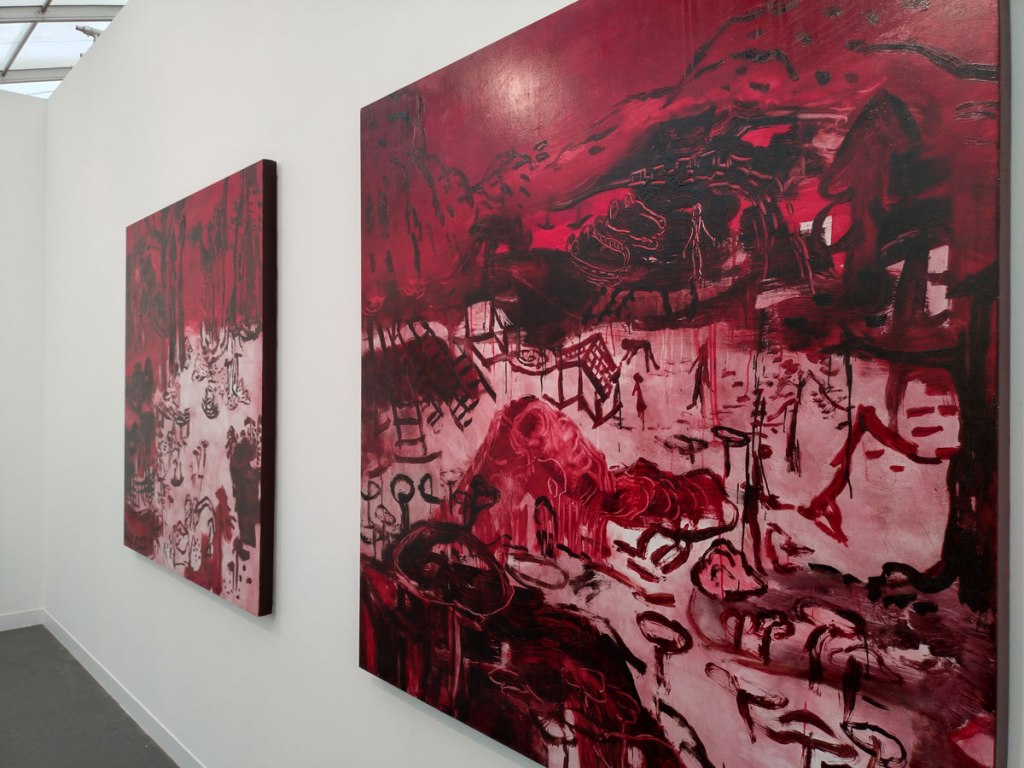 We’d just left Nour Jaouda and those wonderful layers of leaves that London gallery Union Pacific were showing, whern we took that break at the end of part one. I really had intended to keep it short this year but then in there in that vast vast space in amongst that art there are things that simply must be shared like those two gorgeous, no, not the right word, but that red is gorgeous, over there, so easy to walk past them, there’s these there’s these two really powerful Chang Ling paintings, definitely a pair, side by side, strong, just boldly there, in the middle of the big white wall that is Don Gallery‘s booth – a contemporary art gallery from Shanghai showcasing both emerging and established Chinese artists. Booth A04 if you need to know, if you’re going you’ll surely see them as you walk past, they do demand attention.