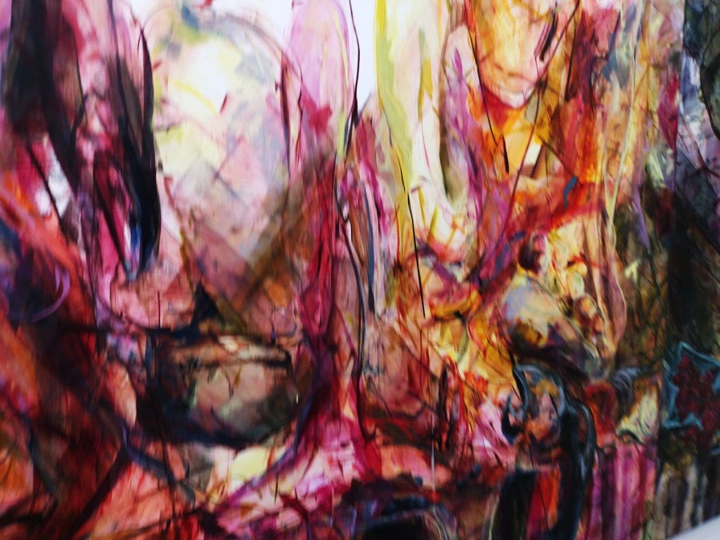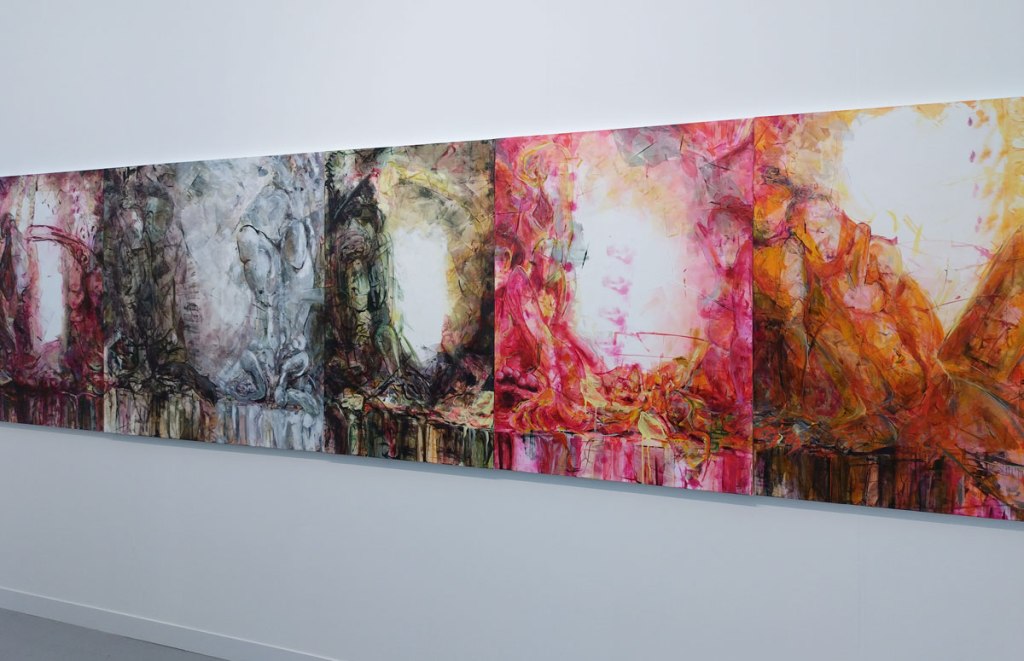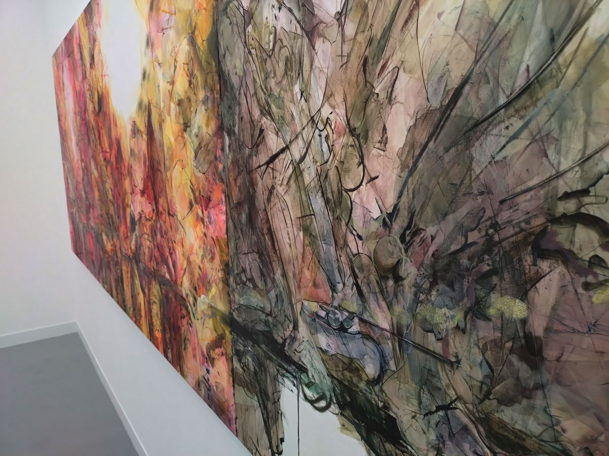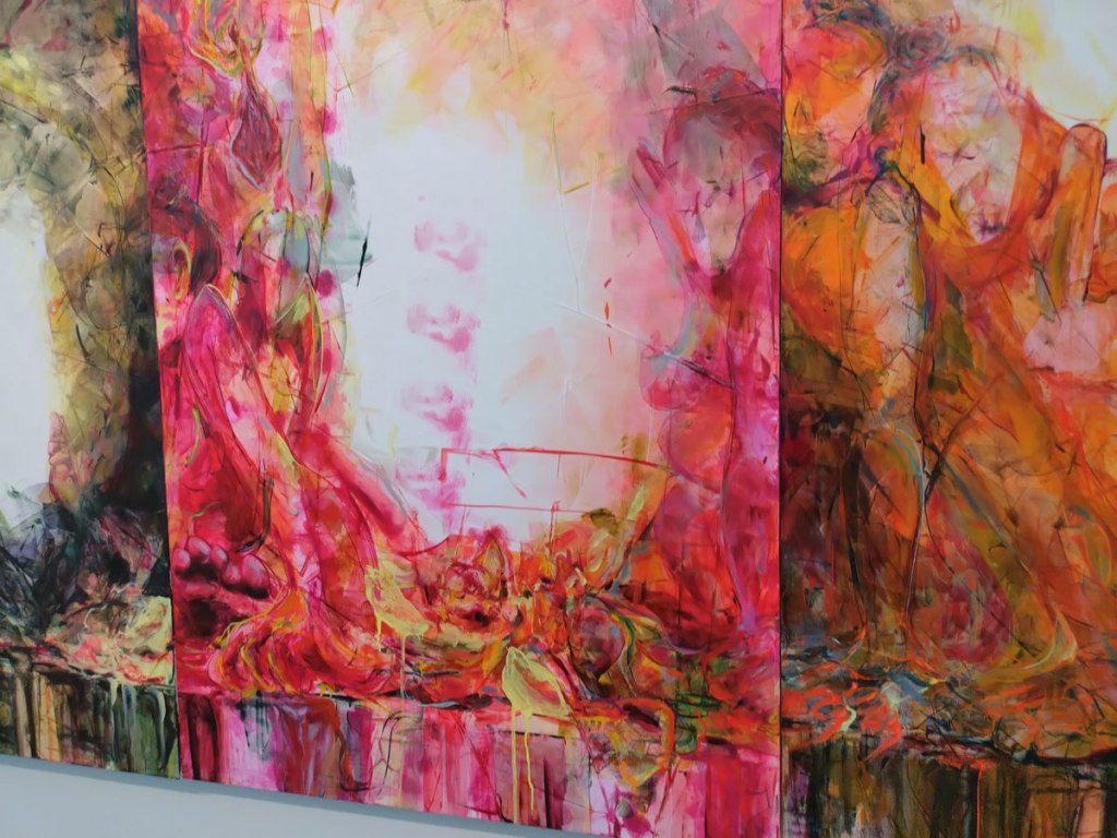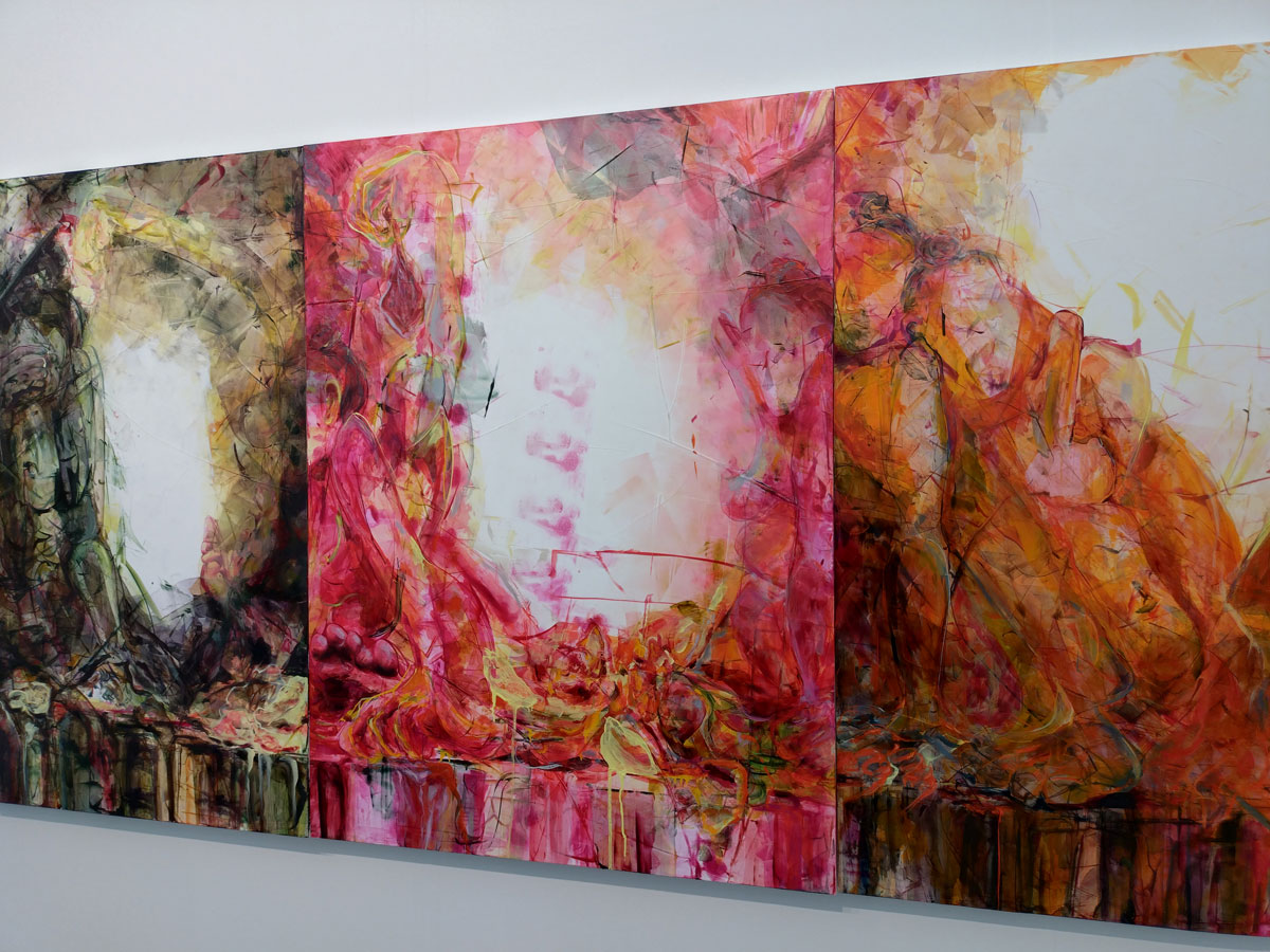 We’d just left Nour Jaouda and those wonderful layers of leaves that London gallery Union Pacific were showing, whern we took that break at the end of part one. I really had intended to keep it short this year but then in there in that vast vast space in amongst that art there are things that simply must be shared like those two gorgeous, no, not the right word, but that red is gorgeous, over there, so easy to walk past them, there’s these there’s these two really powerful Chang Ling paintings, definitely a pair, side by side, strong, just boldly there, in the middle of the big white wall that is Don Gallery‘s booth – a contemporary art gallery from Shanghai showcasing both emerging and established Chinese artists. Booth A04 if you need to know, if you’re going you’ll surely see them as you walk past, they do demand attention.