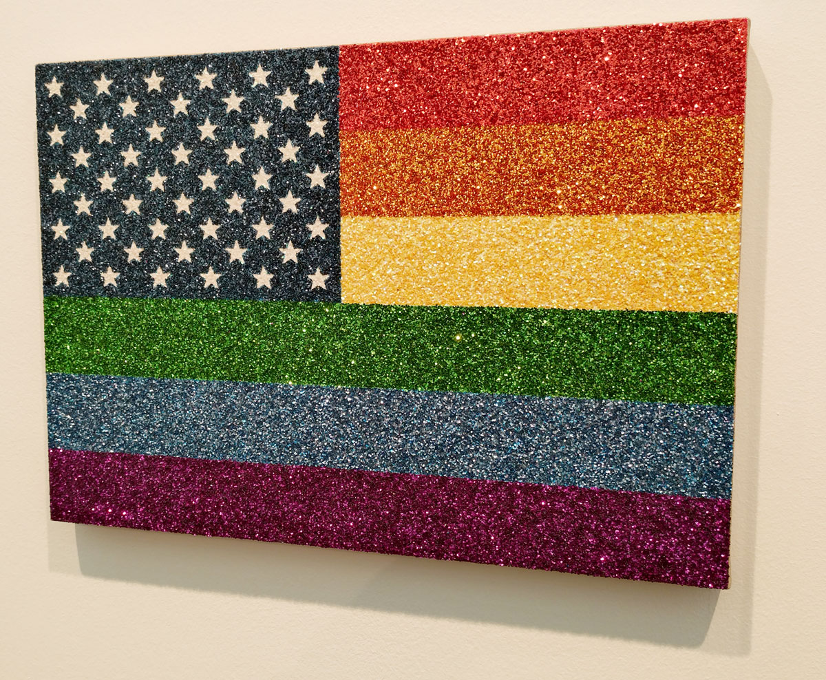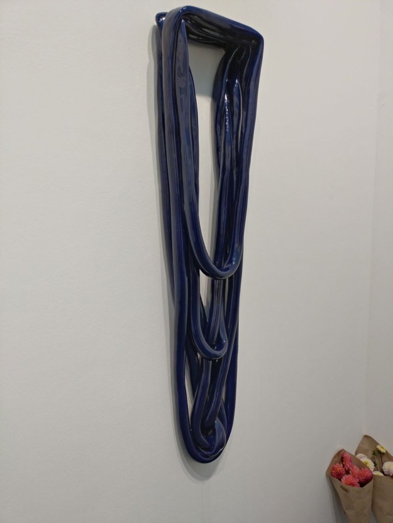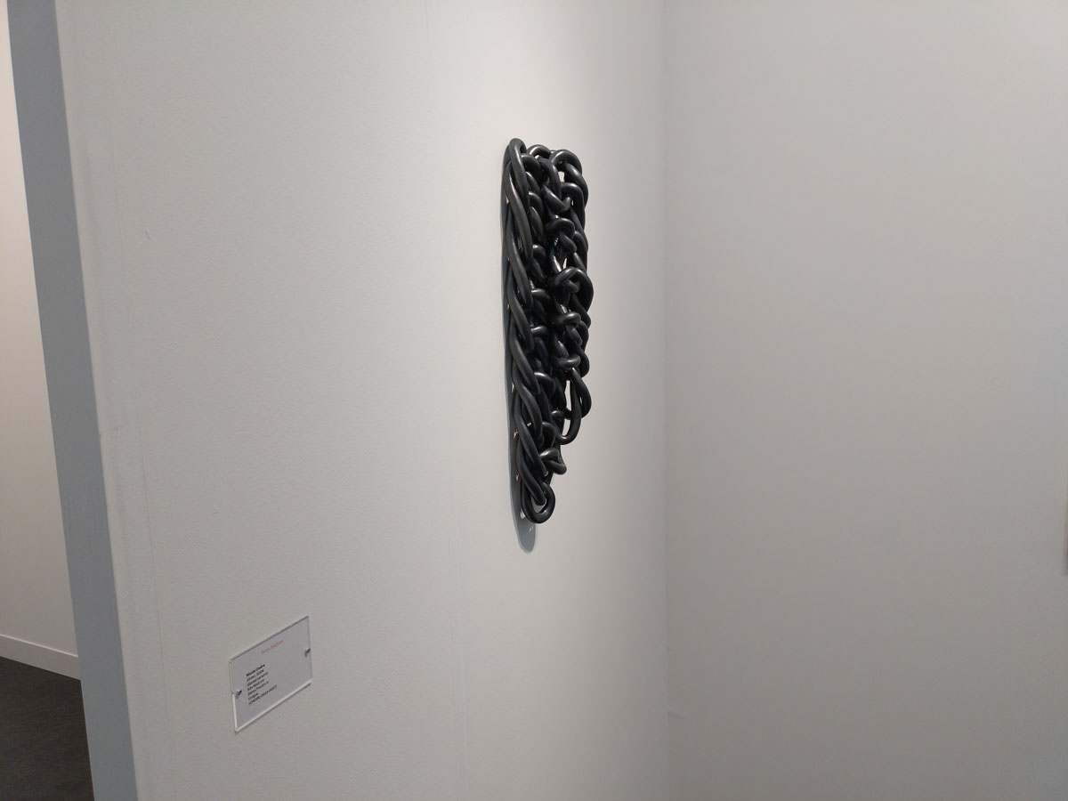 There’s some kind of plastic goose with a revolving head and well, um… and all the way from Glasgow? Really not sure why? Don’t really want to know why, don’t know, don’t care, Why would you come down from Scotland with a plastic looking goose with a revolving head? Was it a wager? No, don’t want to know. Kind of like the glazed ceramic chain from Canadian artist Nicole Ondra that Berlin’s Tanya Leighton gallery is showing, no, scarp, that, love her excellent pieces. There are some bizarre choices in here though, there’s some really not very good paintings, we are still cherry picking or sherry drinking or whatever it was we said we were doing. I mean, you expect a very high standard at what is supposed to be one of the world’s leading art fairs, you expect pretty much everything to just be up that notch from what you see on any given week of the year, it isn’t though, it really isn’t, some of it really is bad, very bad. Xavier Hufkens Gallery from Brussels have brought a glittery stars and stripes piece, a piece of pop art that makes for a smile for fifteen seconds of something or other, a “Rainbow American Flag” by New York-based Jonathan Horowitz and then we get to that beautiful black abyss that stops me in my tracks fror what seems like ages…