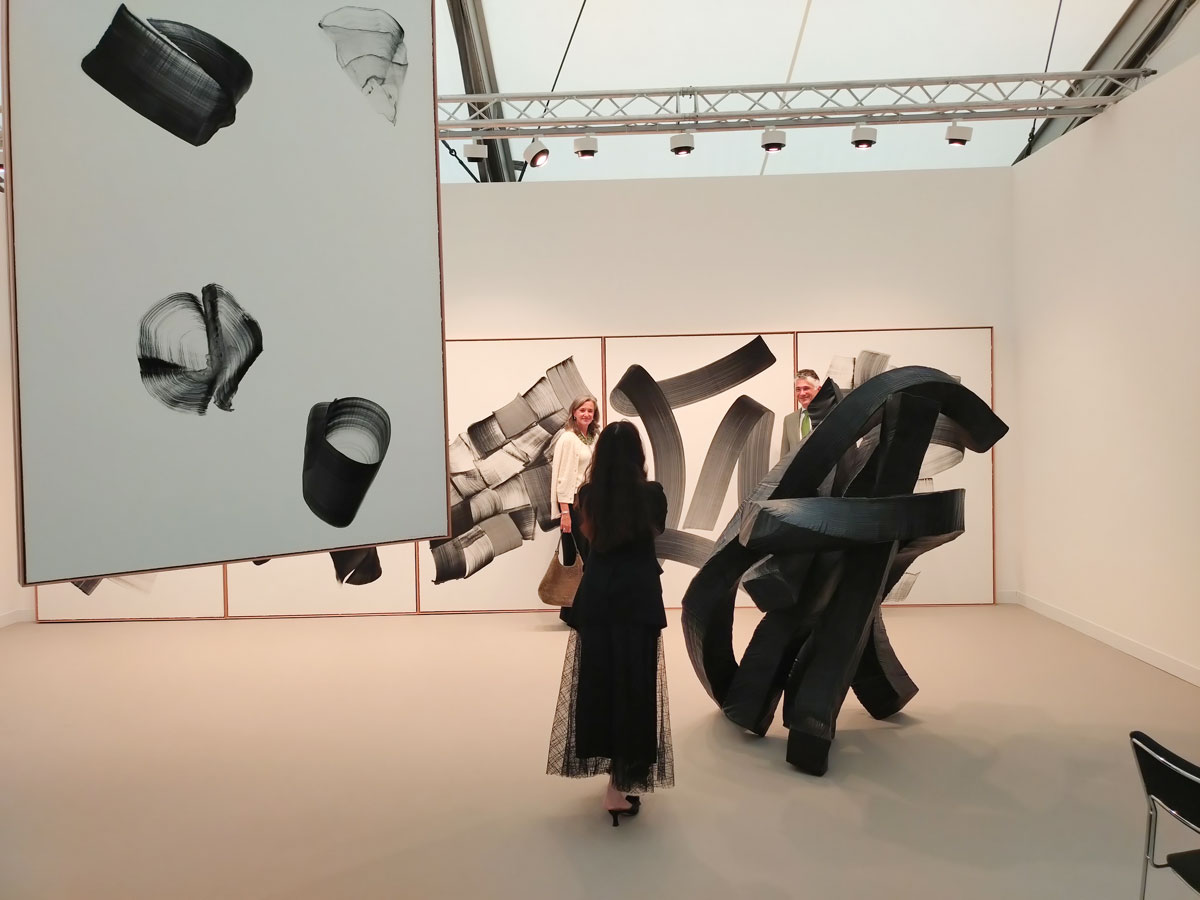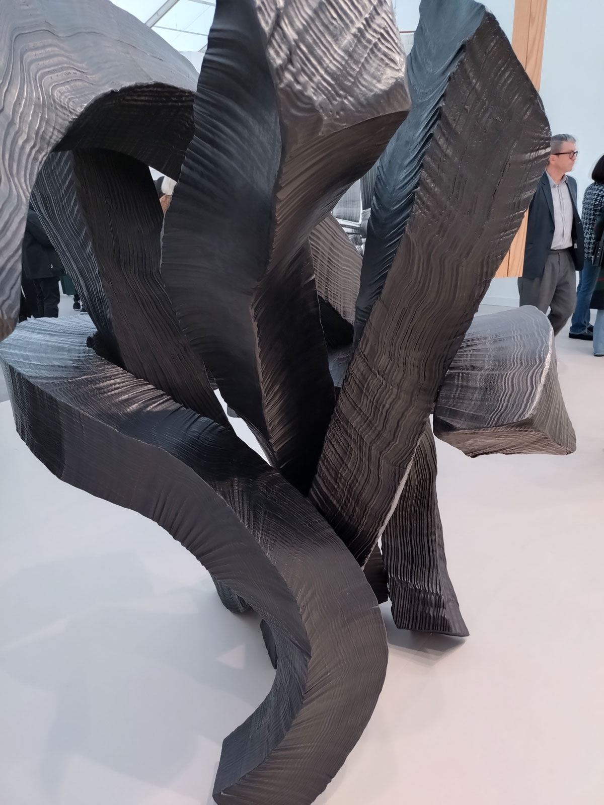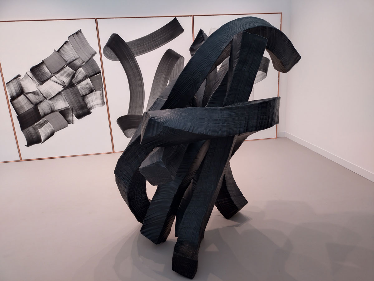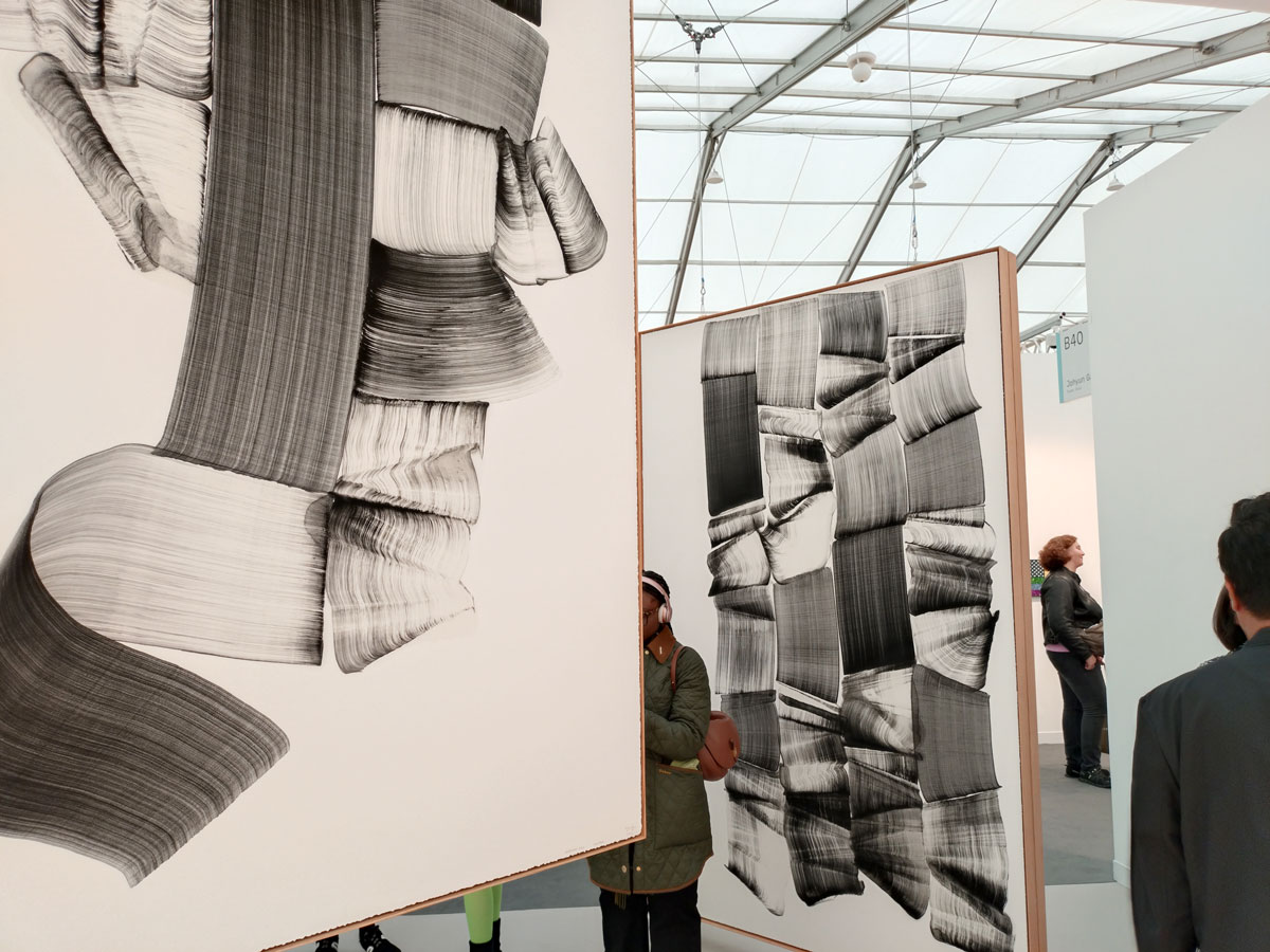 Lee Bae and that very (very) black wooden sculpture that you so want to touch, that giant wooden piece that’s actually a bronze and his pulling us into the abysses of that blackness as you walk around it again and again, his different ways of exploring the same subject that Johyun Gallery from Busan, Seoul are showing at Frieze this year. The big big sculpture, big in so many ways, that Brushstroke Sculpture (a bronze edition of three) that you just want to spend the whole day with, his blurred lines somewhere between very big drawings, painting, charcoal, those panels that play some kind of support act to that sculpture and turn the whole booth into what really is a powerfully rewarding installation… “Based in Seoul and Paris, Lee Bae focuses on the expressive potential of charcoal as a medium”, he really has won Frieze, he’s also got some work in Frieze Masters we are later to discover – okay no, no one won, art is not a vote or an award or a competition, Lee Bae’s work excited me most this year though, art was the winner and I could have stood looking at that black charcoal bronze for hours and hours (and hours), I walked around it again and again, it was jsut wonderful, thank you Lee. Actually I did thank him at the time, he just smiled, neither of us has to say too much more, we both smiled…
