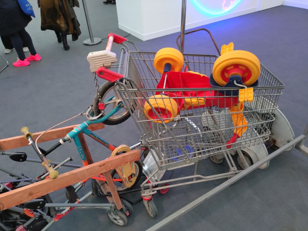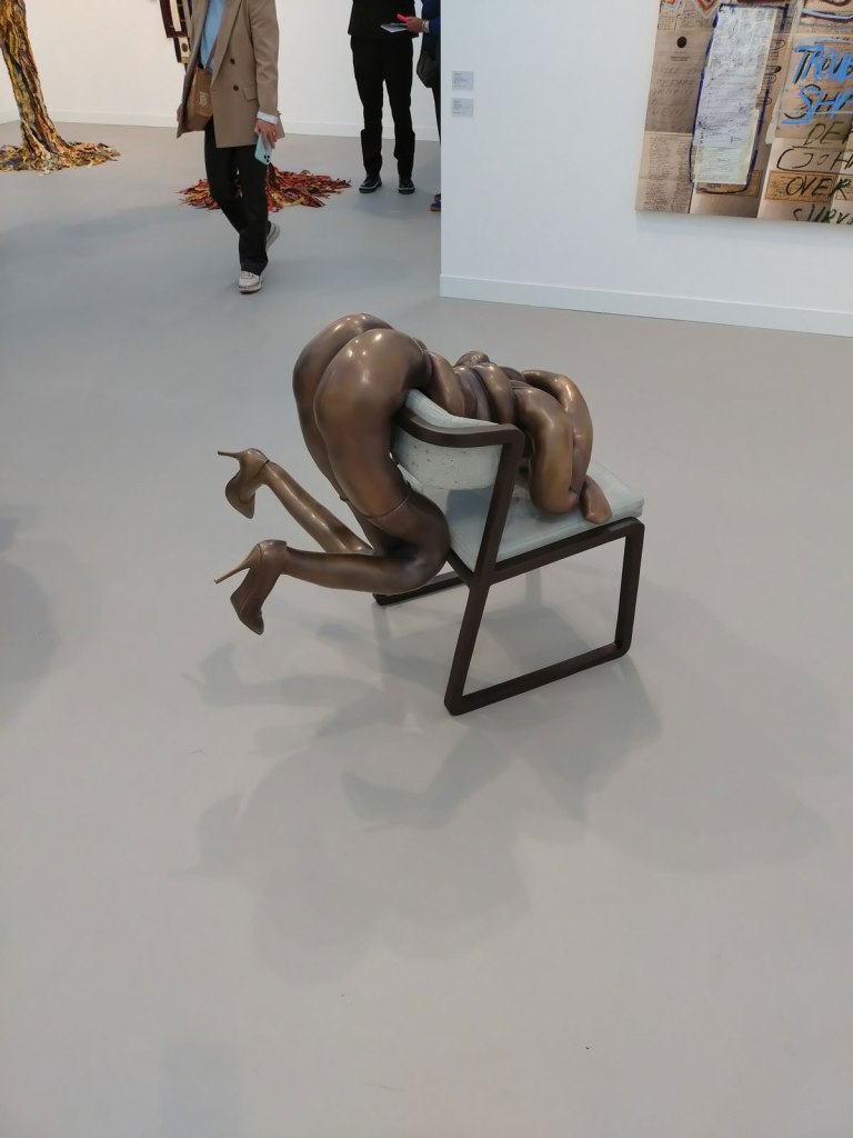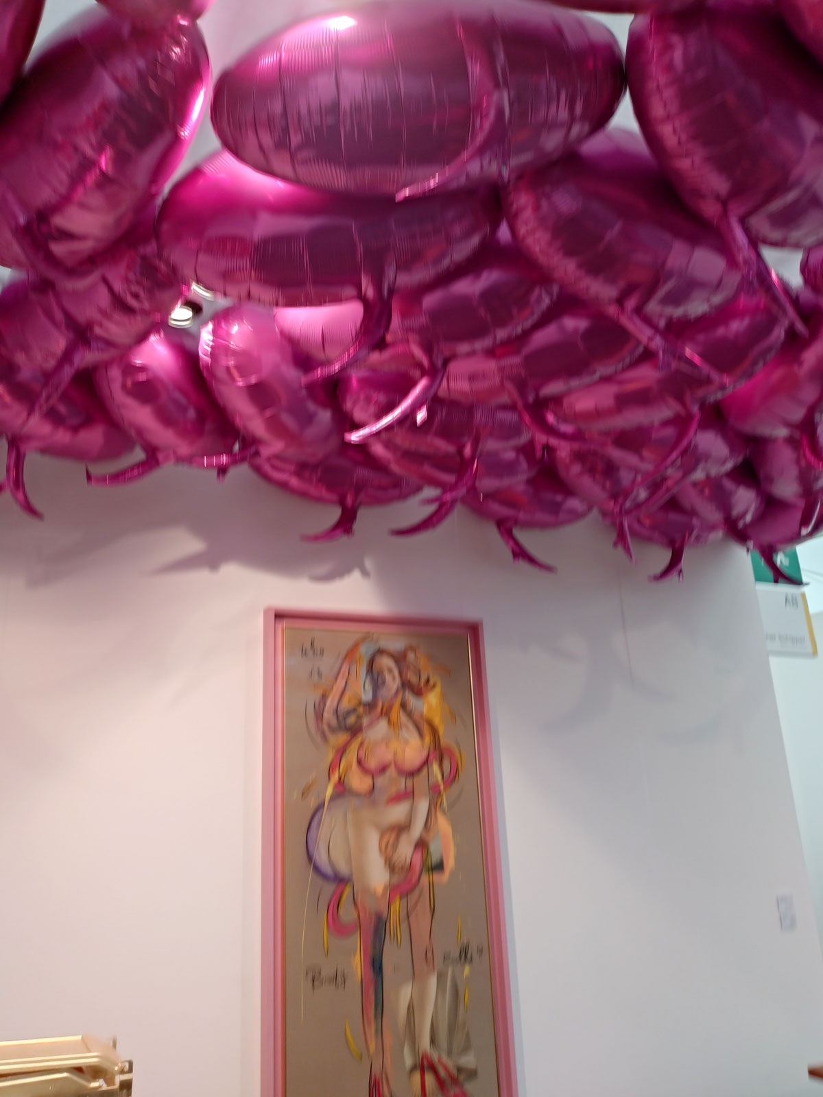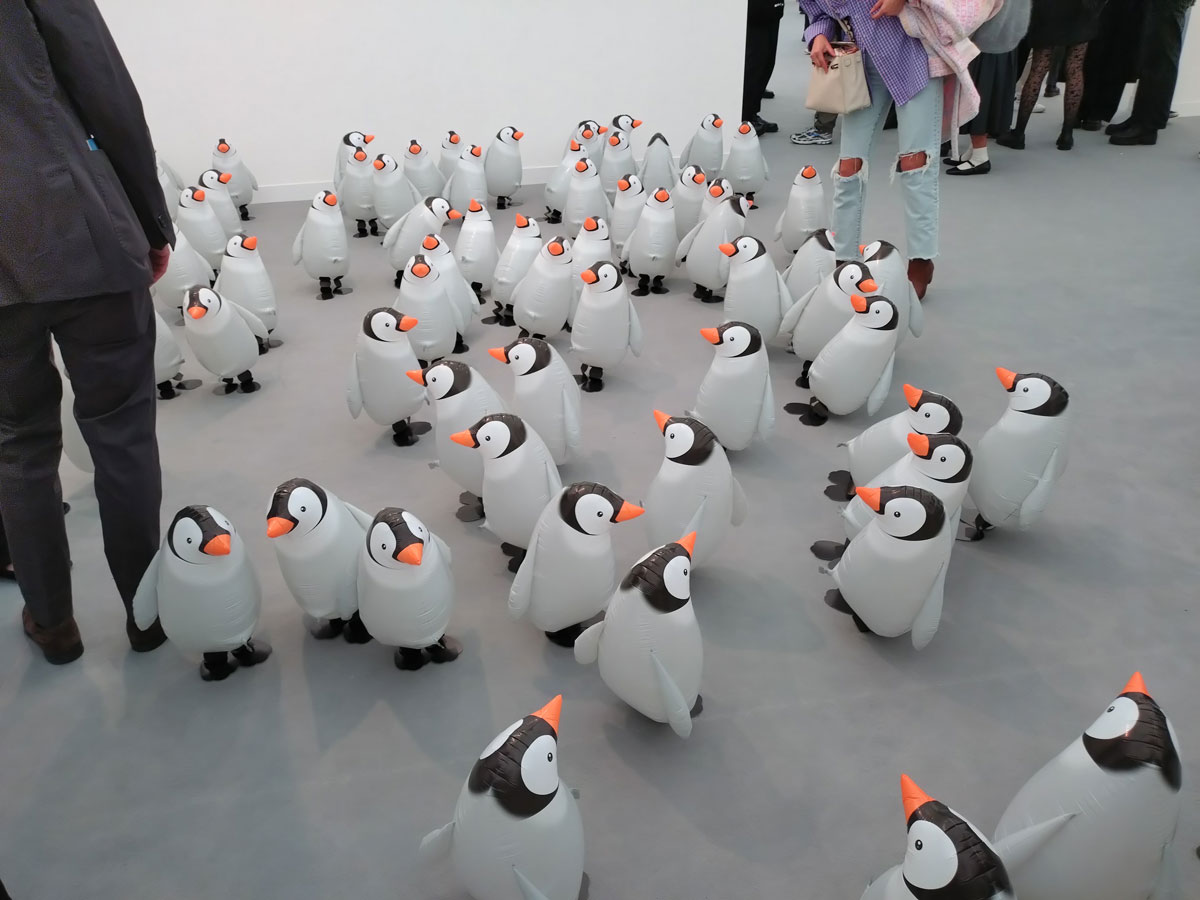There’s nothing anywhere near as radical as the big feminist focus section we had in 2017, what happened to all that? Was it too much of a distraction for the galleries who have paid so much to be in here? Was thunder stolen? And inflatable penguins? Why?! All the way from Copenhagen with nothing but a big gang of inflatable penguins? Why? The shear fuckoffery of it all? The charge, the bolt, the buzz, not the money, the Attention? Something to do with Sack Trick? Well they are big in Denmark and they were saying goodbye to Robin today – in a leopardskin coloures herse, now that’s art!