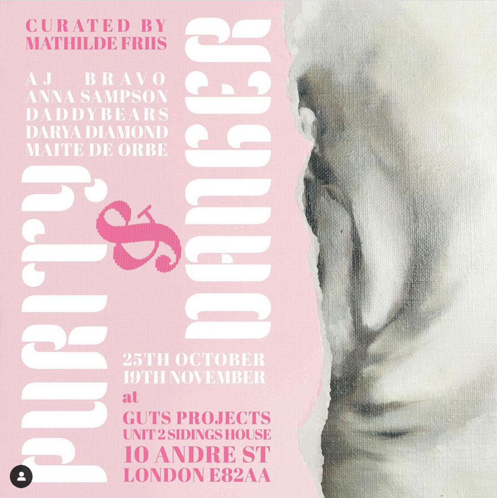1: Purity & Danger, a group show curated by Mathilde Friis at Guts Gallery – 25th October – 19 November 2024, actually this show is billed as being at Guts Projects, I’m guessing that’s a side room to the gatekeeper’s main gallery where there’s another show (Lily Bunney with ‘girls peeing on cars’). We mostly want to see more of AJ Bravo’s paint in the flesh, we’ll no doubt explore the other show at the same time – “The title draws inspiration from anthropologist Mary Douglas’ 1966 theory, which examines how societies construct ideas of purity and impurity by distinguishing between the clean and the dirty, the sacred and the profane, the pure and the dangerous. The selection of works explore the intimate relationship between art and sex, reimagining purity and danger by embracing fluidity, sensuality and excess as powerful expressions of the human experience” which is all well and good, more importantly there’s a rather good looking line up of artists: AJ Bravo, Anna Sampson, Daddybears, Darya Diamond, Maite de Orbe. Curated by Mathilde Friis