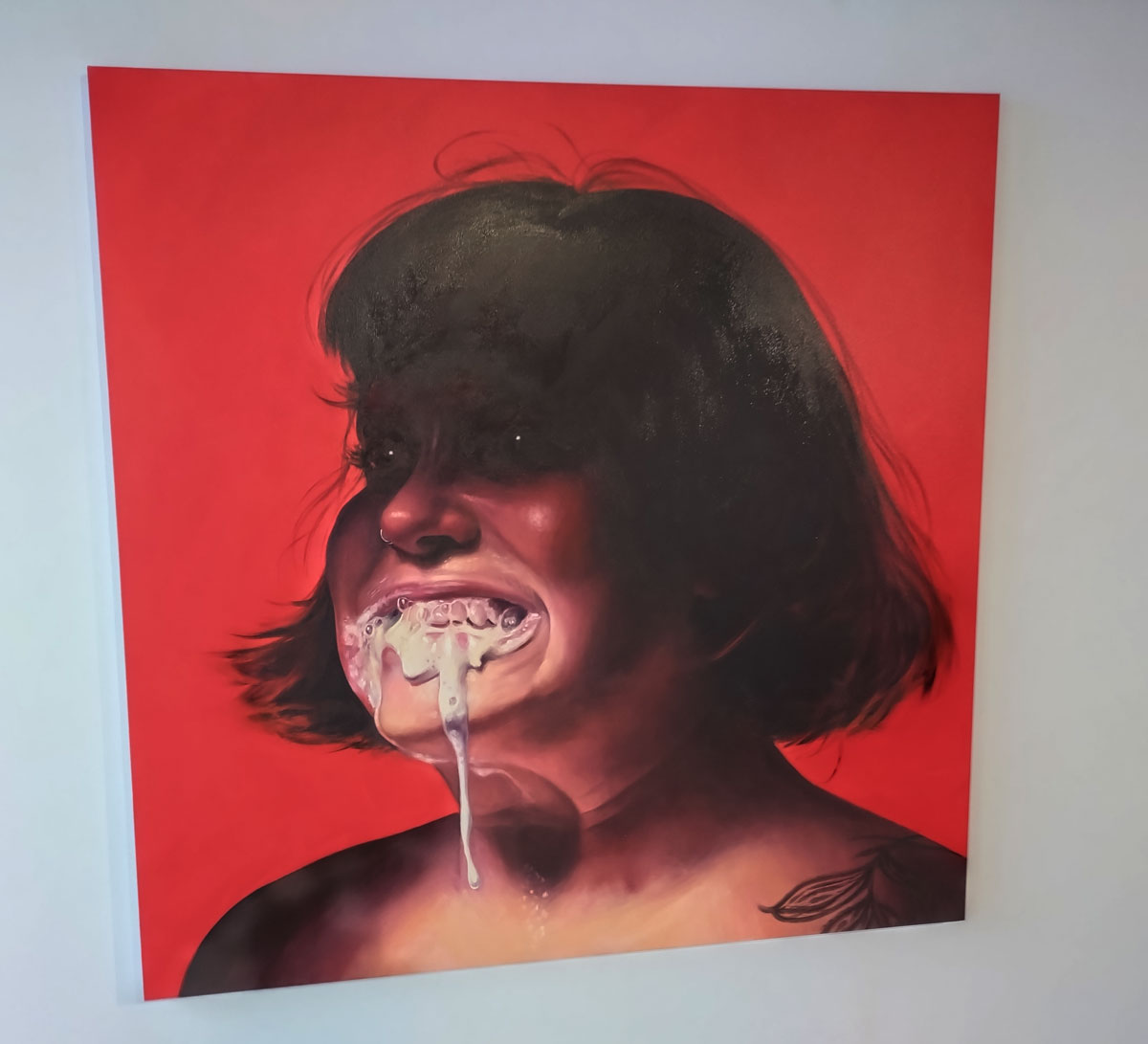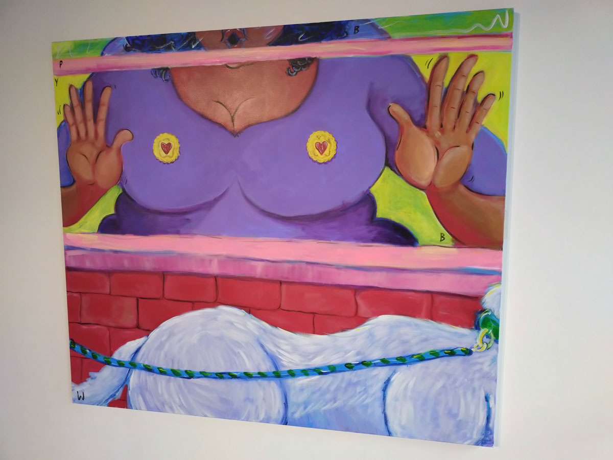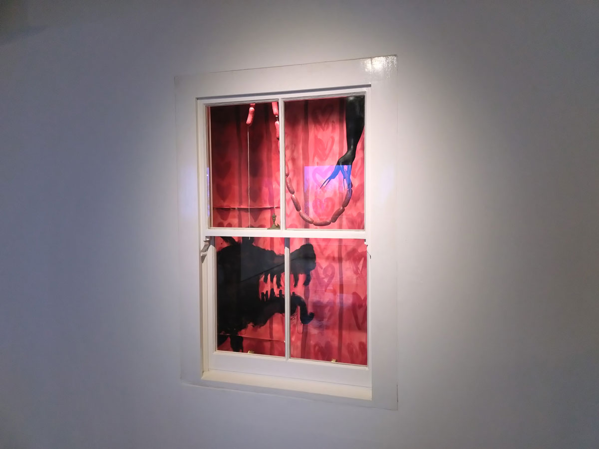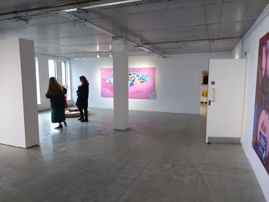 Off up the road, off to Guts again, our neighbours, the gallery that likes to celebrate itself up the street here in Hackney, fair to say we have our issues, they don’t like us much, the feeling is kind of mutual, let’s make this about the art though, did want to see the current show in their side room, the space they called Guts Projects, it is hard to avoid all the bulshit on the Guts website, let’s try, the reason for walking up the road the day after their latest opening, their openings are always full, the lighting isn’t the greatest, they are more about the event than the art which is fine but hey, if you do want to see the art then you’re better off waiting until the morning after the night before. The new show, curated by Mathilde Friis, last seen curating that excellent Working Girls show at Gallery 46, a show that, amongst other things introduced us to the excitement of AJ Bravo and her lush use of red paint, AJ is a London-based femme artist and scholar from Bilbao, Spain, her big bold red paintings were a highlight of that show at 46, walking in to the big room at that space without knowing a thing about her was genuinely exciting, since then she’s featured in one of our Cultivate Mixtape shows and yes, it was genuinely exciting to have a chance to go see more of her paint in the the flesh.