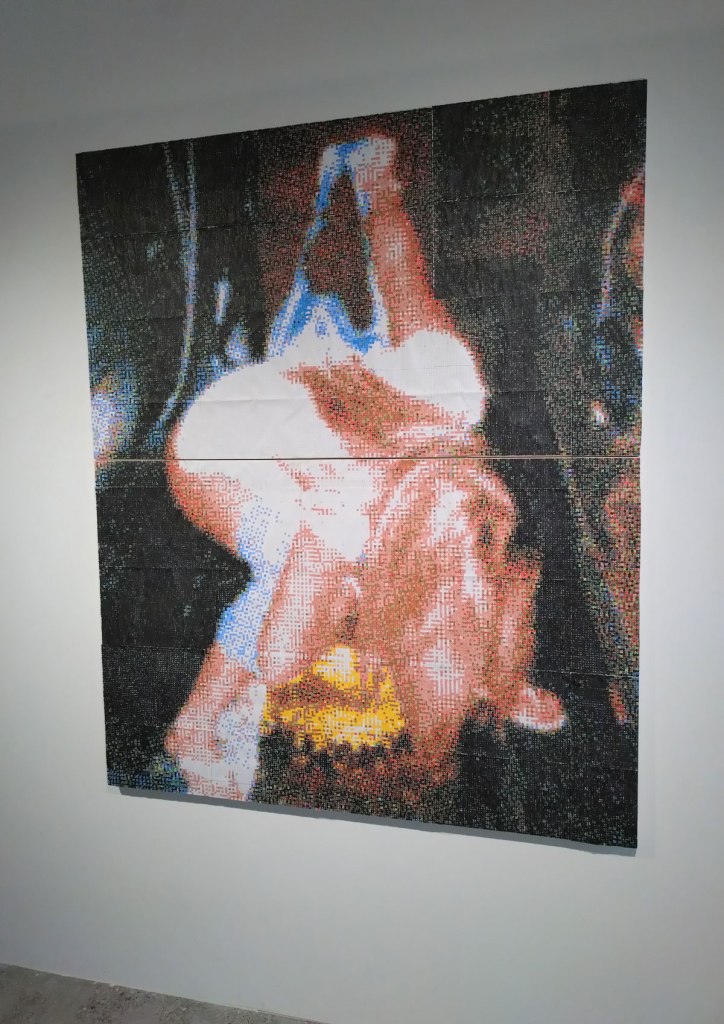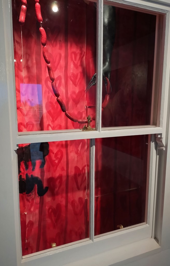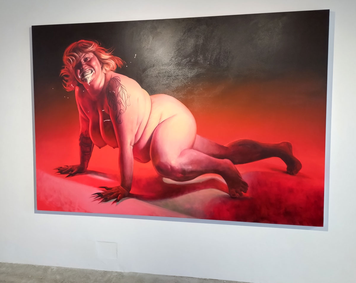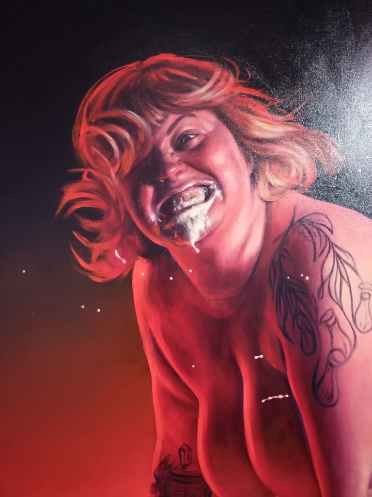“AJ Bravo, a painter and academic, explores the relationship between pornography and eroticism in their triptych Adoration (2024) and Red Quickies series (2023). Through research into aesthetics and philosophy, Bravo’s works bring the viewer into close proximity with sexual bodies and self-pleasure, directly bridging art with the pornographic medium, and through these experiences the repetitive act of the brushstroke becomes a sacred ritual for the painter”. It was the beauty of her paint that first attracted me, that lush lush red in the brilliant whiter than white of Gallery 46, the brush strokes themselves, I don’t know what that says about me? Paint as prone? Painting as the muse? The smaller AJ pieces in here are certainly paintings to adore, and yes they do stand out but then I am a painter, paint is my thing far more than other mediums may be, it is about her reds more than anything.