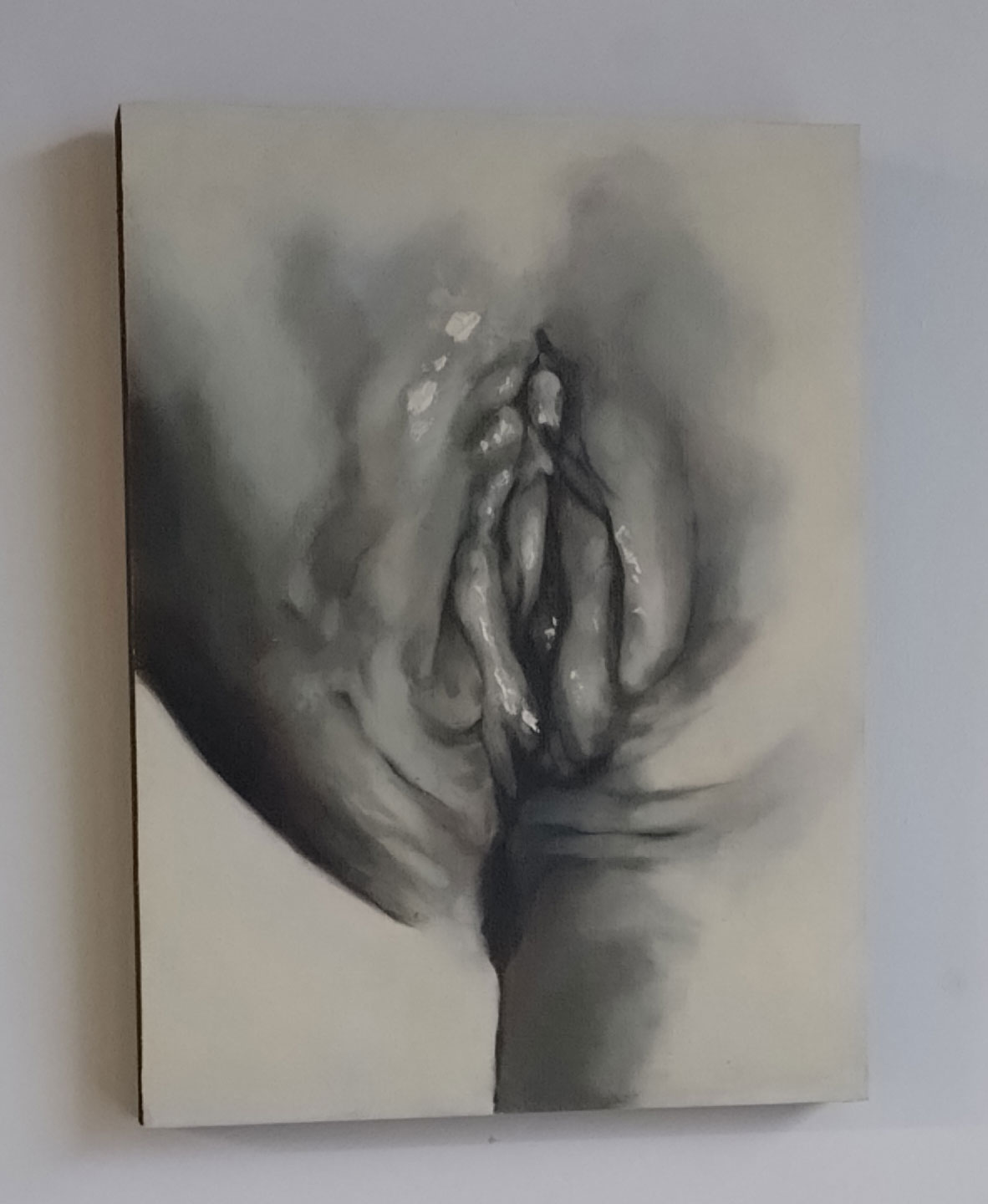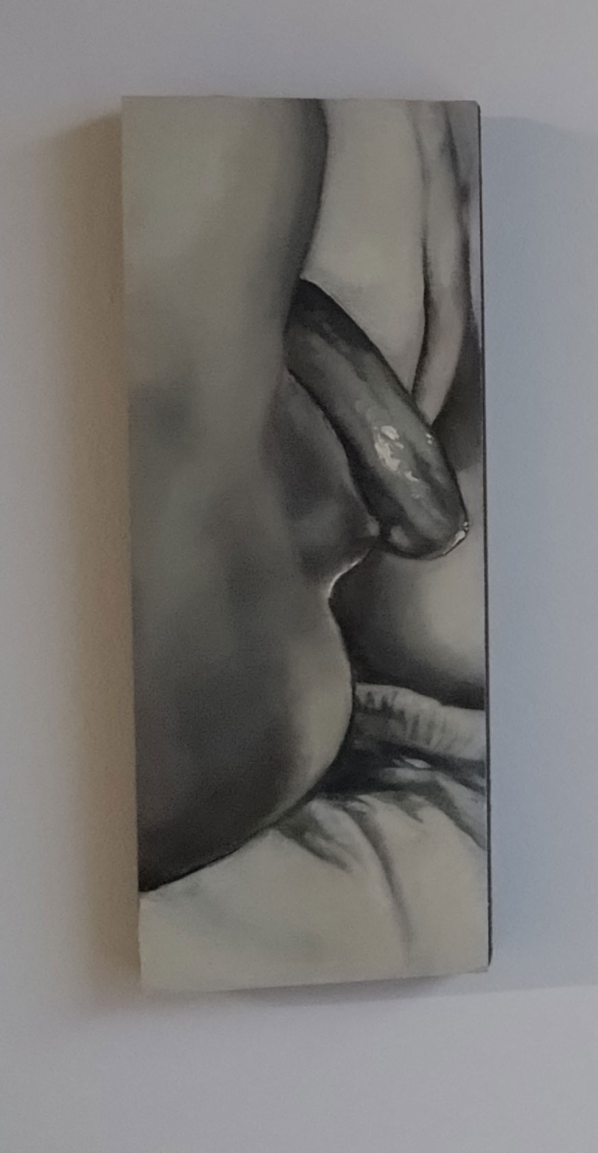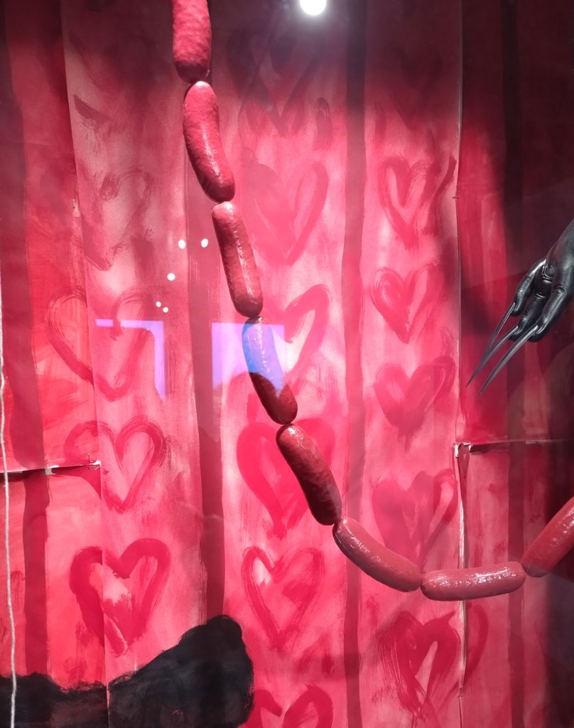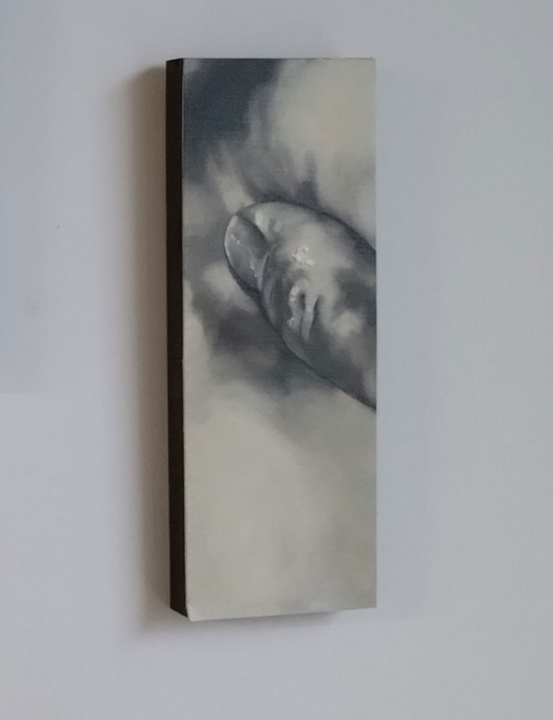“AJ Bravo, a painter and academic, explores the relationship between pornography and eroticism in their triptych Adoration (2024) and Red Quickies series (2023). Through research into aesthetics and philosophy, Bravo’s works bring the viewer into close proximity with sexual bodies and self-pleasure, directly bridging art with the pornographic medium, and through these experiences the repetitive act of the brushstroke becomes a sacred ritual for the painter”. It was the beauty of her paint that first attracted me, that lush lush red in the brilliant whiter than white of Gallery 46, the brush strokes themselves, I don’t know what that says about me? Paint as prone? Painting as the muse? The smaller AJ pieces in here are certainly paintings to adore, and yes they do stand out but then I am a painter, paint is my thing far more than other mediums may be, it is about her reds more than anything.
